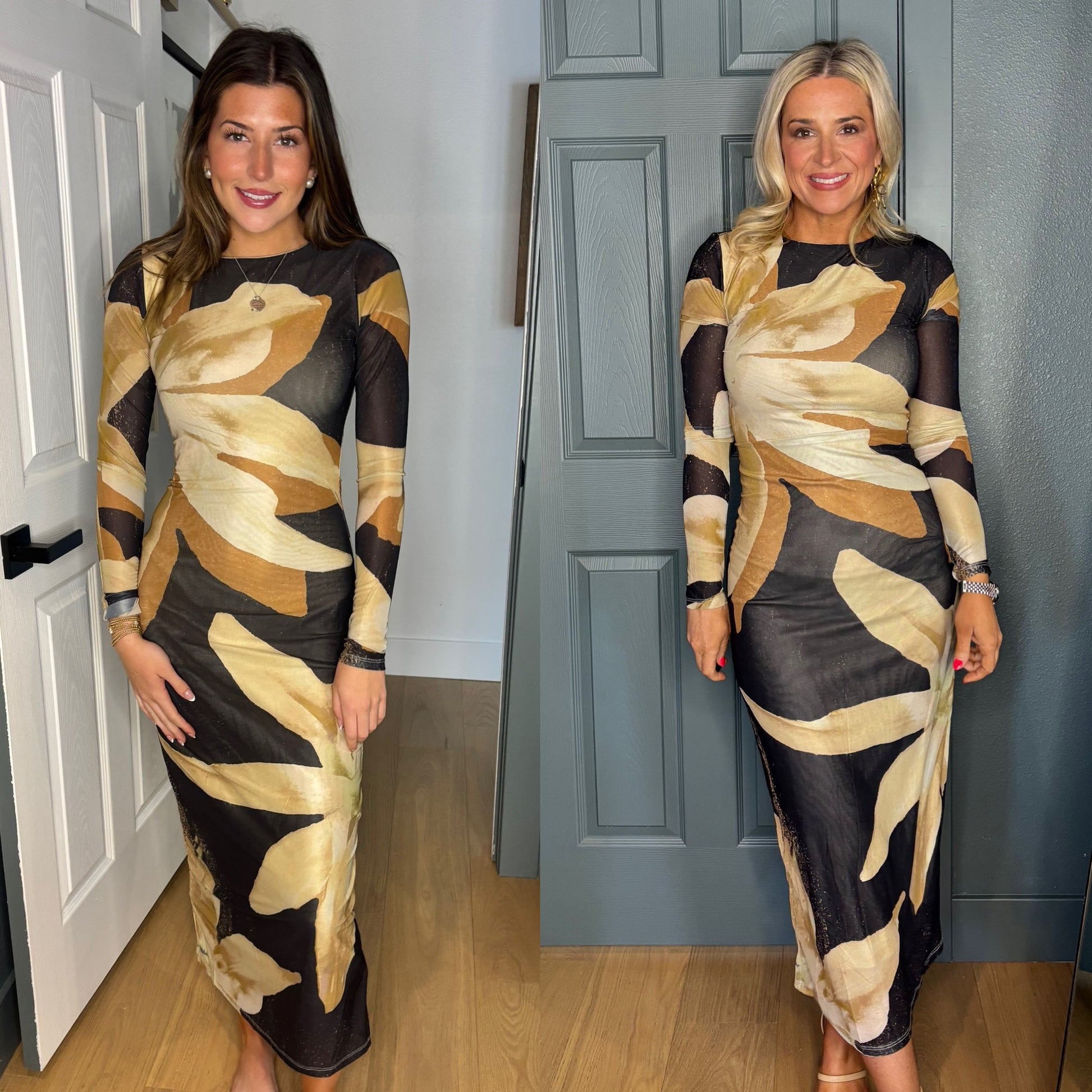 A printed power mesh midi dress featuring round neckline, long sleeve and back neck button closure