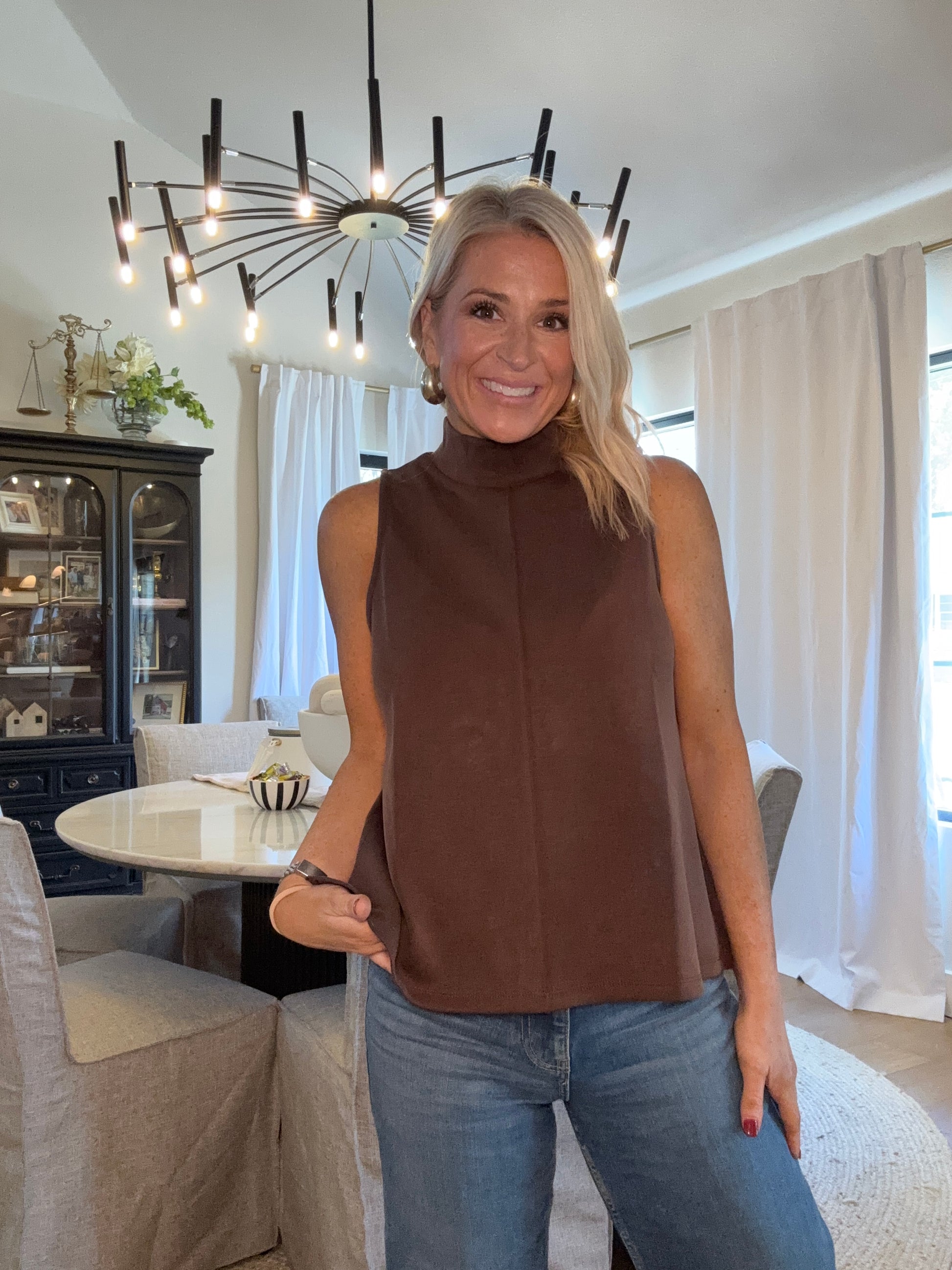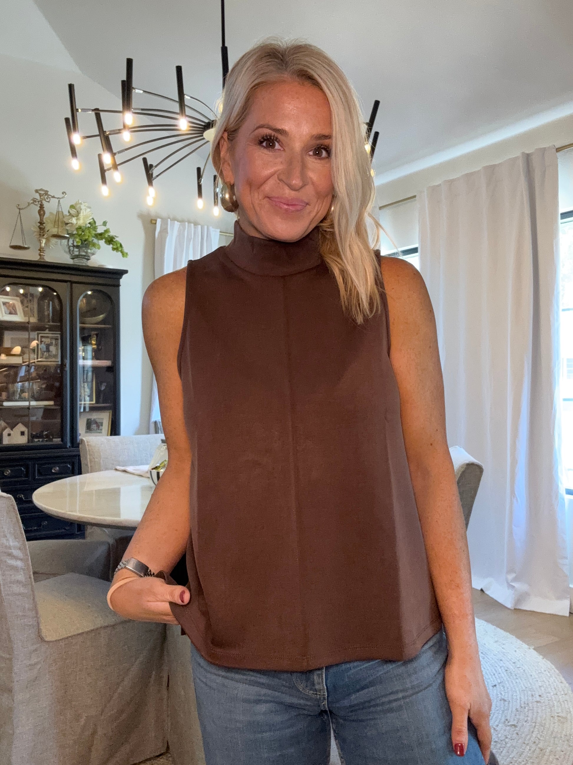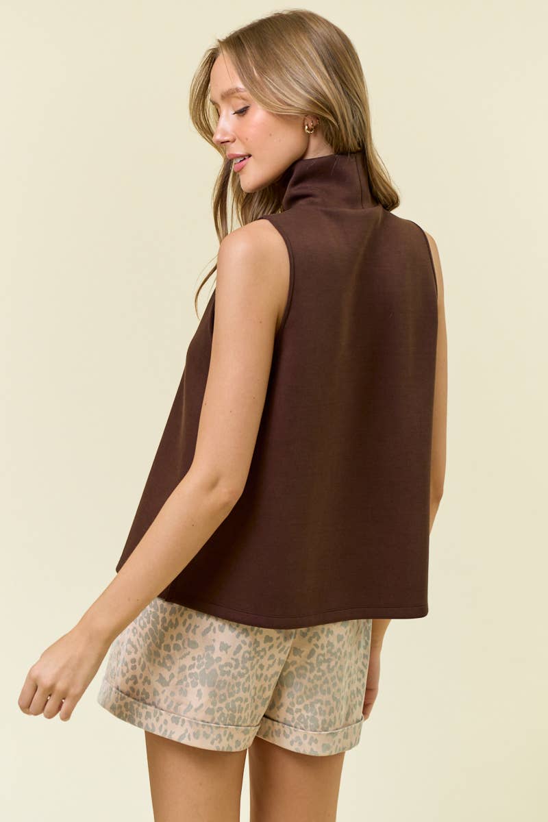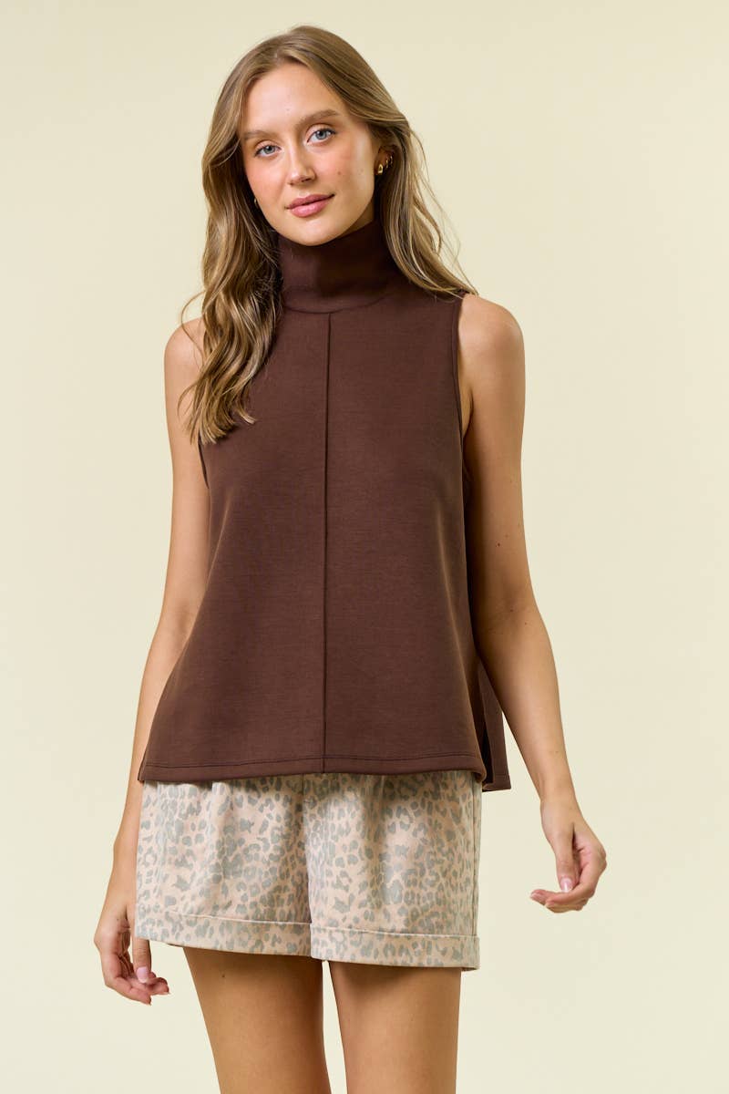 BUTTERY SOFT BRUSHED MODAL PINTUCK A LINE TANK - Luxuriously soft brushed modal fabric for ultimate comfort - Modern mock neck design with a relaxed, sleeveless fit - Pintuck detail at center front adds elevated, tailored style - Flattering A-line silhouette offers easy, flowy movement