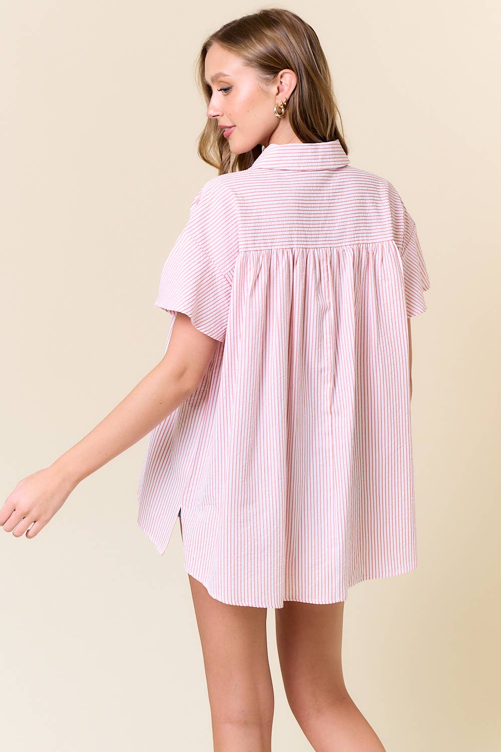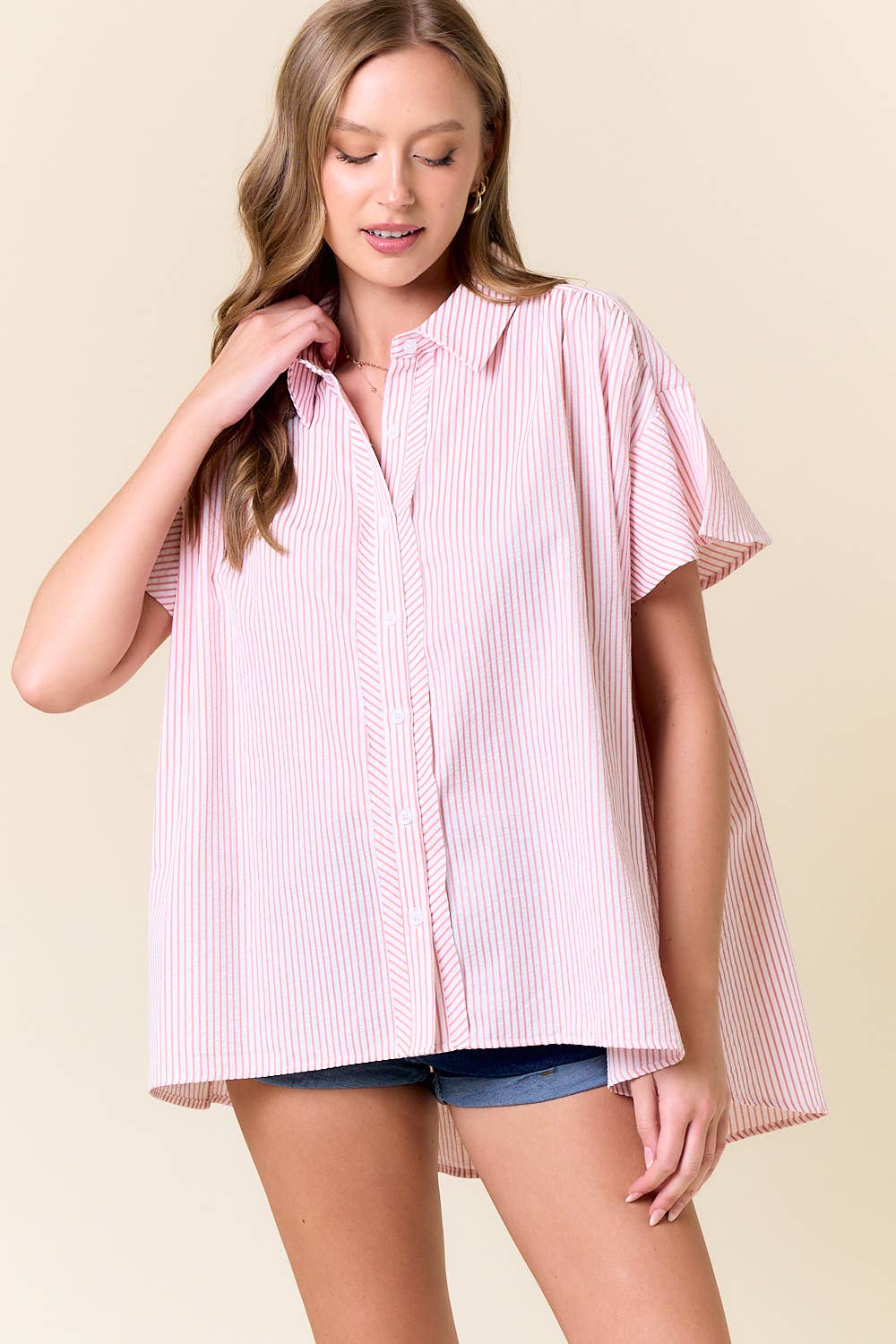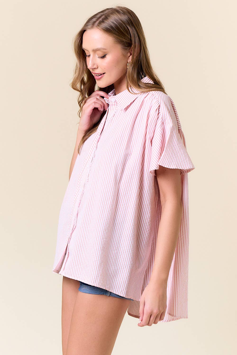 Stripe Collared Neck Front Button Down Short Sleeve Over-Sized Flowy Shirt - Oversized silhouette with a flowy, relaxed fit - Classic collar neckline - Short flutter sleeves - Front button-down closure