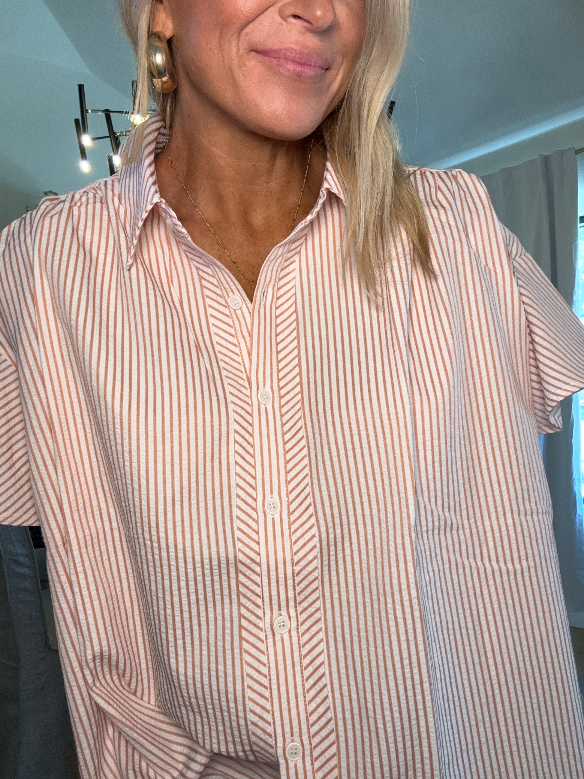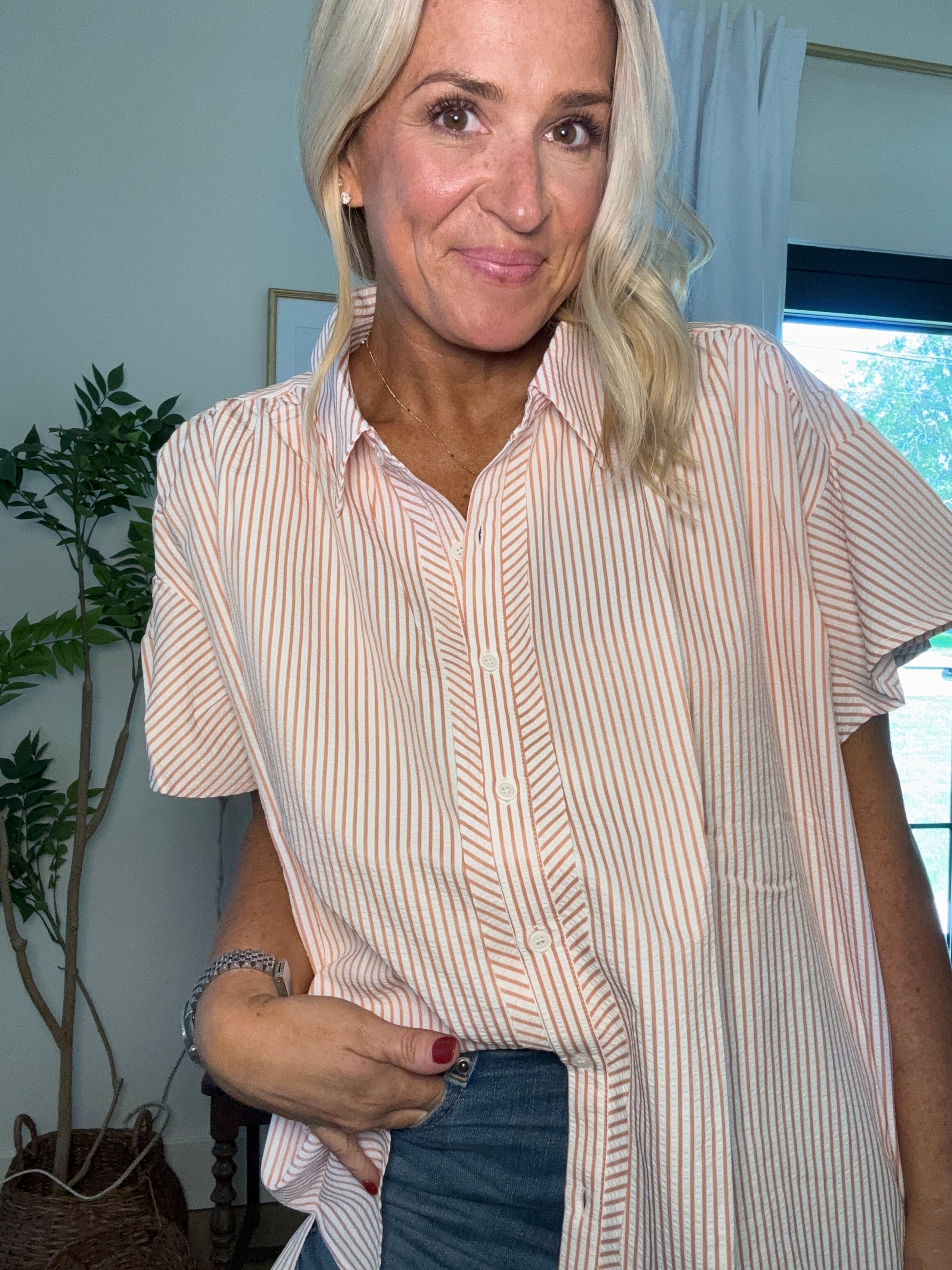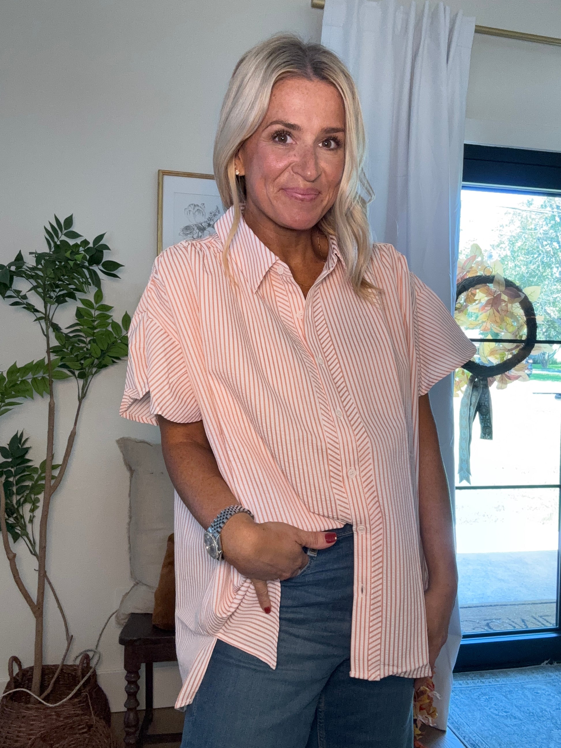 Stripe Collared Neck Front Button Down Short Sleeve Over-Sized Flowy Shirt - Oversized silhouette with a flowy, relaxed fit - Classic collar neckline - Short flutter sleeves - Front button-down closure