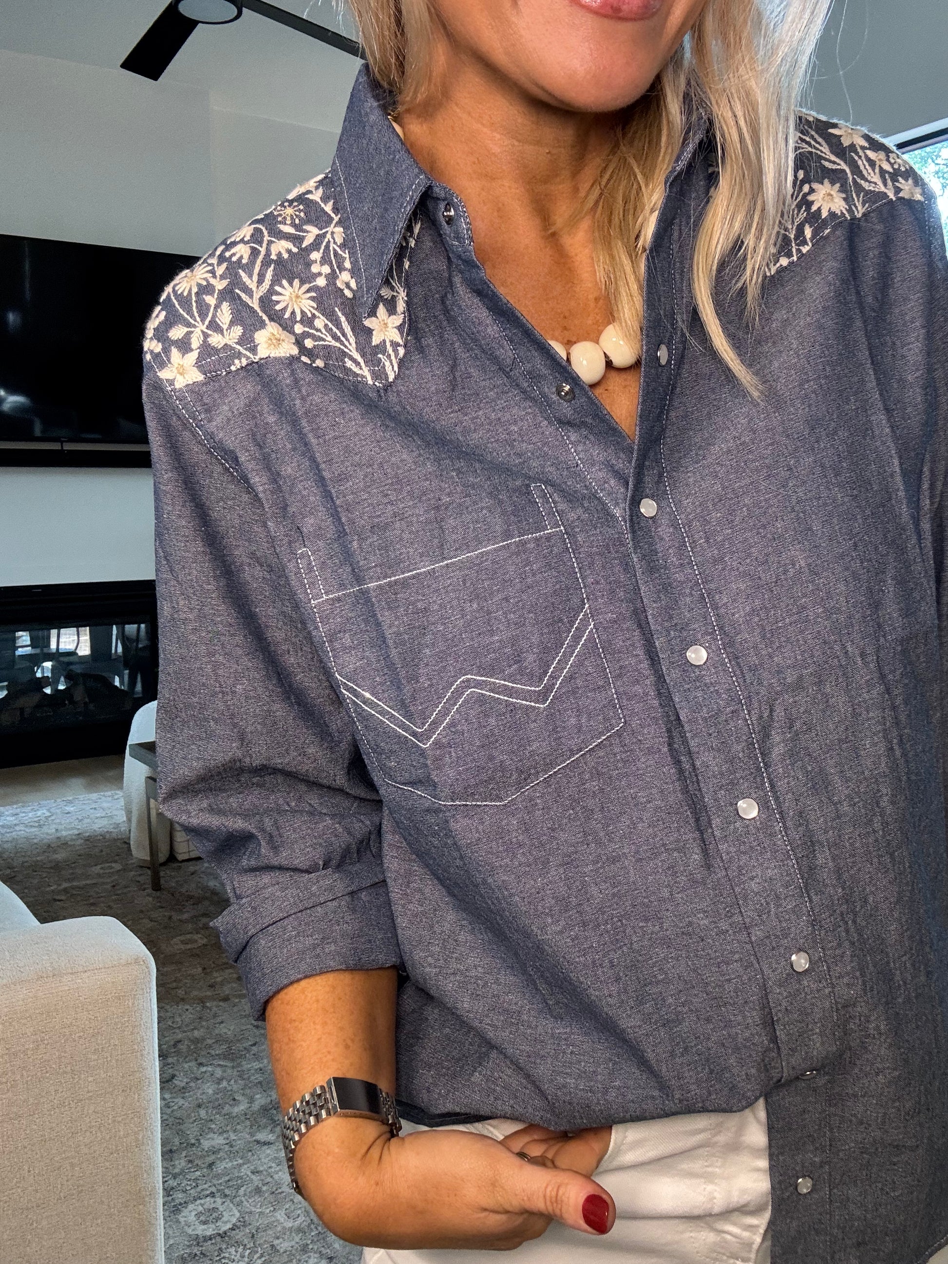 This embroidered denim long-sleeve shirt combines style and comfort, offering a versatile addition to your wardrobe. Perfect for casual outings or a day at the office, it features intricate floral embroidery that adds elegance to its relaxed fit. The soft denim fabric ensures all-day comfort, making it a staple piece for every season.
