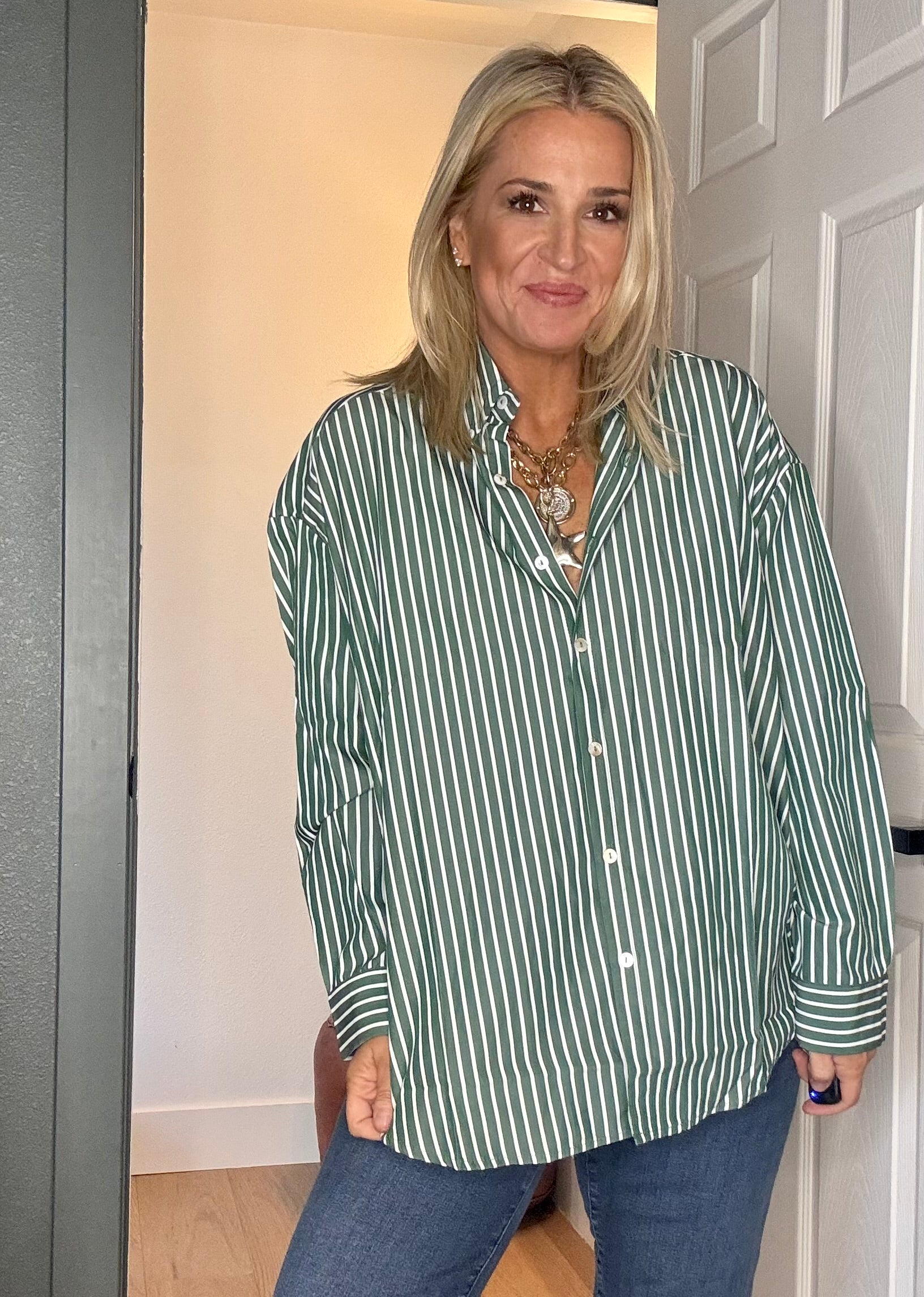 Our Claire Top is a gorgeous dark green stripe that features a v-neck and a button down closure. Perfectly oversized yet still polished and chic.