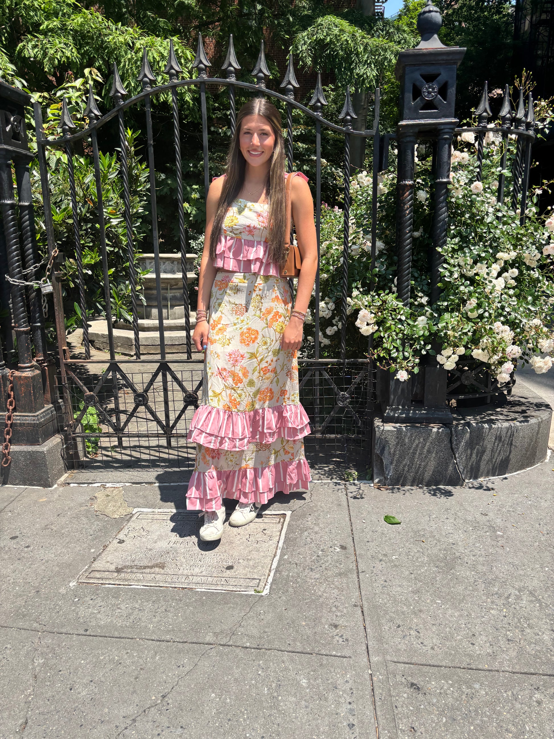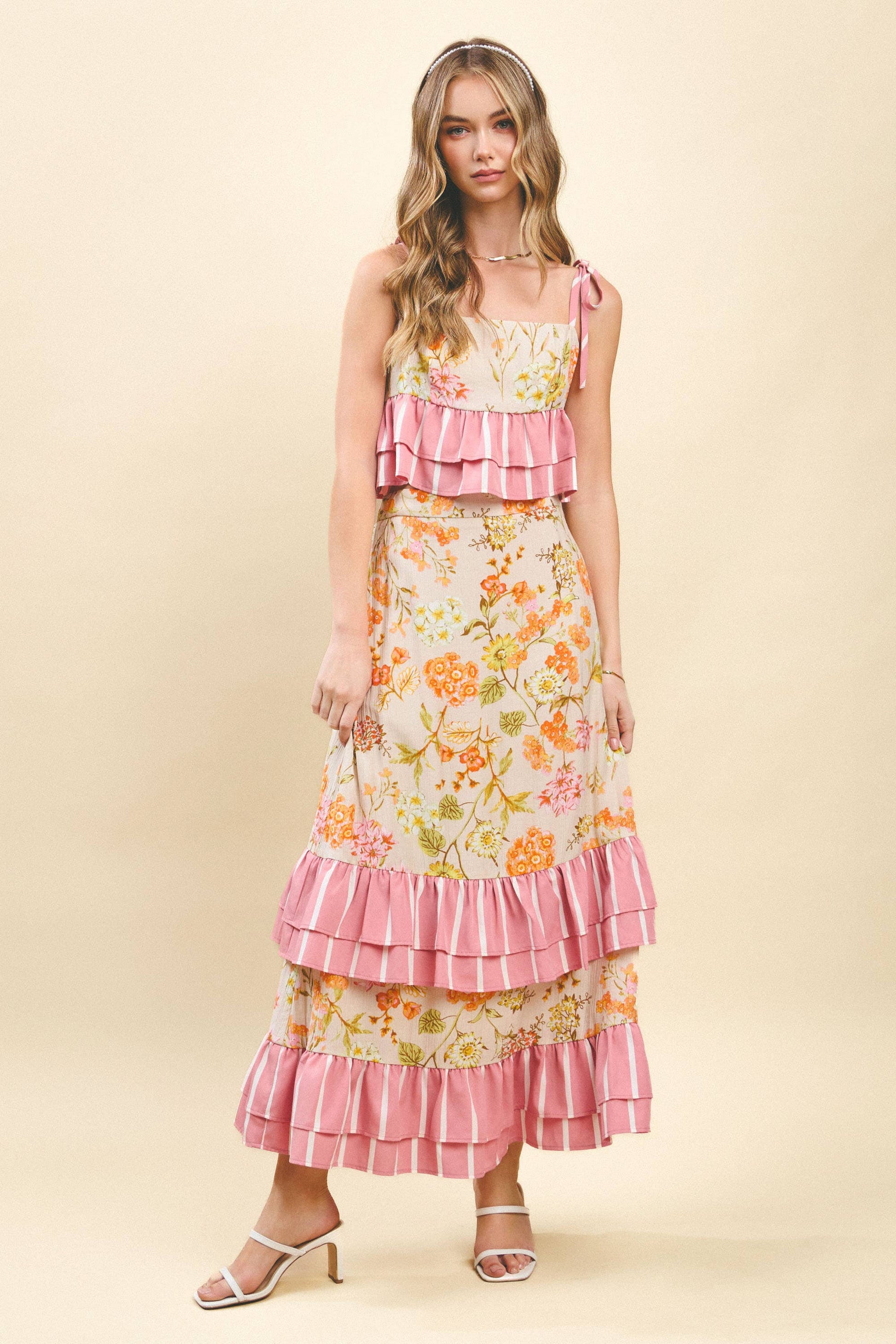Floral print sleeveless top featuring contrast striped ruffle hem, adjustable self-tie straps, and back zipper closure. Pair with our Floral & Stripes Skirt.