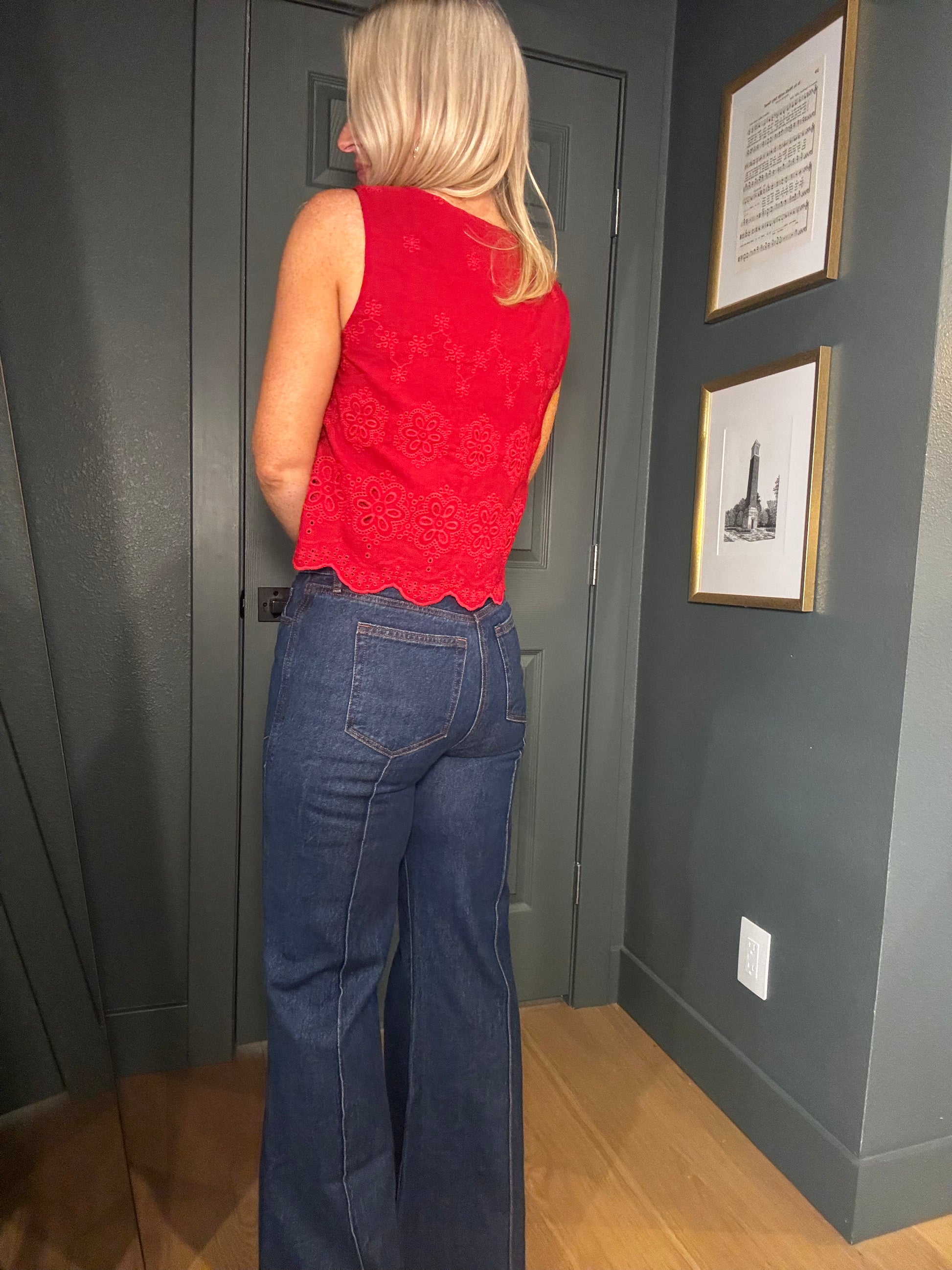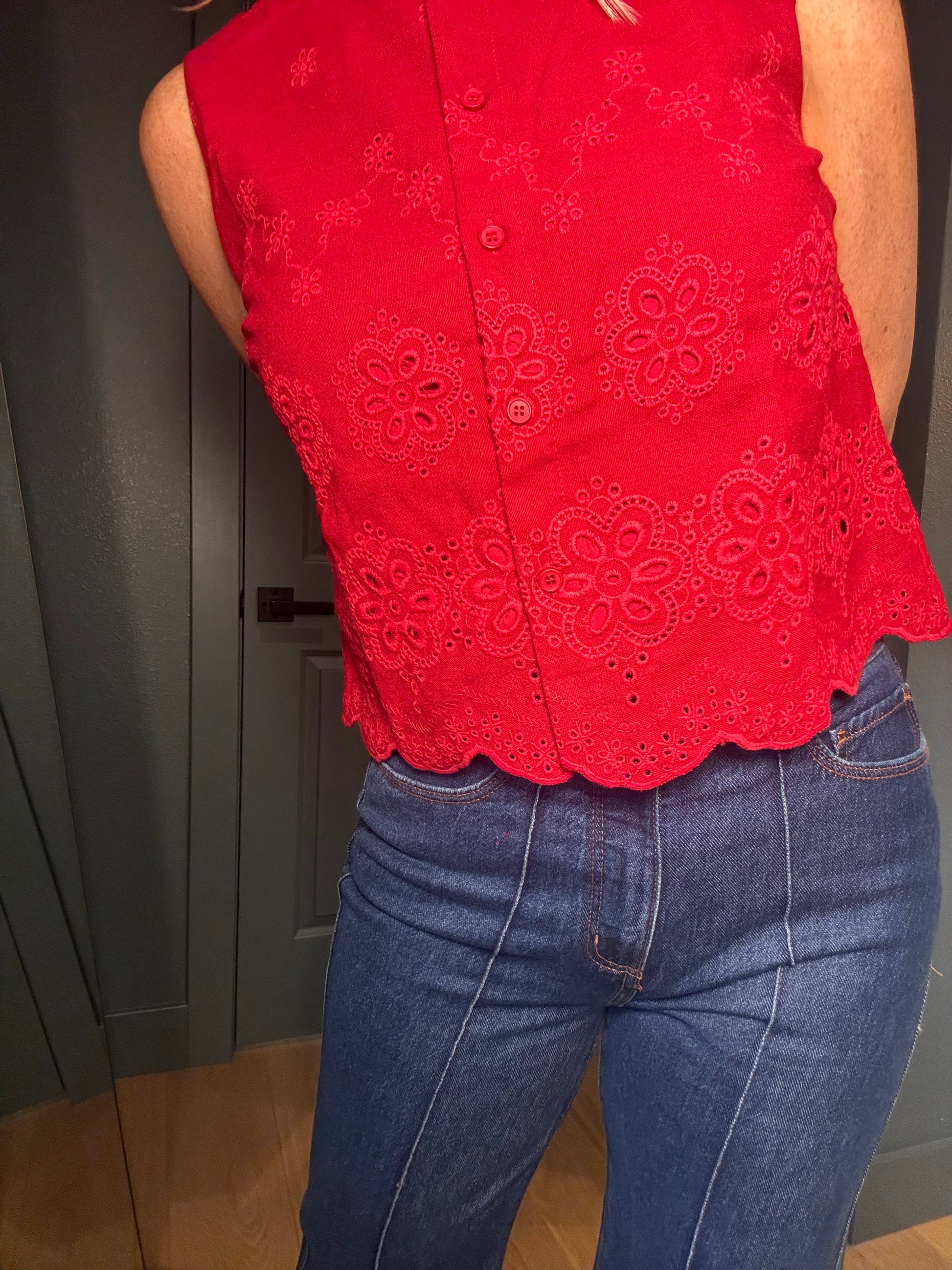 This breezy sleeveless number brings the charm with delicate floral eyelet work and a fun scalloped edge. Cropped just right with adorable front buttons that add a touch of personality. Perfect for layering or showing off on its own—your wardrobe just got a whole lot more interesting.