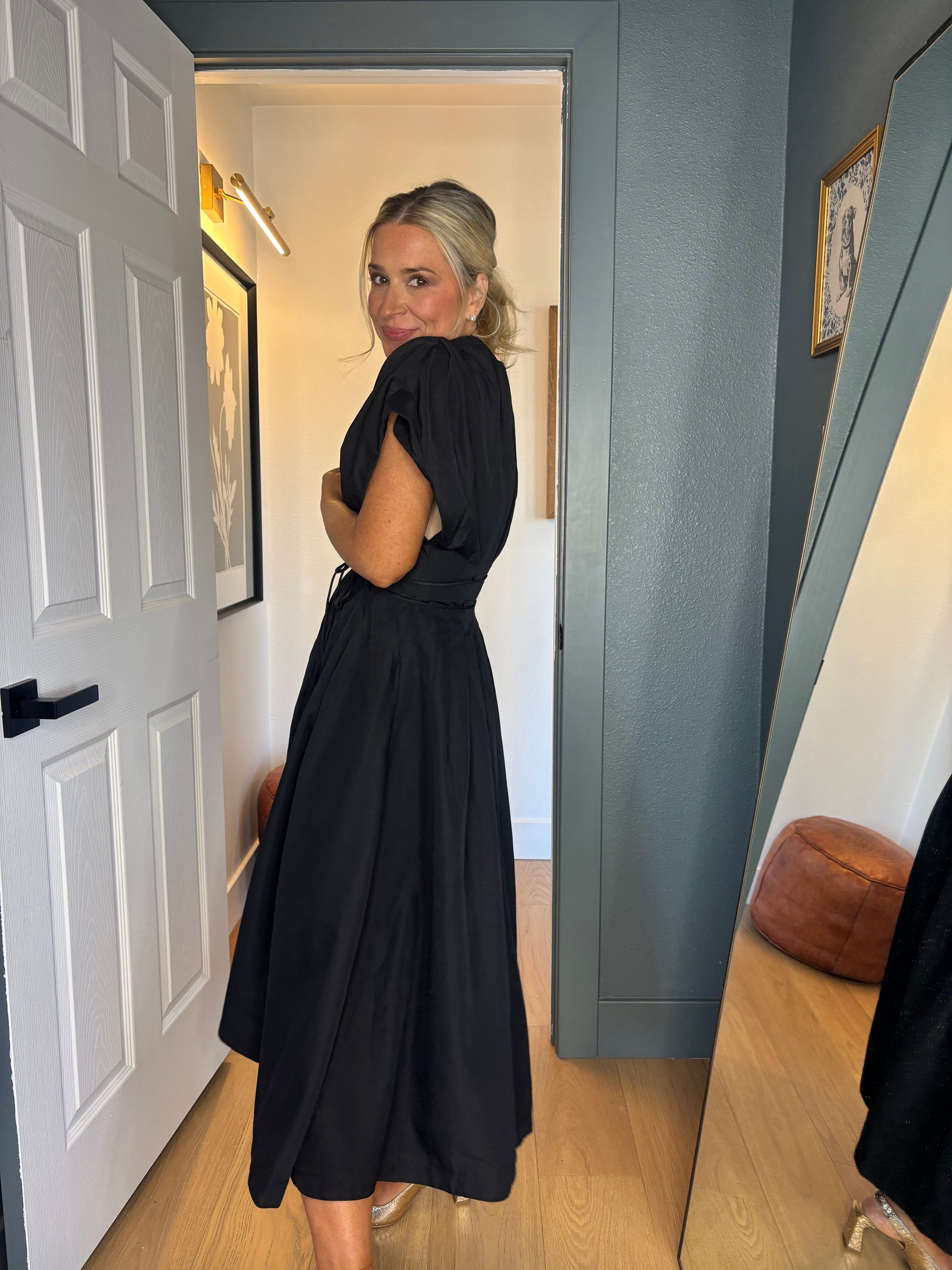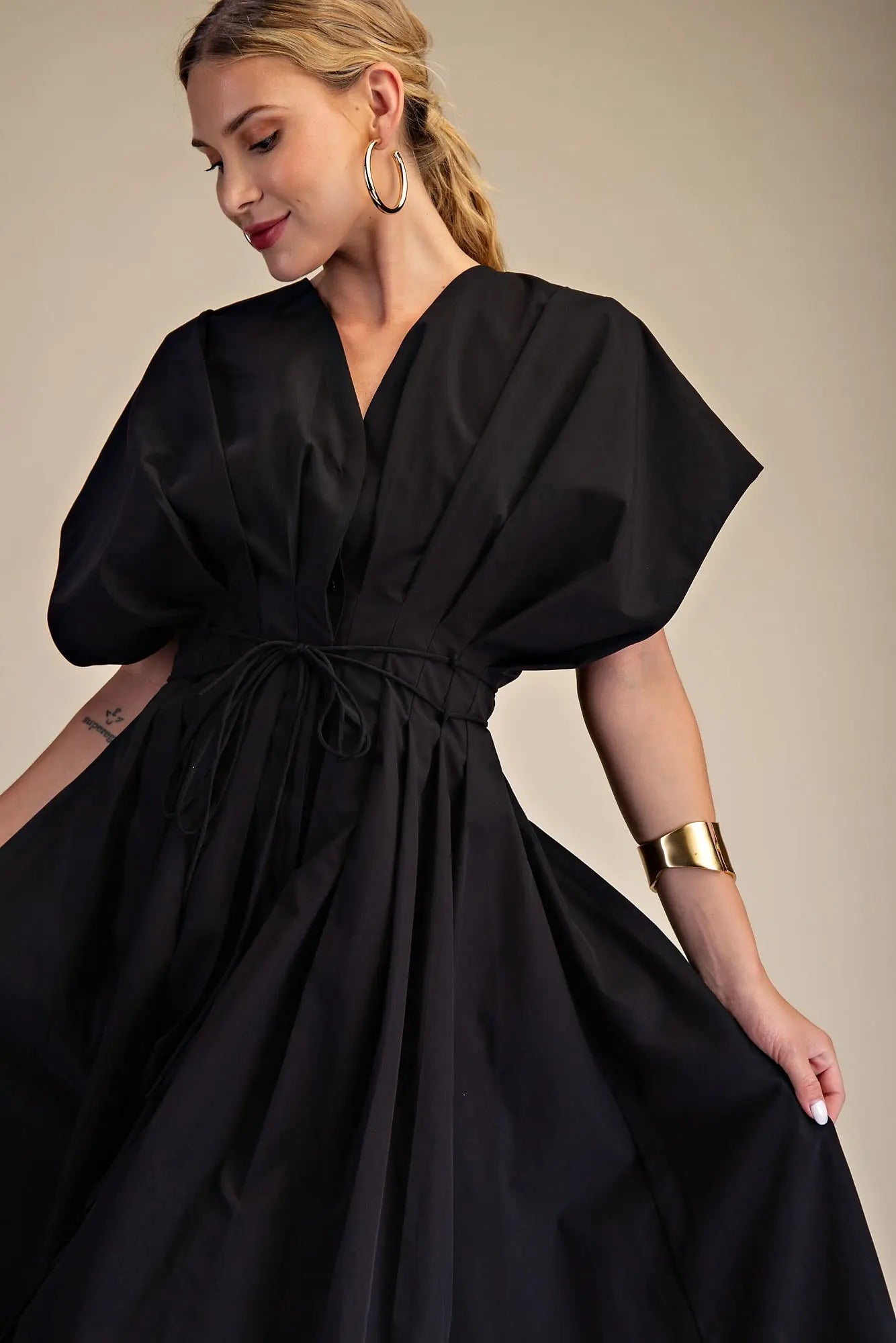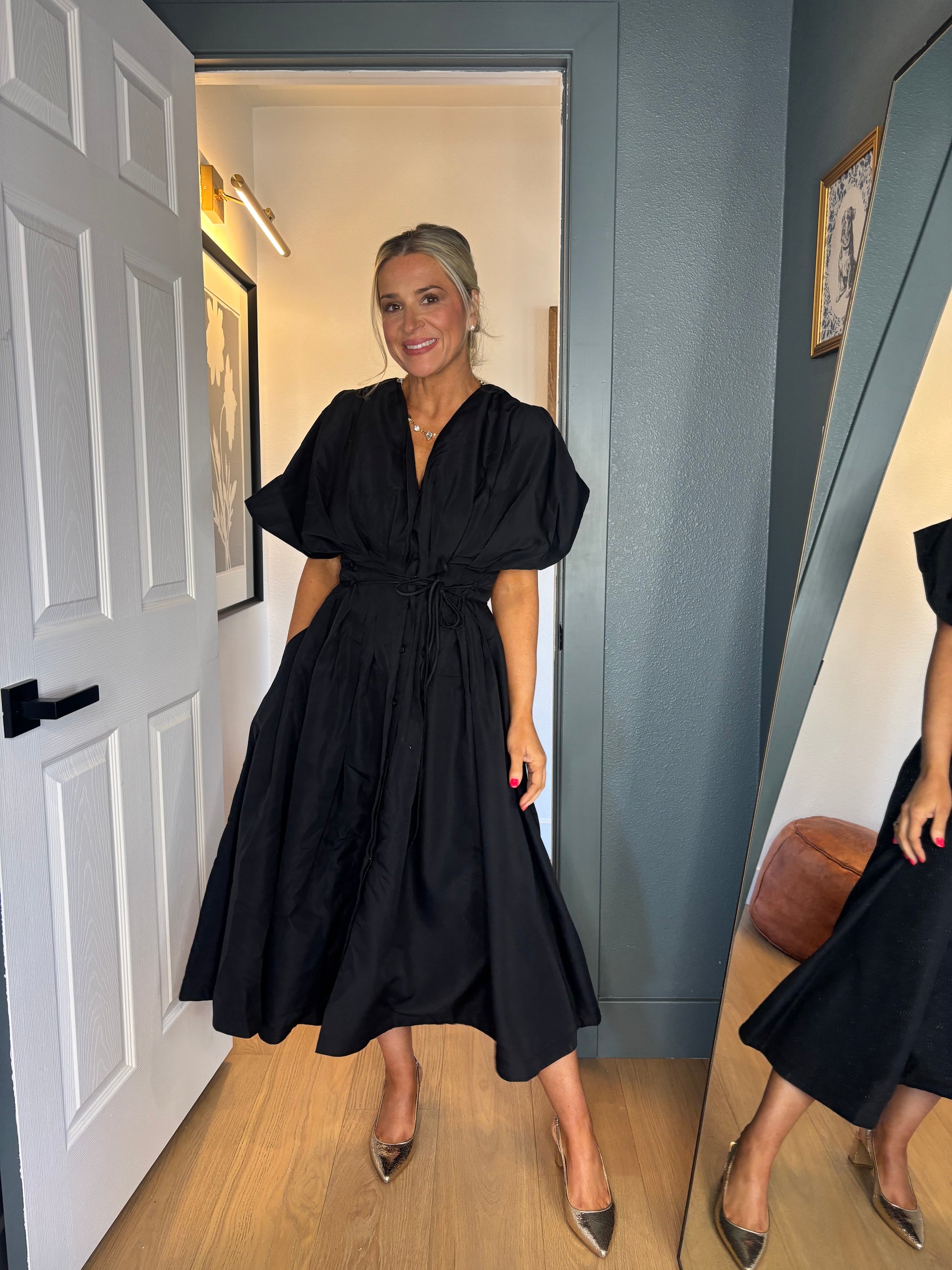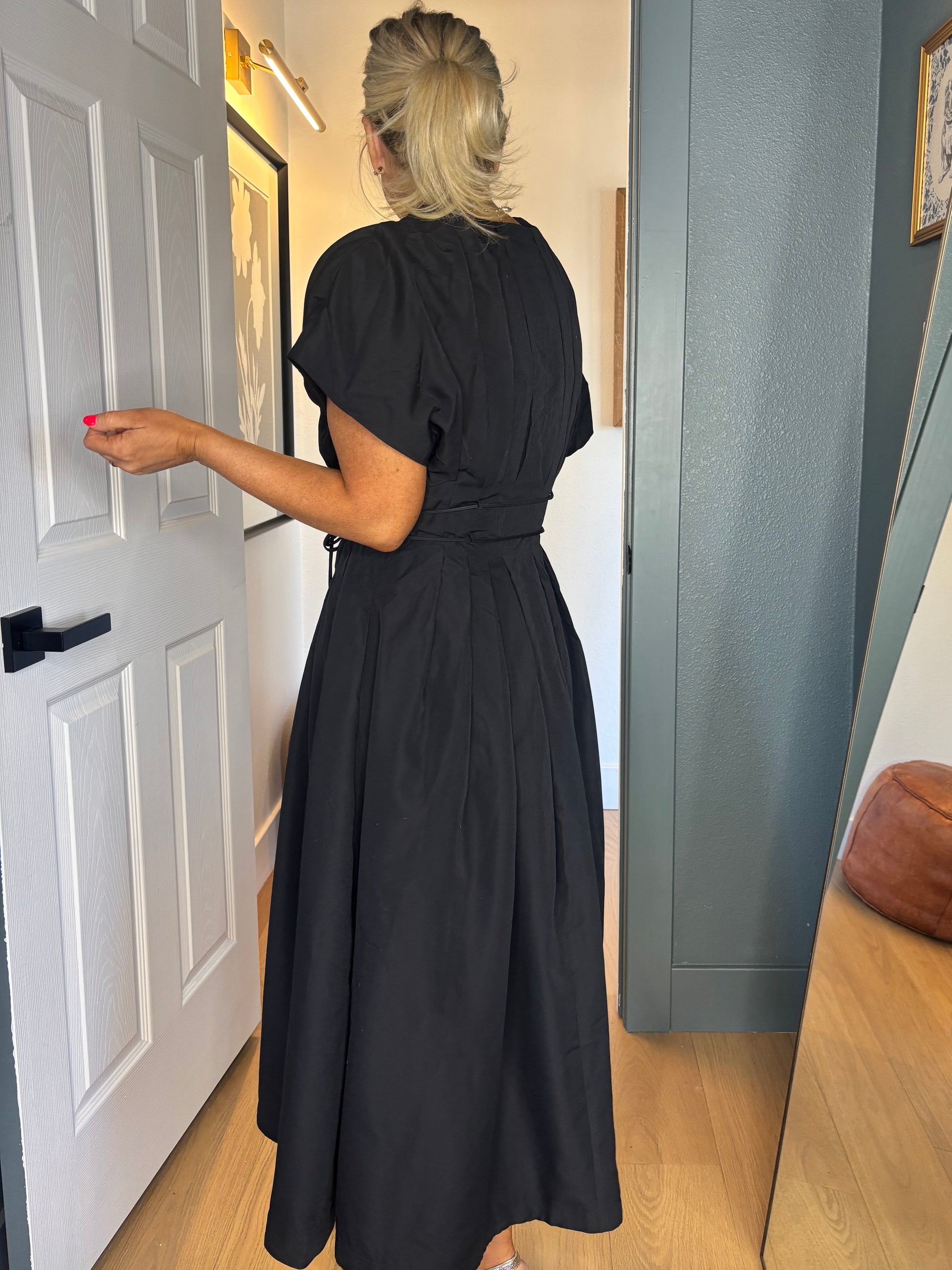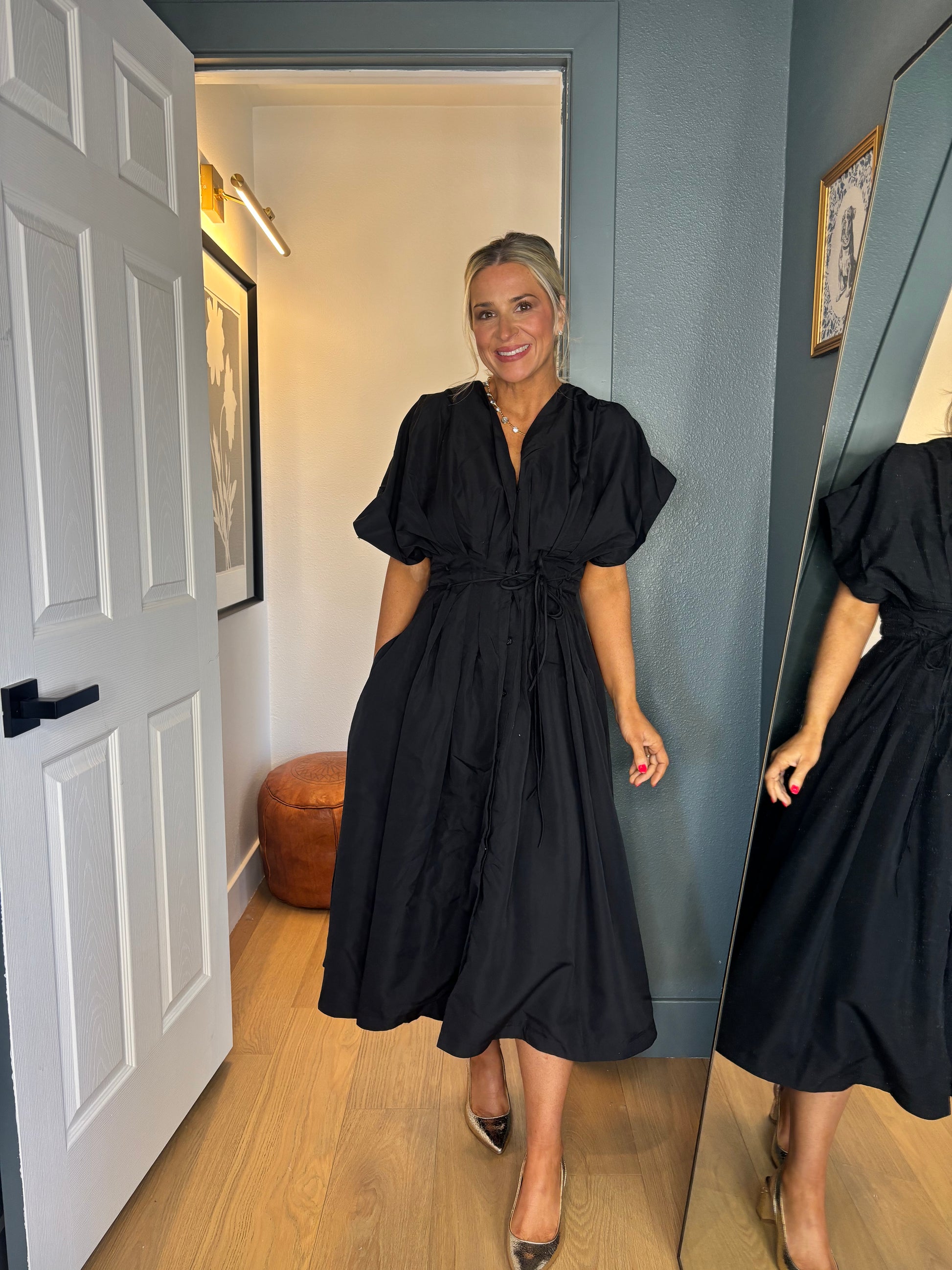 Effortlessly chic and ready for anything, the Downtown Midi brings downtown sophistication to your everyday rotation. This sleek black midi features a cinched waist that flatters your silhouette, paired with crisp button detailing and elegant pleats that add movement and dimension. Whether you're heading to brunch or the office, this versatile piece transitions seamlessly from day to night. A modern essential that works as hard as you do.