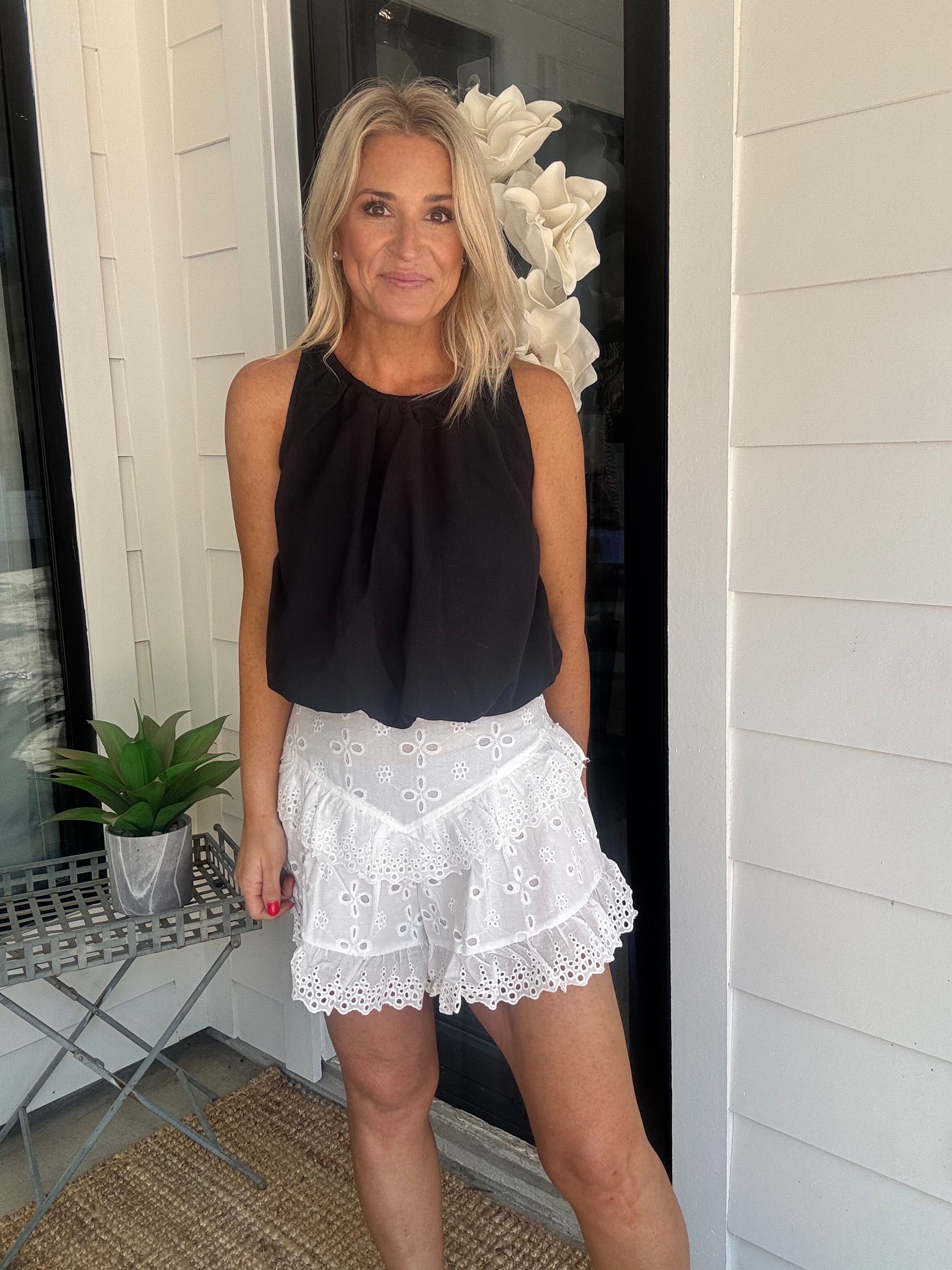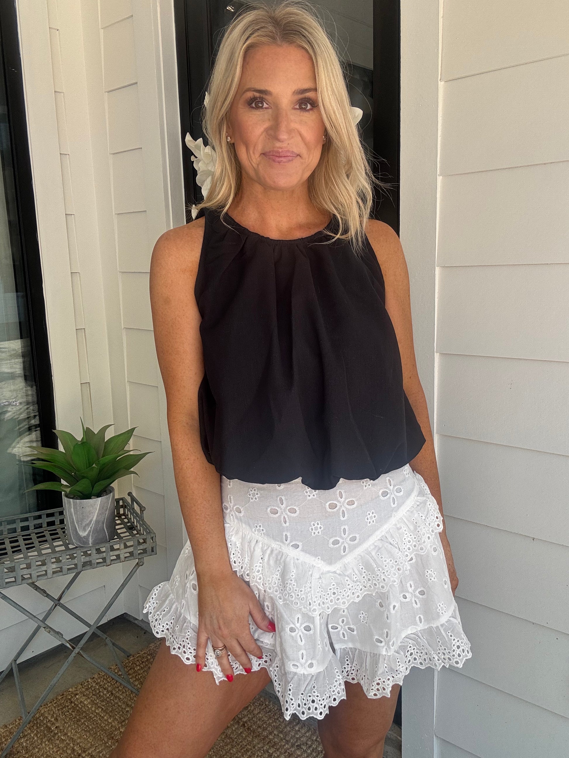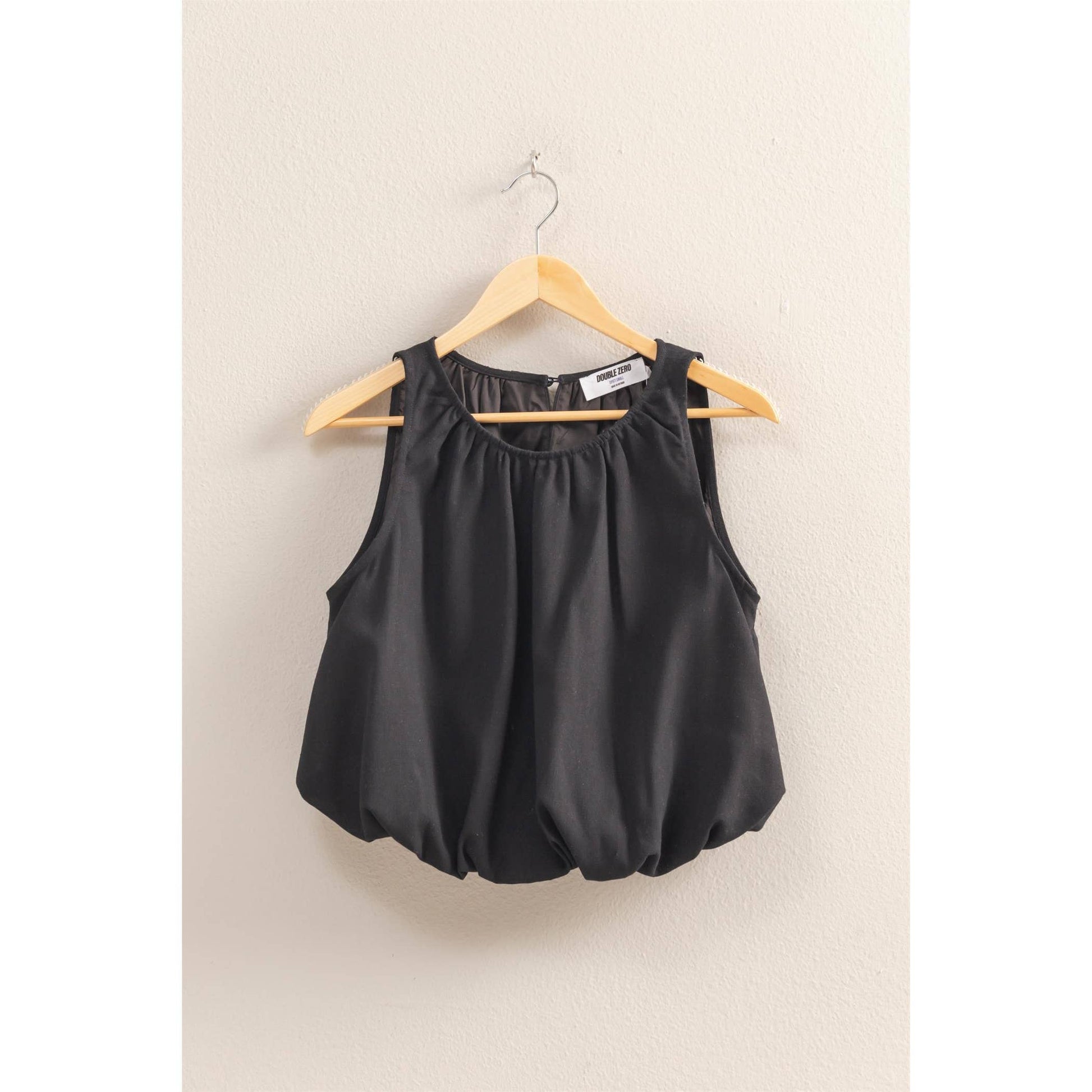 The Bubble Hem Top is crafted from a cotton and linen blend. I comes in a sand wash hue and features a sleeveless cut. The bodice curves inwards along the hem, forming a cropped bubble hem.