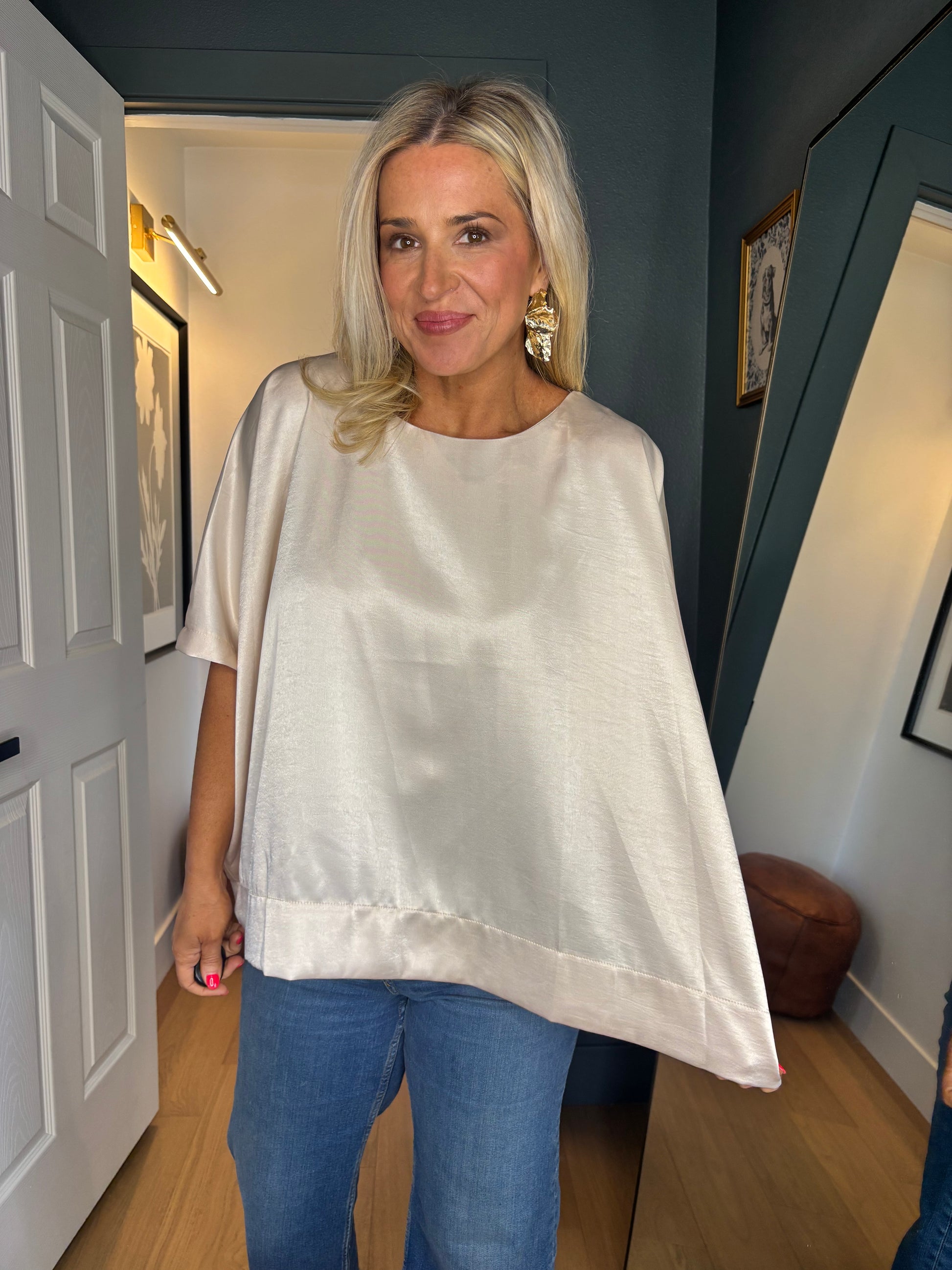 Slip into effortless elegance with this ivory satin top. The soft, lustrous fabric drapes beautifully while the relaxed short sleeves and gentle round neckline keep things breezy and approachable. Perfect for layering or wearing solo, its flowing silhouette moves with you—whether you're heading to brunch or a casual Friday at the office. A wardrobe staple that feels anything but basic.