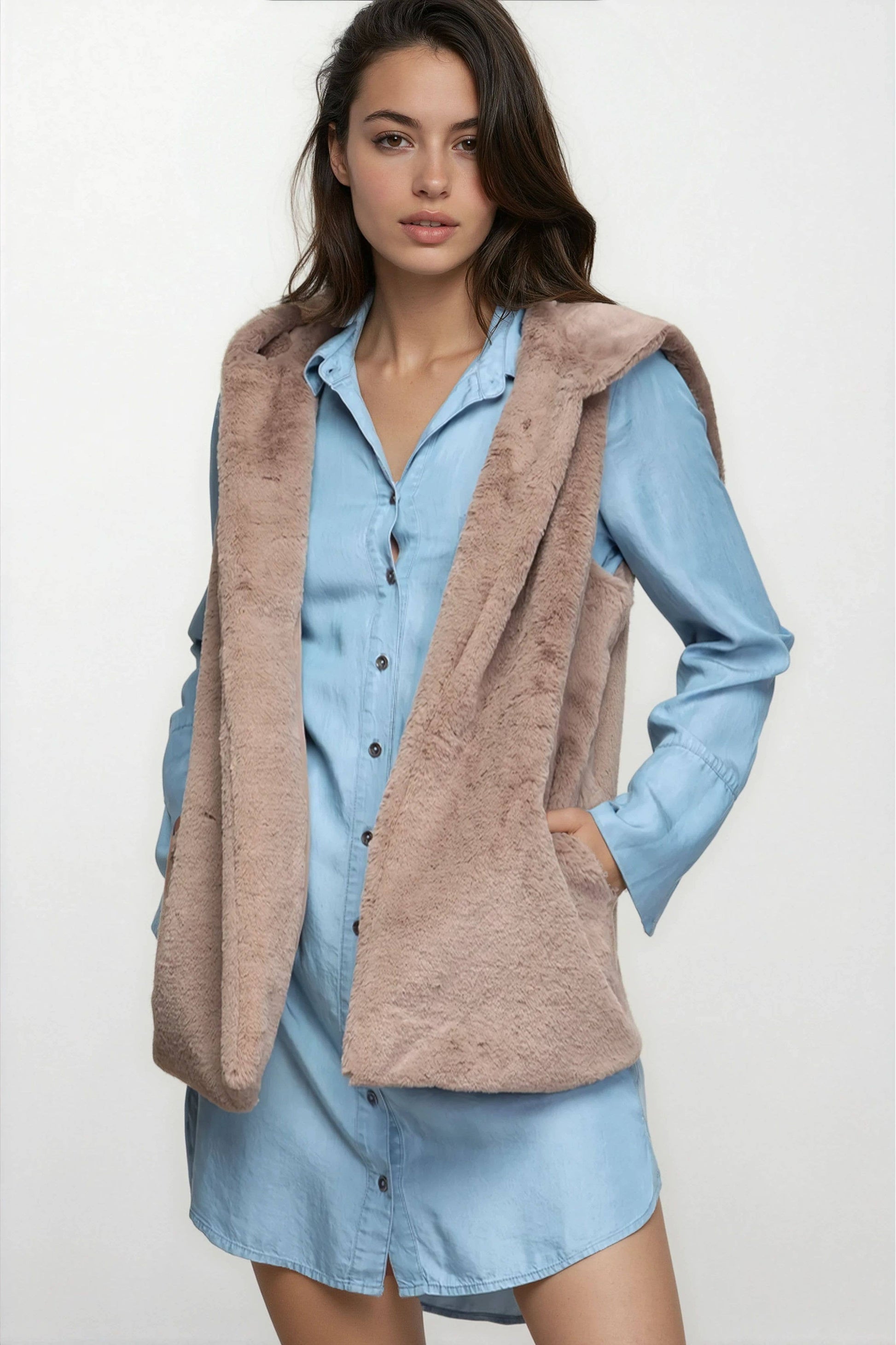 Stay cozy and stylish with our Faux Fur Hoodie Vest, combining warmth and comfort in one chic piece. The soft faux fur and hooded design make it perfect for layering on cooler days. Effortlessly elevate any casual look with this versatile vest. F