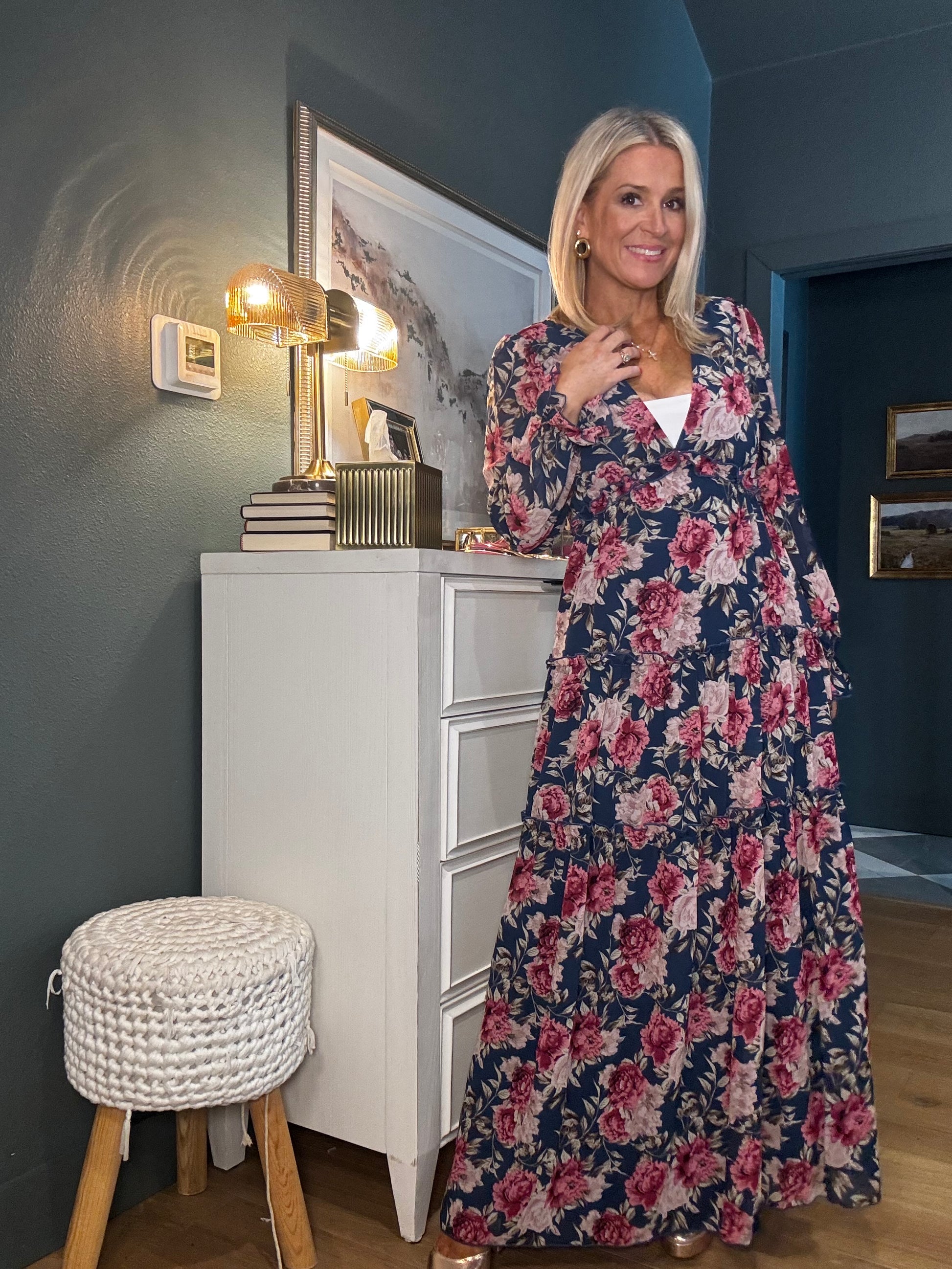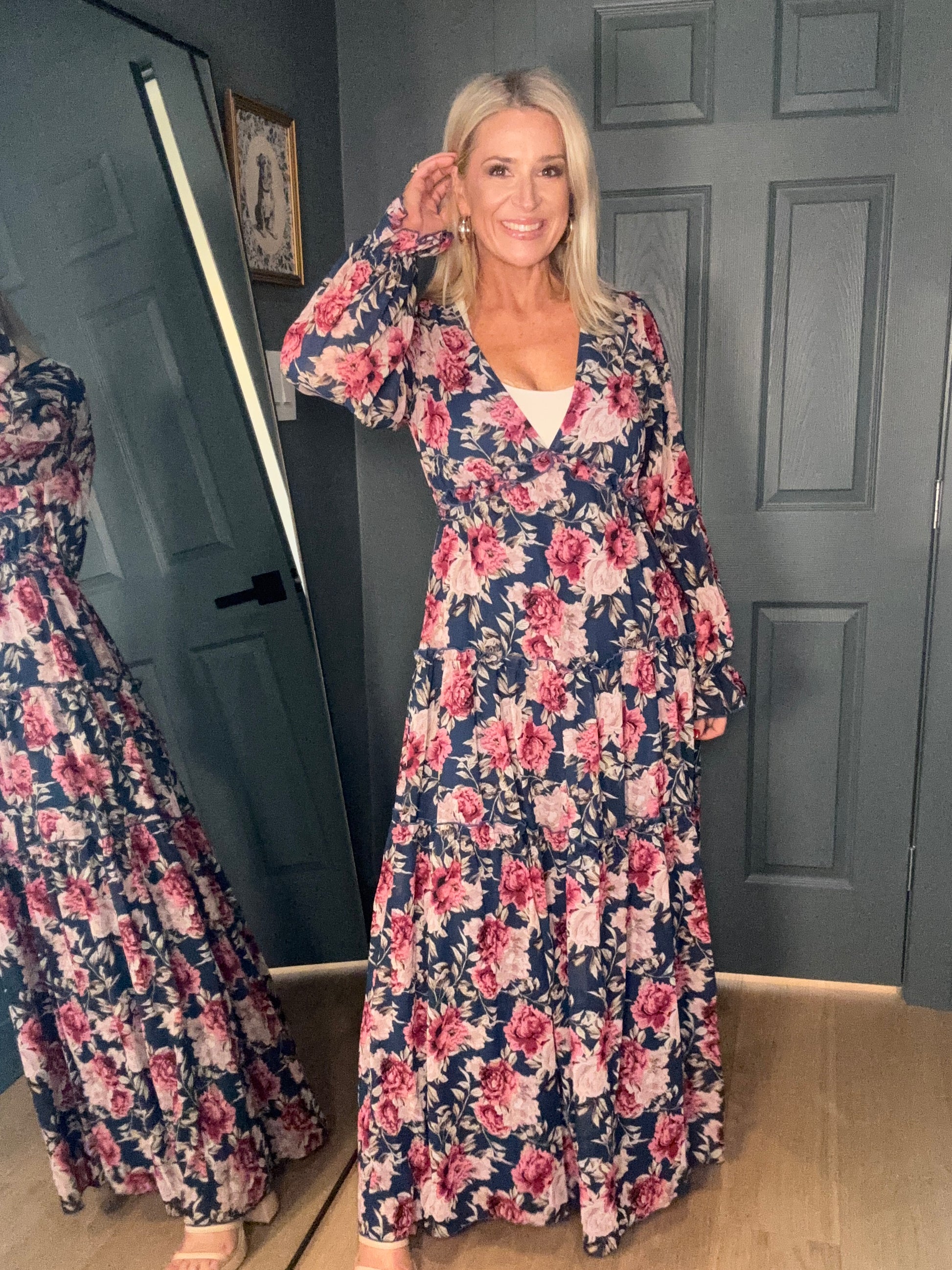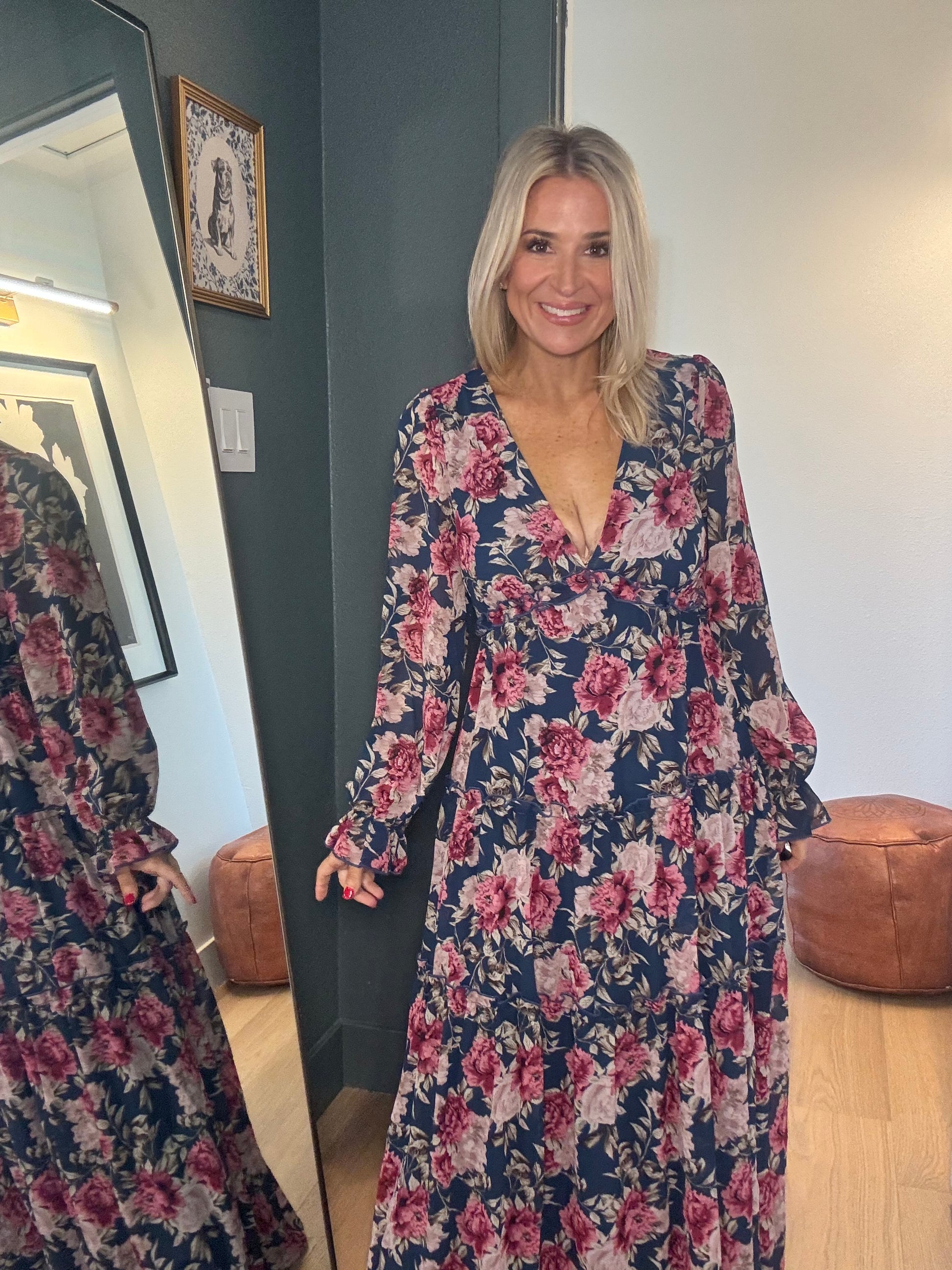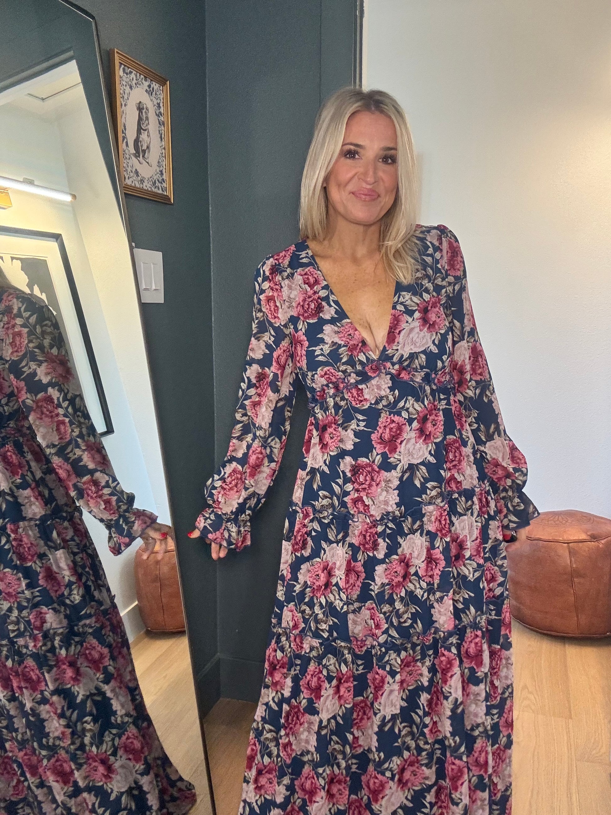 Woven v-neck maxi dress featuring an all around floral print, ruffle tiered design, and love sleeves with elastic ruffle cuffs.