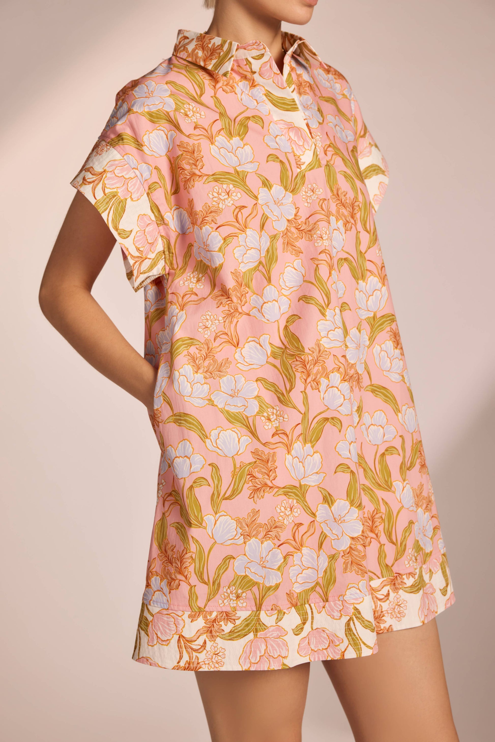 Print color block shirt mini dress in an exclusive floral print on cotton poplin fabric. This relaxed mini dress features side pockets, placket button down closure at bodice, spread collar, short wing sleeve, print color contrast at cuff/hem/collar, lining, a relaxed A-line silhouette, and top stitch detail at sleeve cuff/hem.