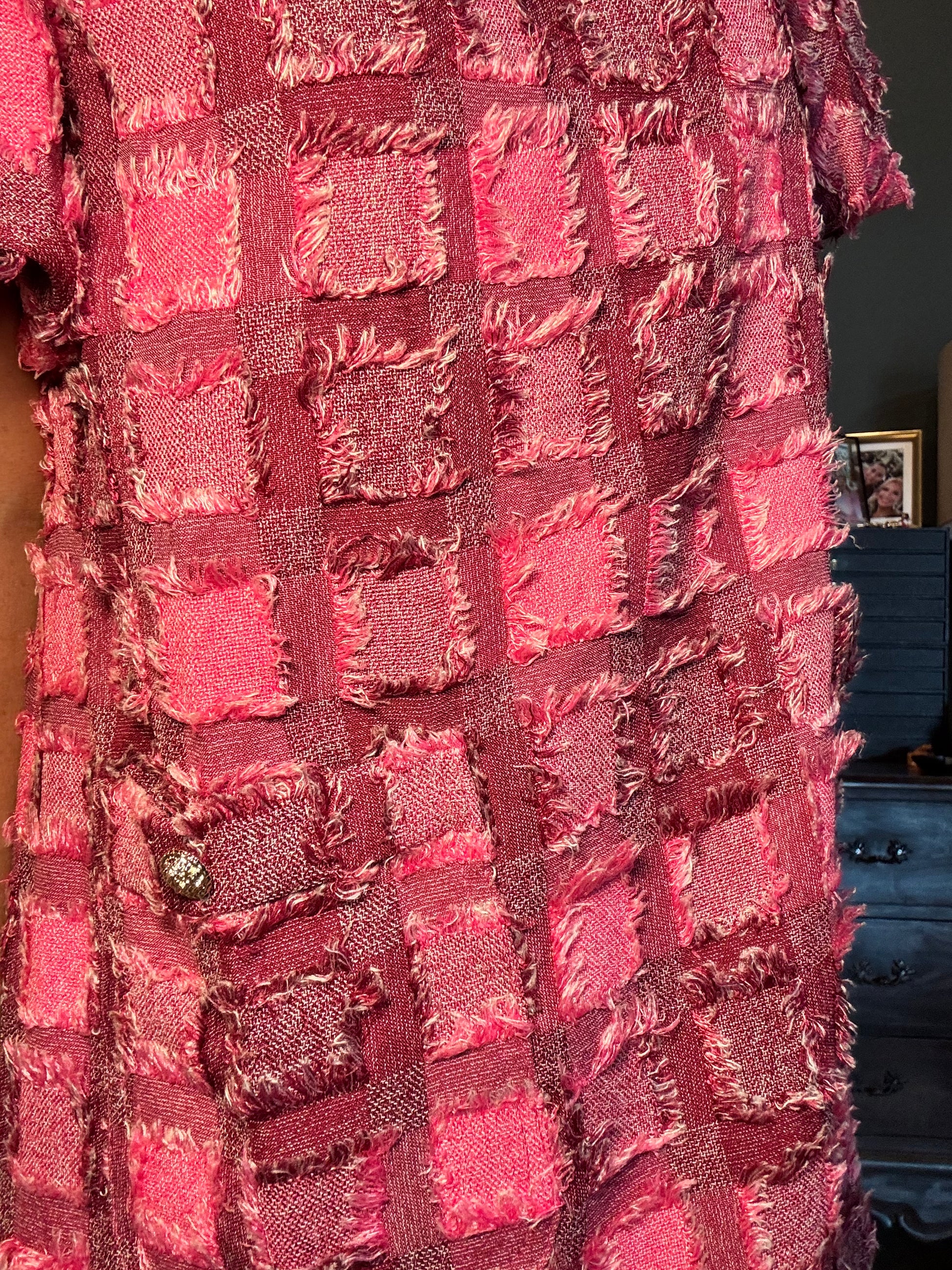 Puff short sleeve mini dress in textured fray plaid fabric. This style features a classic 3 gold button closure at neckline, puff short sleeves, lining, round neckline, and functional front pockets.