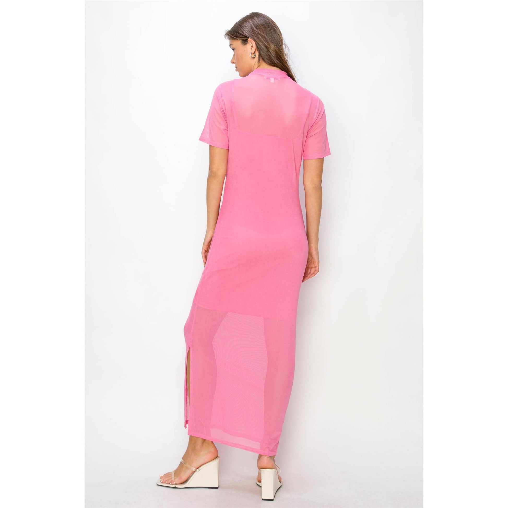Mesh Maxi Dress featuring a mock neckline, short sleeves, and a fitted silhouette. Designed with a sheer mesh outer layer and includes a lining for coverage. Constructed to follow the body's natural shape,
