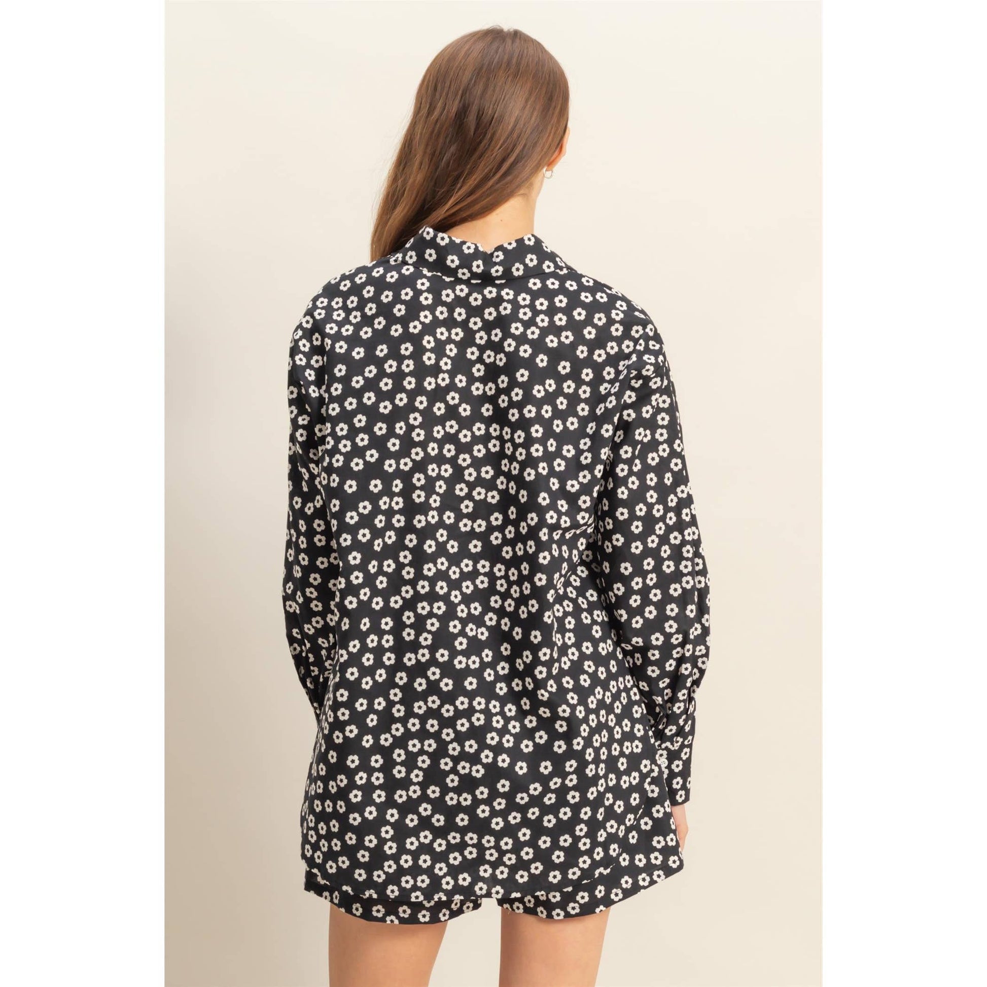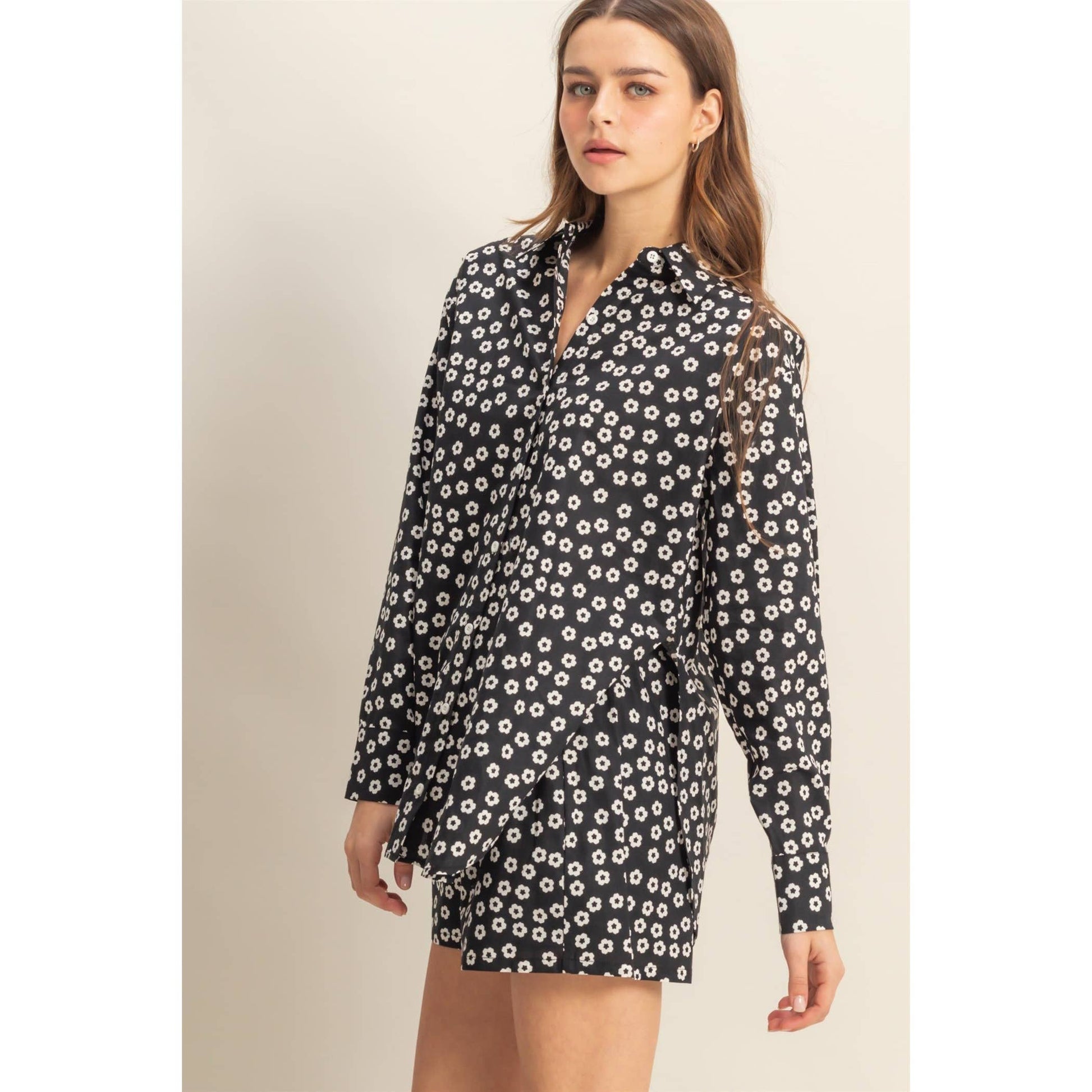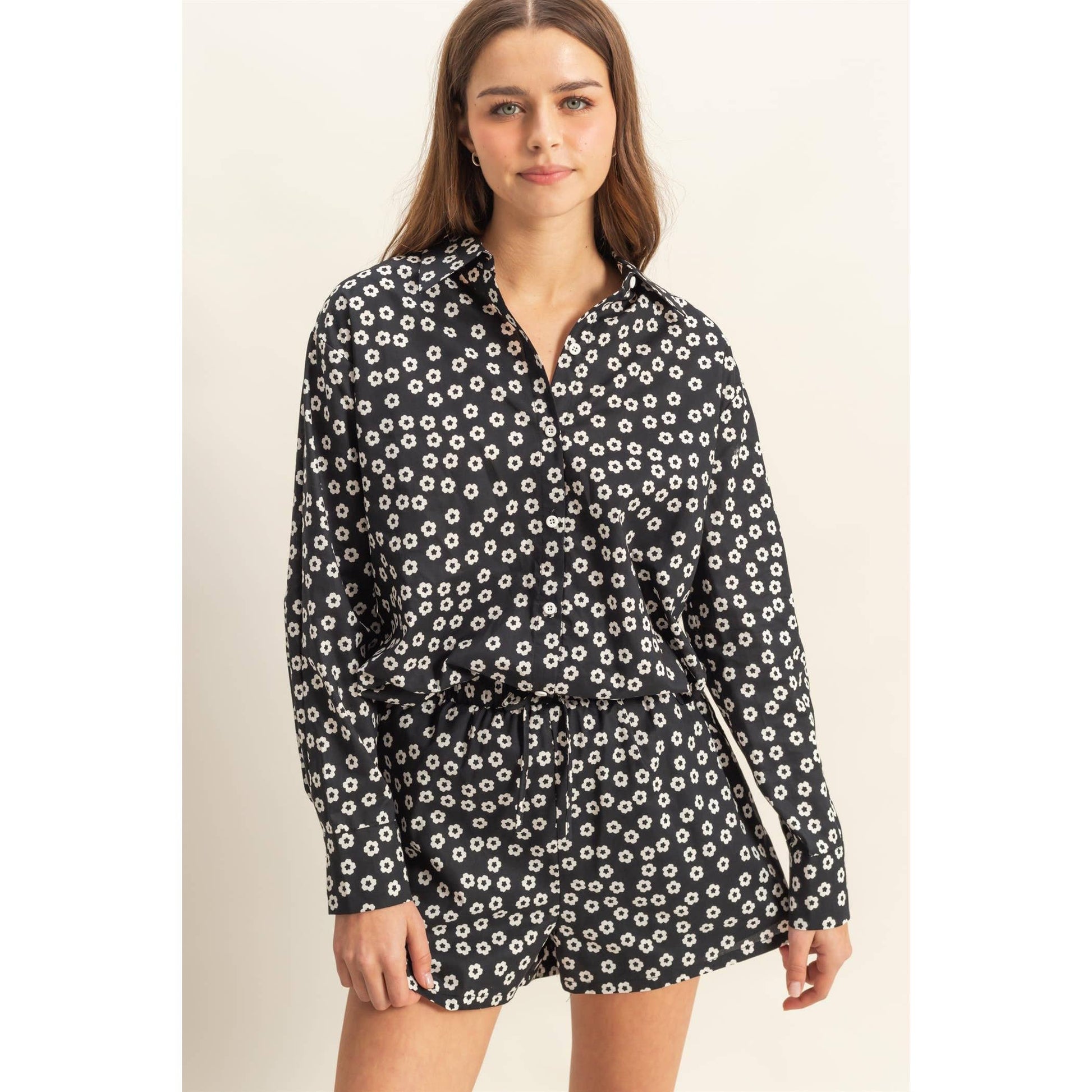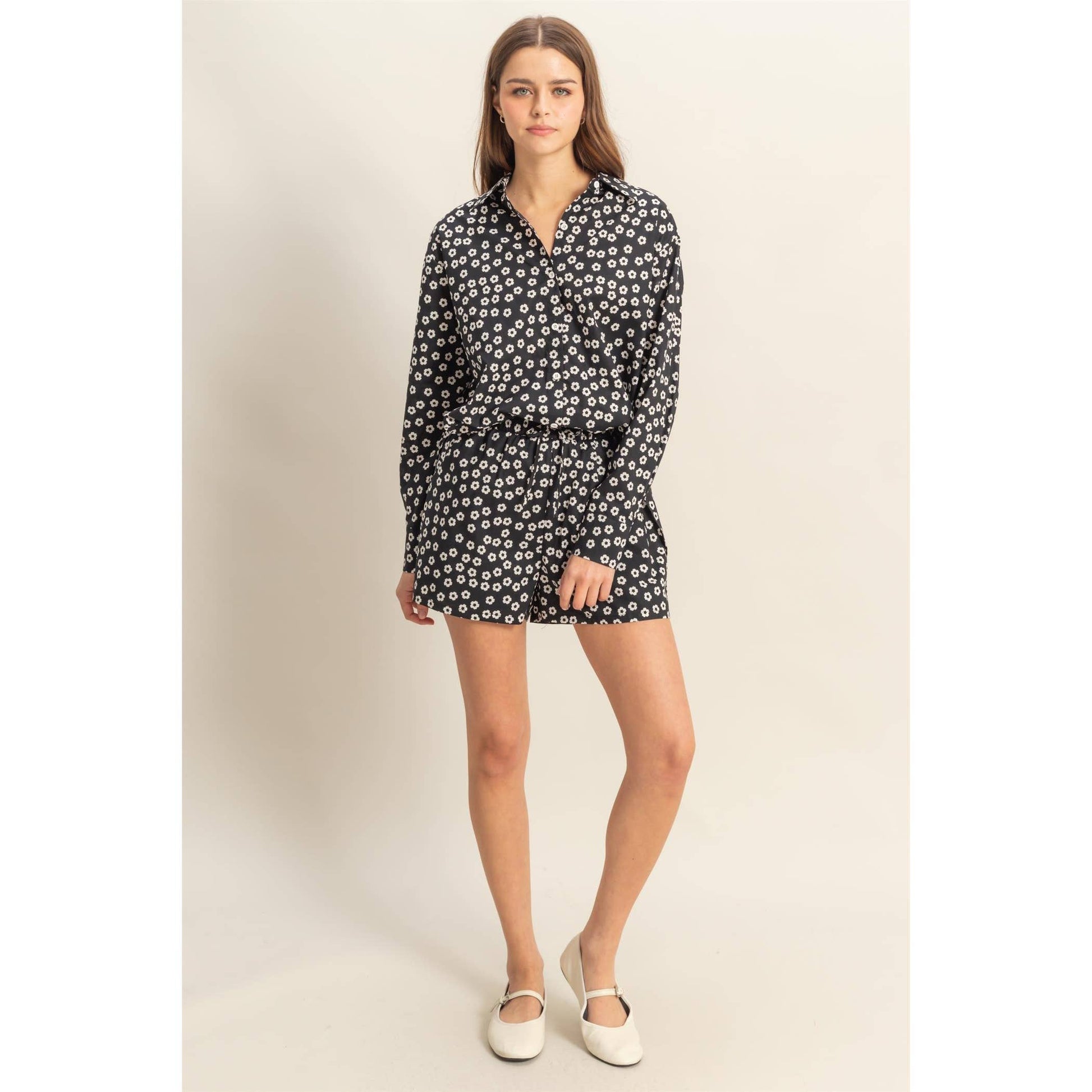 The Midnight Garden Set is a fun black and white floral button up with pull on shorts! The shirt is long sleeves with an oversized silhouette and higher cut slit on the sides. The matching shorts are a high rise fit with pull on waist.