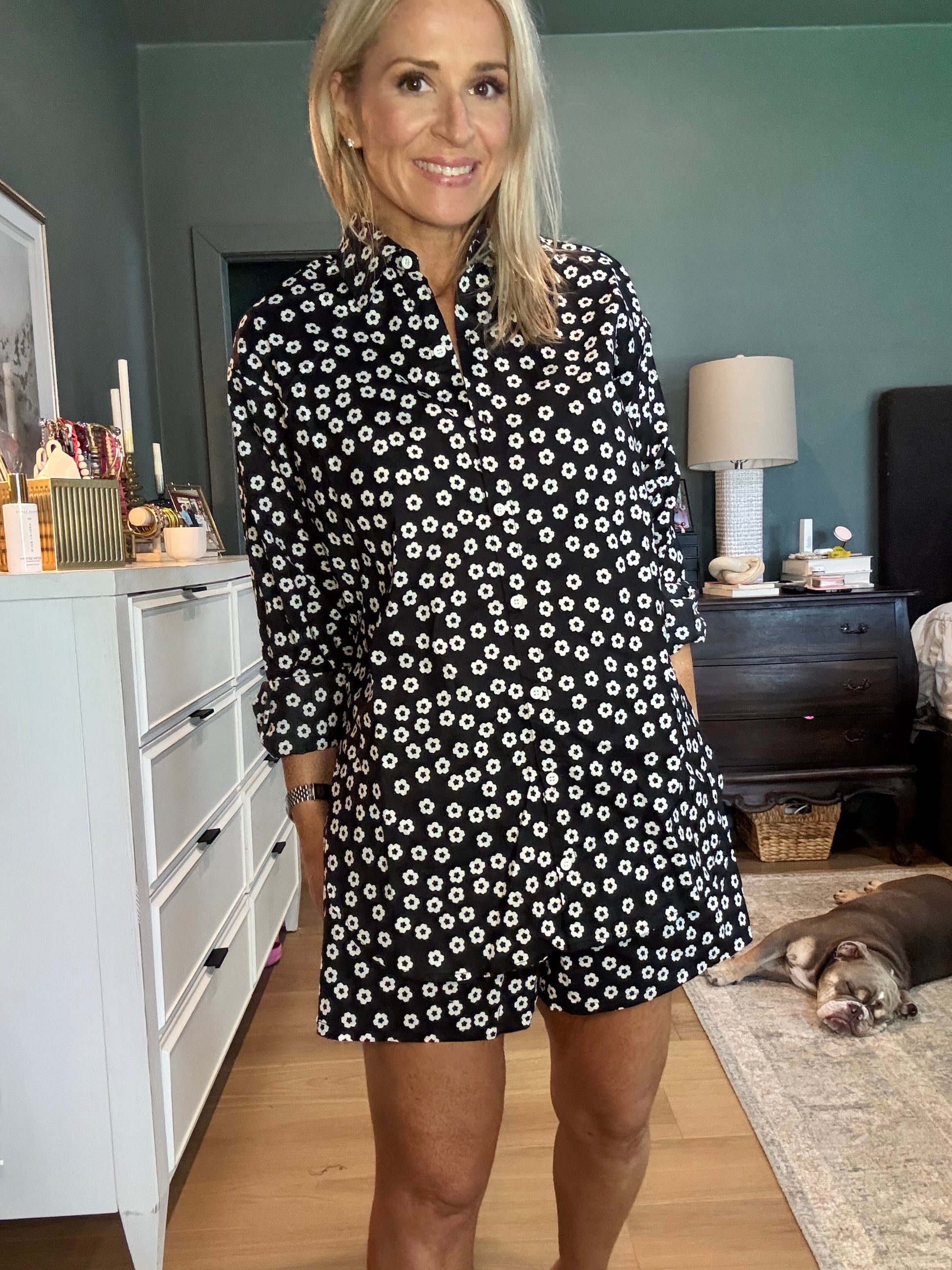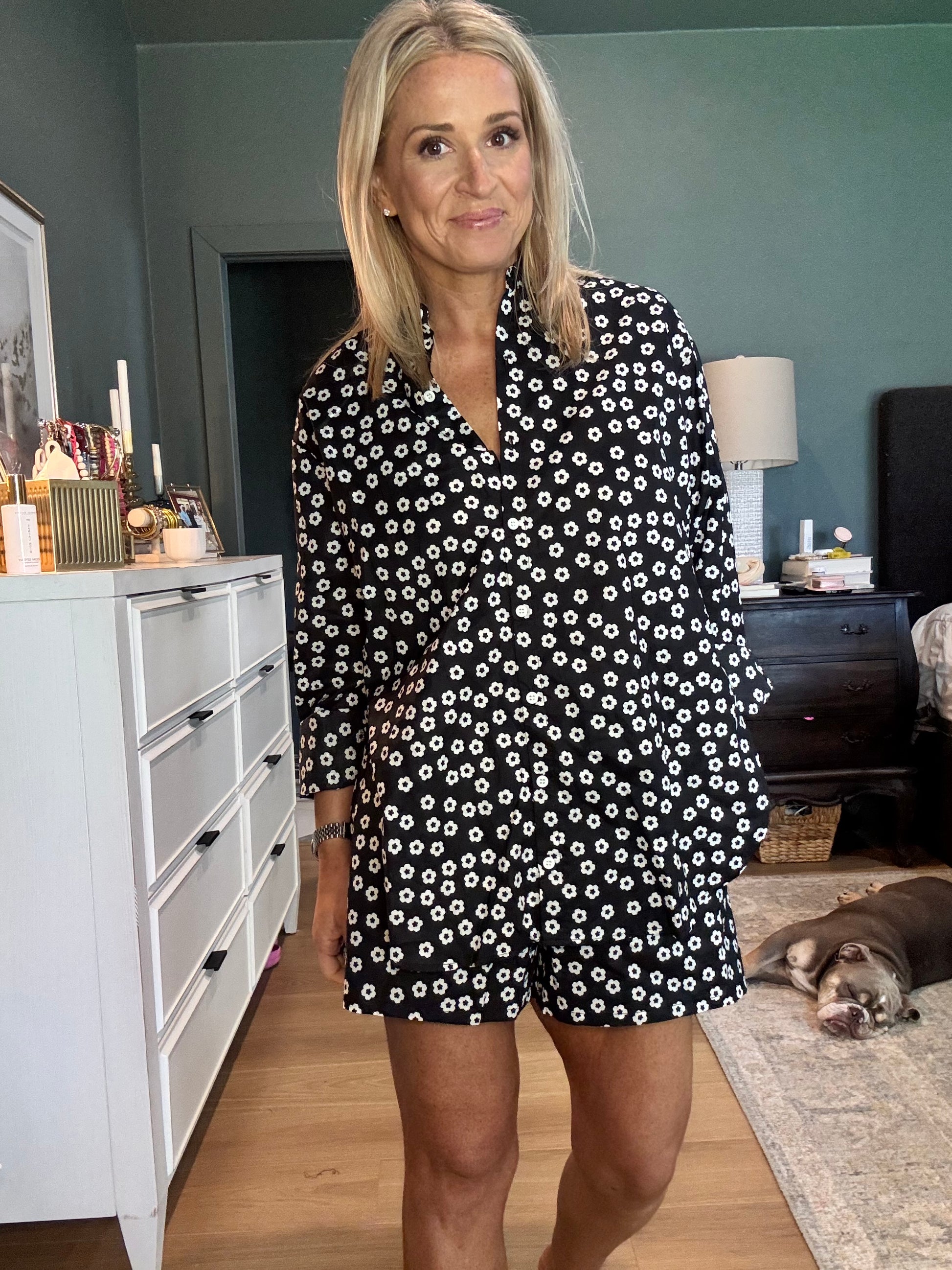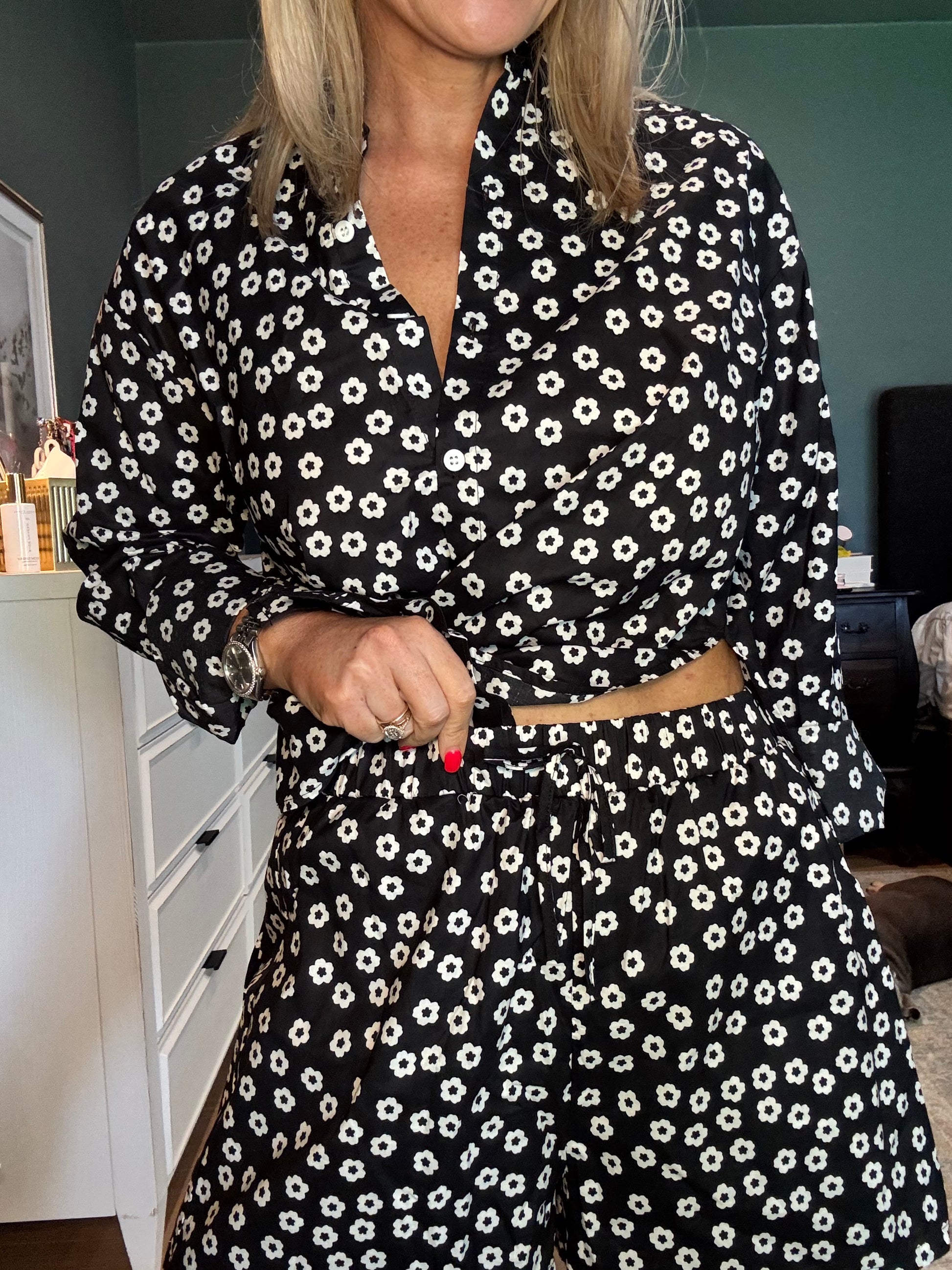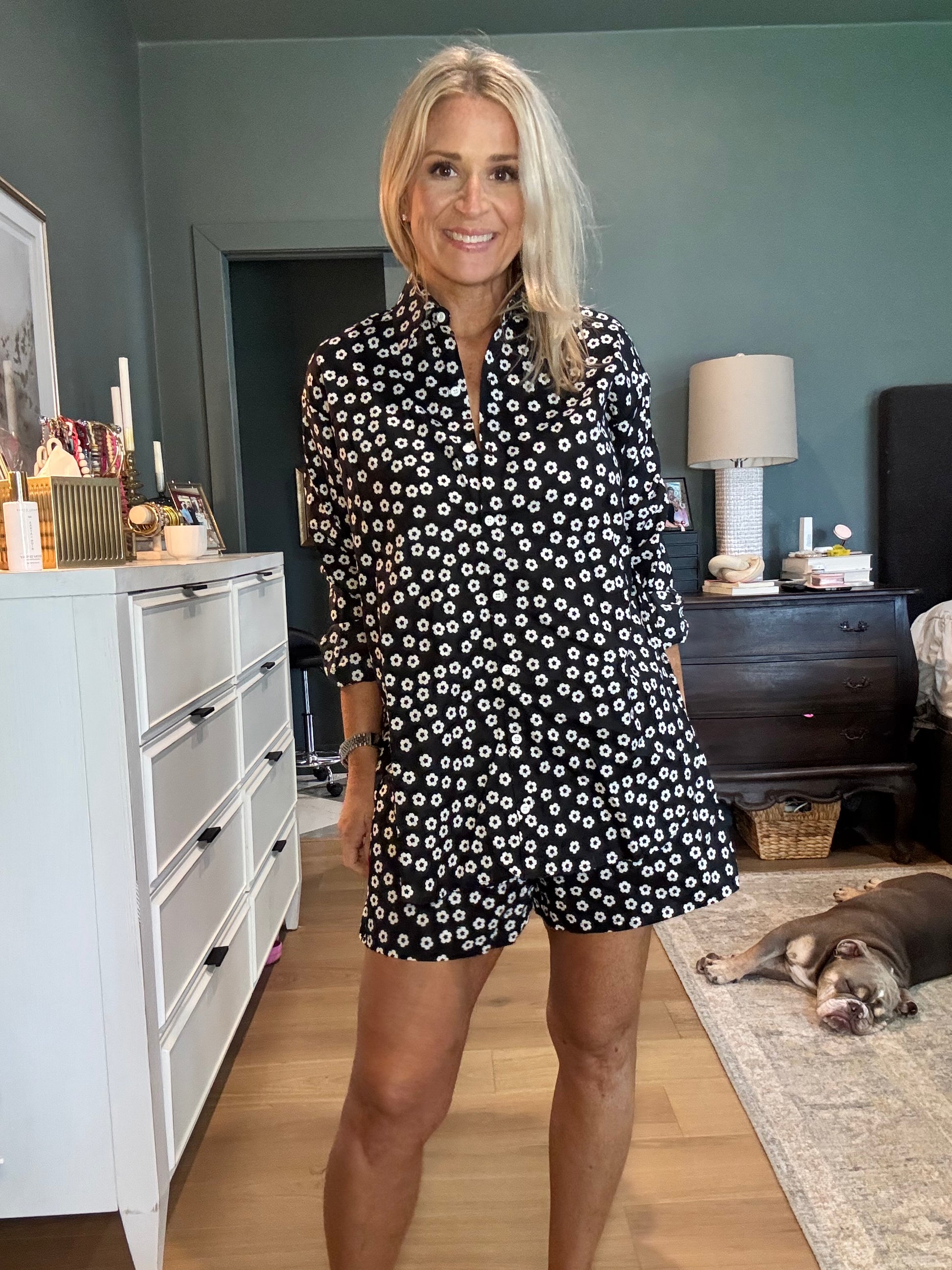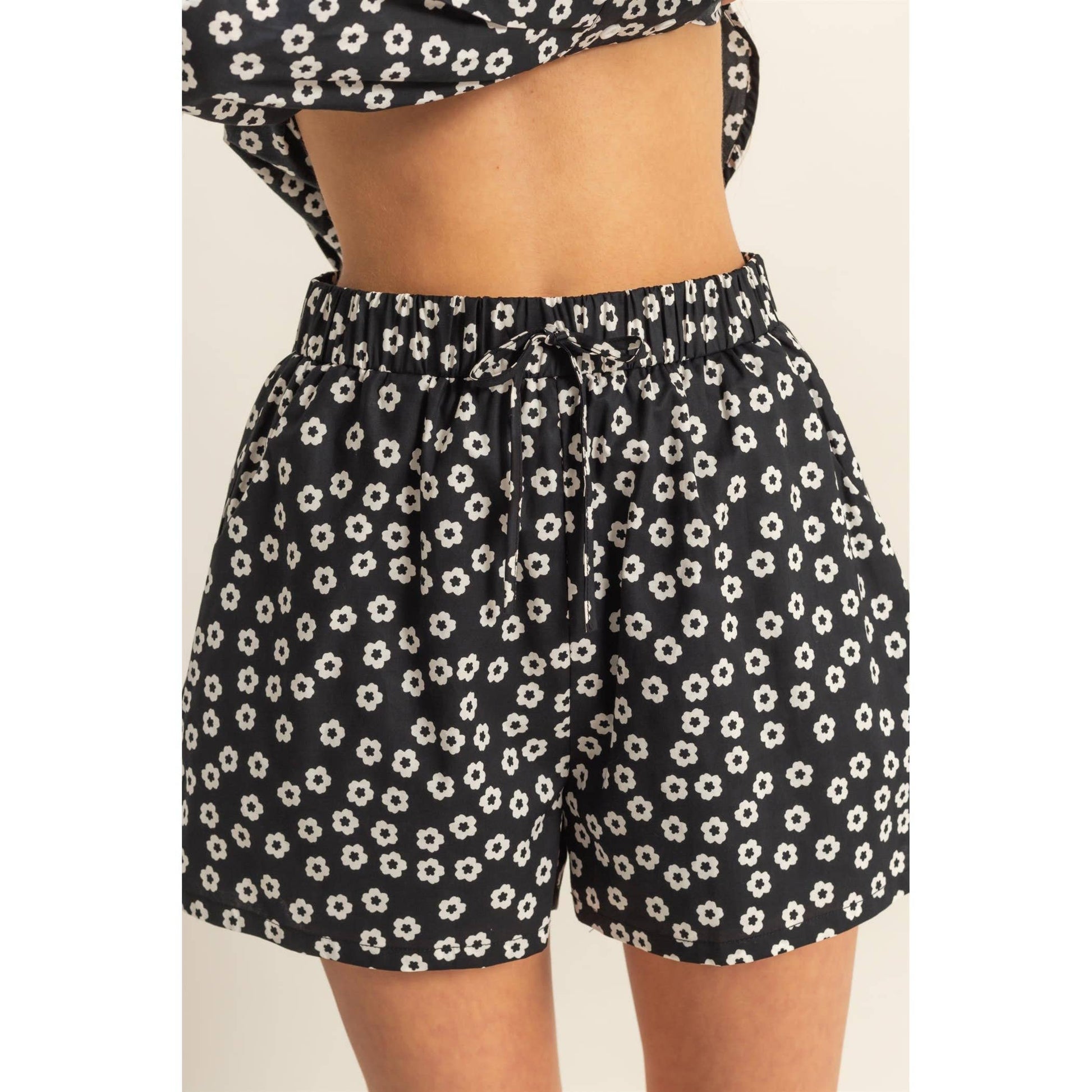 The Midnight Garden Set is a fun black and white floral button up with pull on shorts! The shirt is long sleeves with an oversized silhouette and higher cut slit on the sides. The matching shorts are a high rise fit with pull on waist.