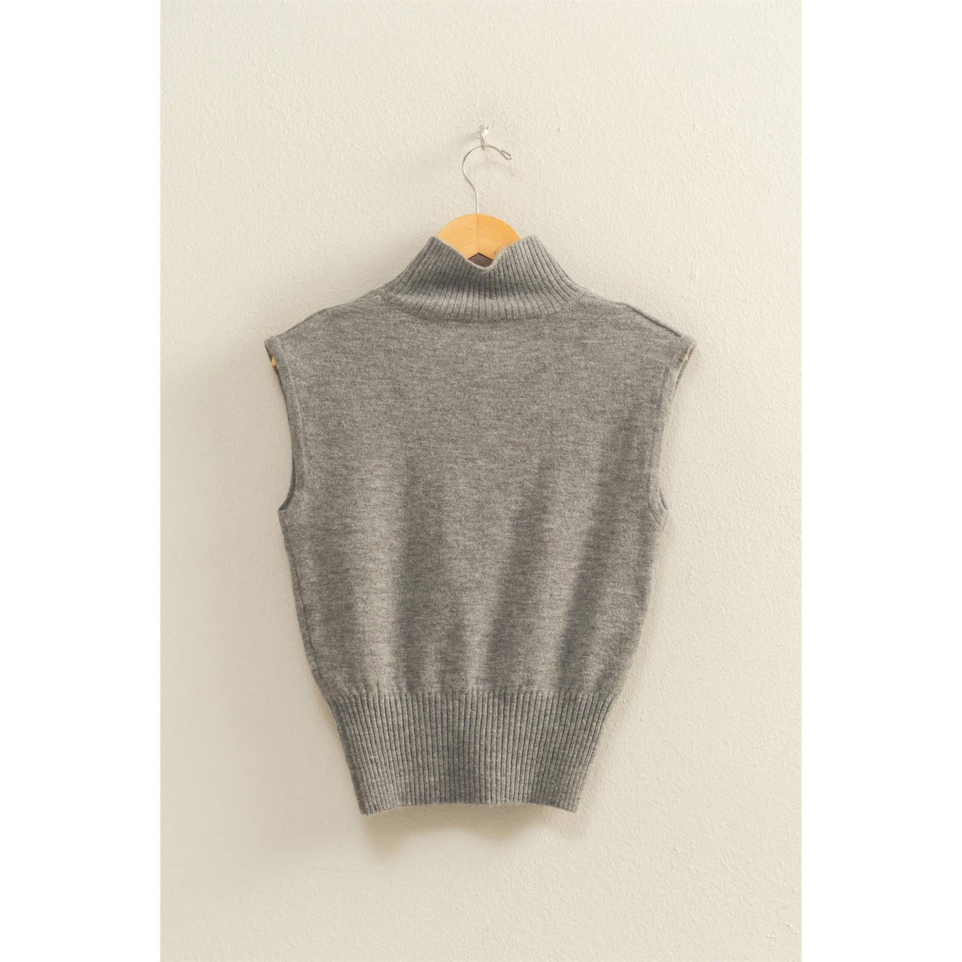 Embrace style with this sleeveless knit top featuring a fitted high neck and slightly extended shoulders for a relaxed, comfortable fit. The ribbed hem hugs the body for a sleek silhouette. Perfect for layering or wearing alone, it pairs effortlessly with skirts or trousers. Its minimalist design adds subtle sophistication, ideal for casual outings.