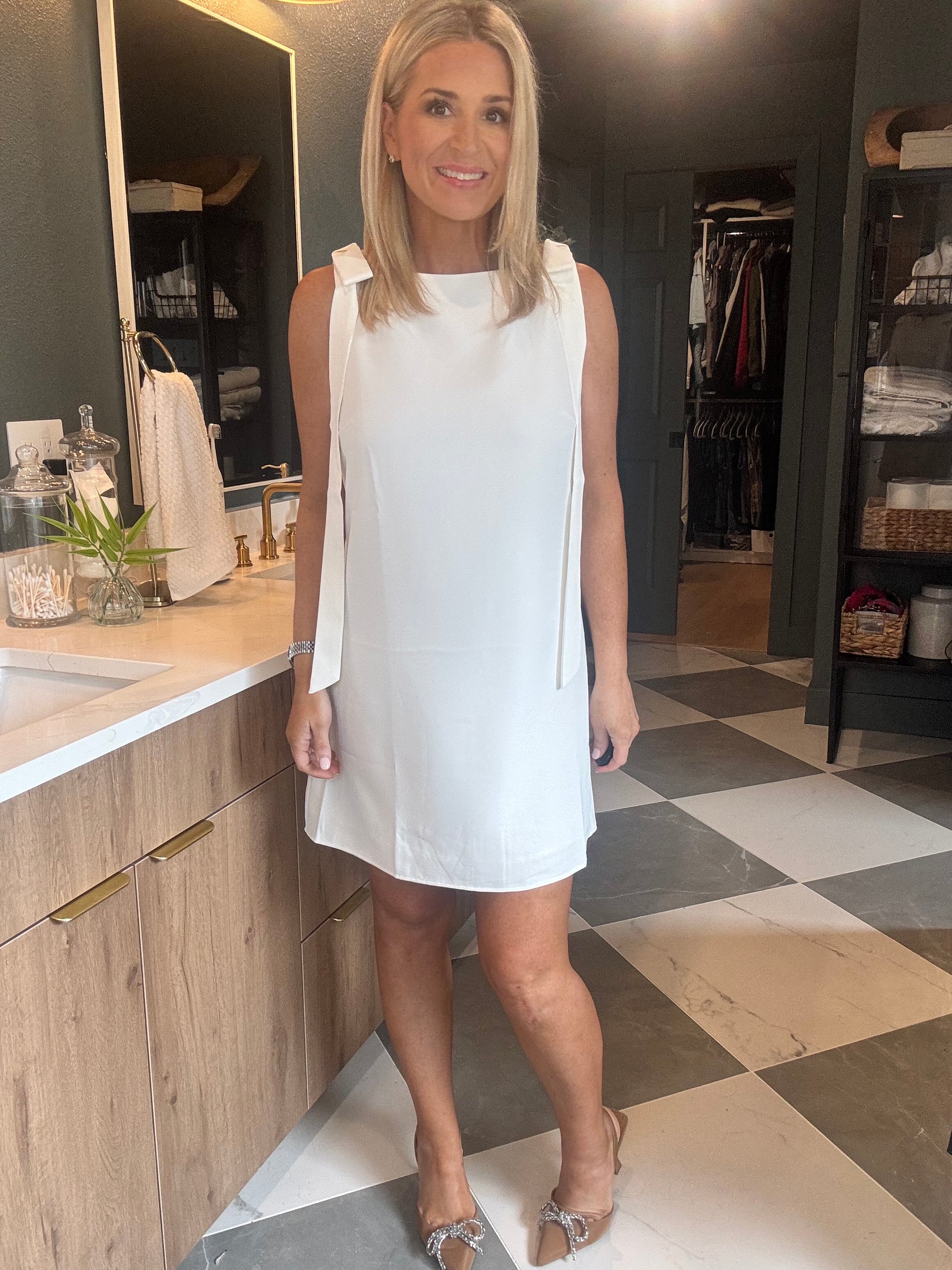 - Sleek A-line mini dress in soft ivory crepe fabric - Sleeveless silhouette with wide straps and bow detailing at shoulders - Clean boat neck - Draped side panels create elegant vertical lines - Hidden back zipper closure for a seamless fit - Fully lined for comfort and coverage - A chic and minimal option for parties, showers, and special events