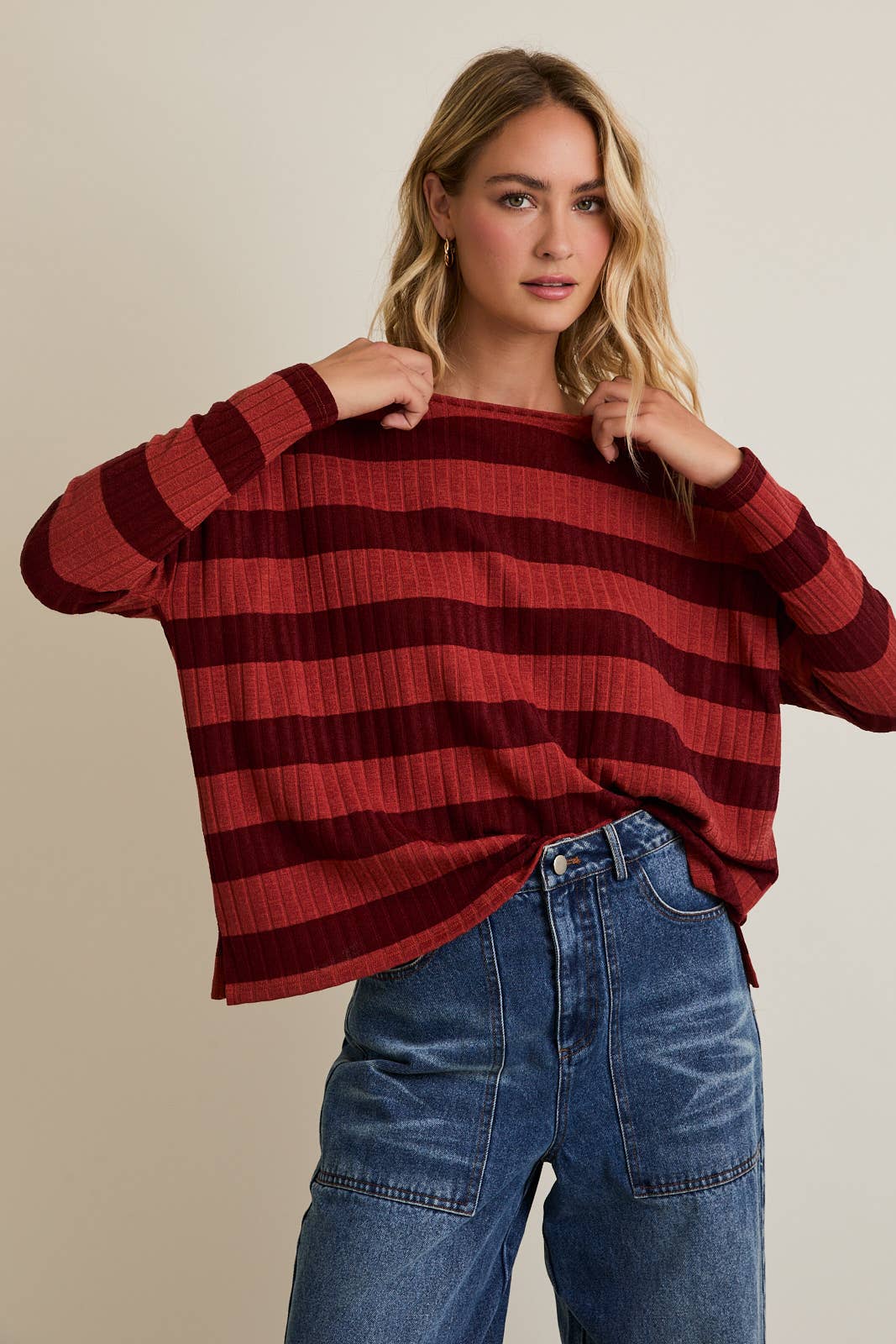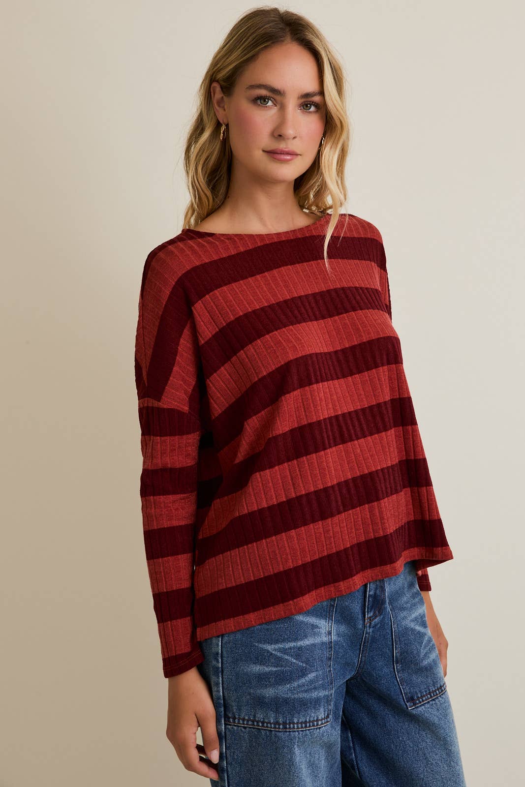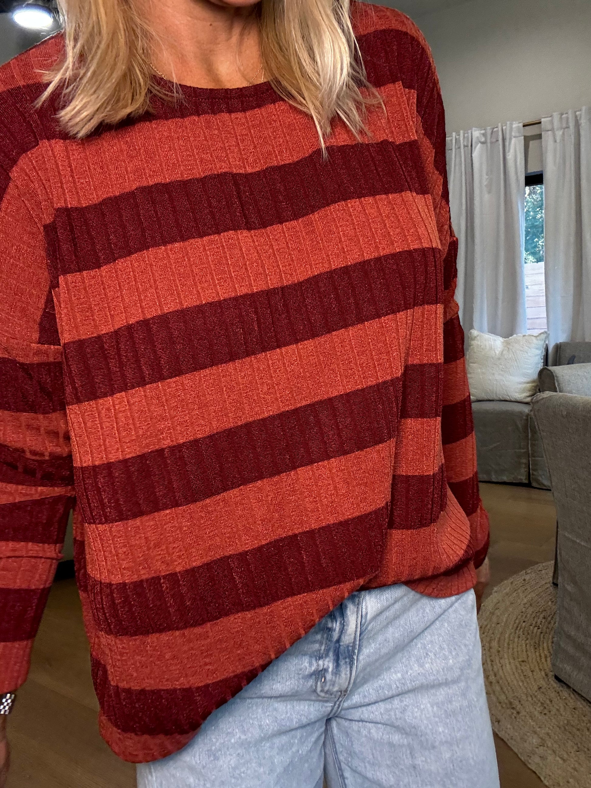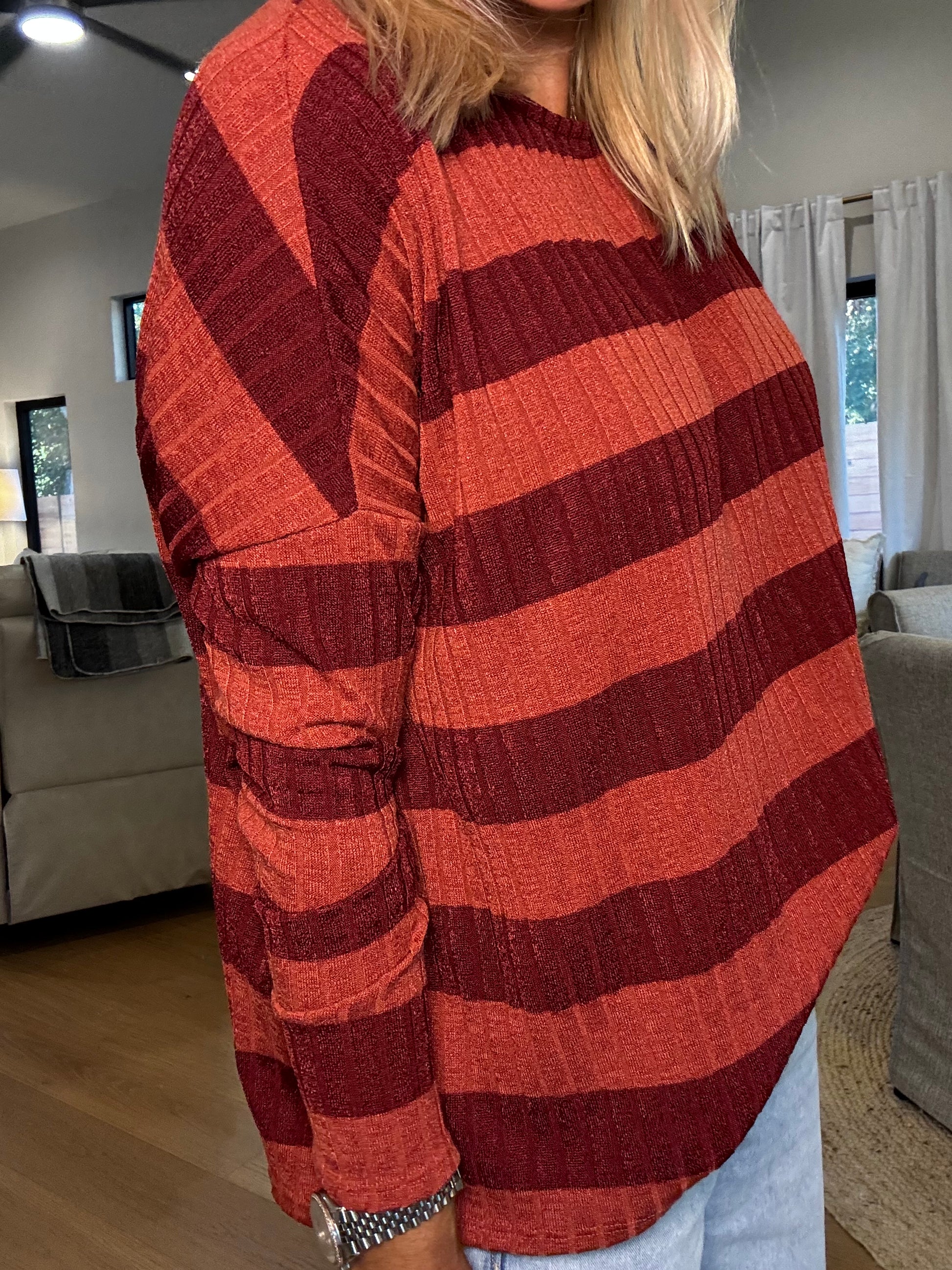 Cozy meets cool in the Kyle Top, featuring ribbed fabric in rich maroon and shades of red. Its long sleeves provide just the right amount of snug, making it perfect for laid-back days or casual hangouts. Slip into comfy style that adds a playful pop of color to your everyday look.