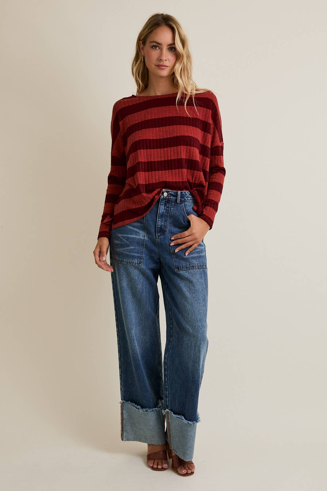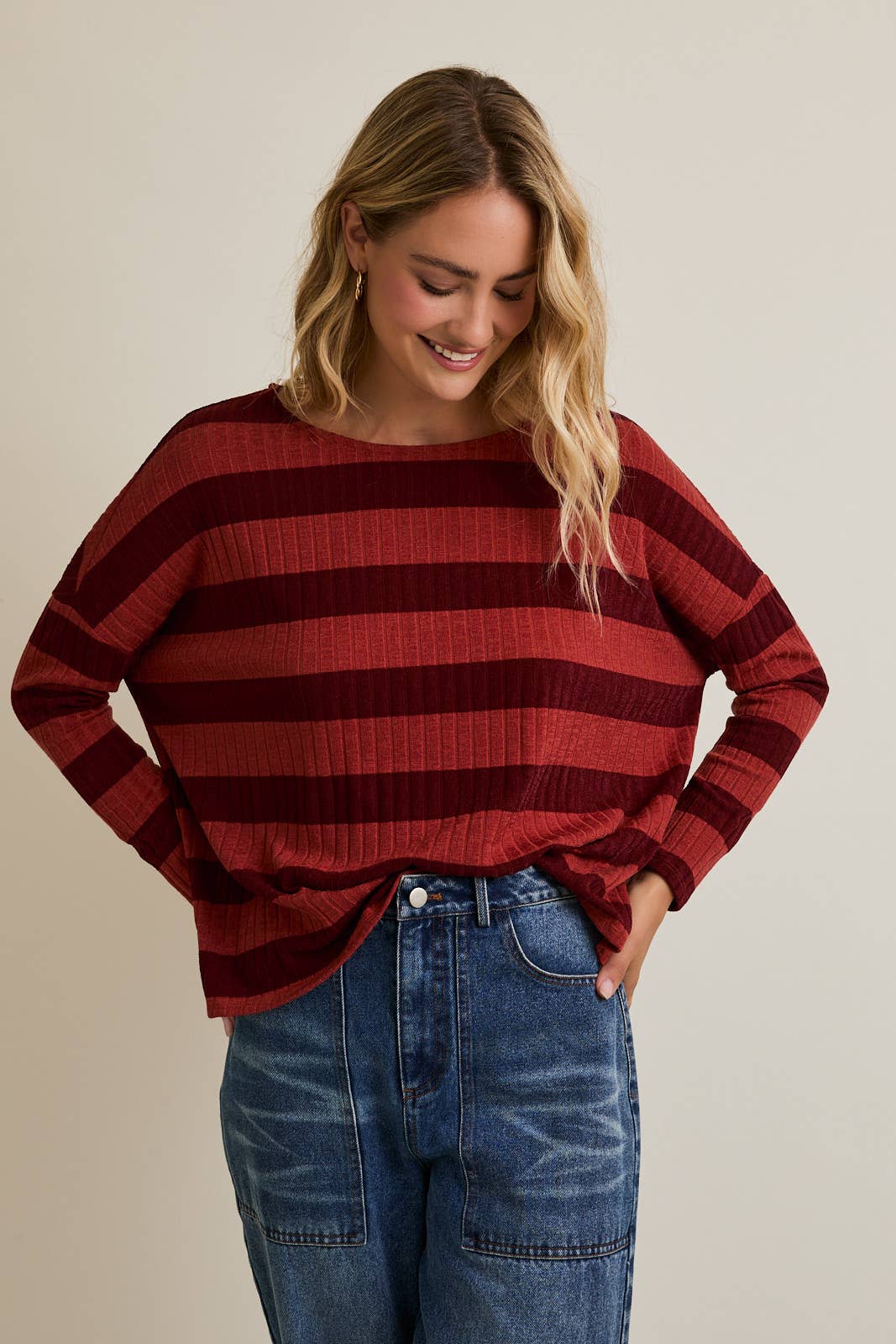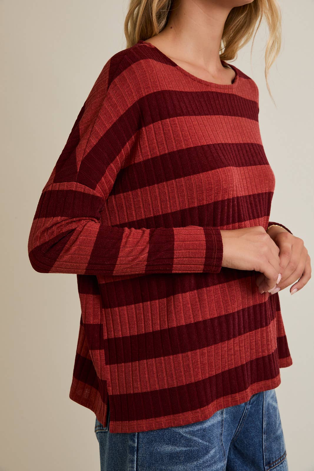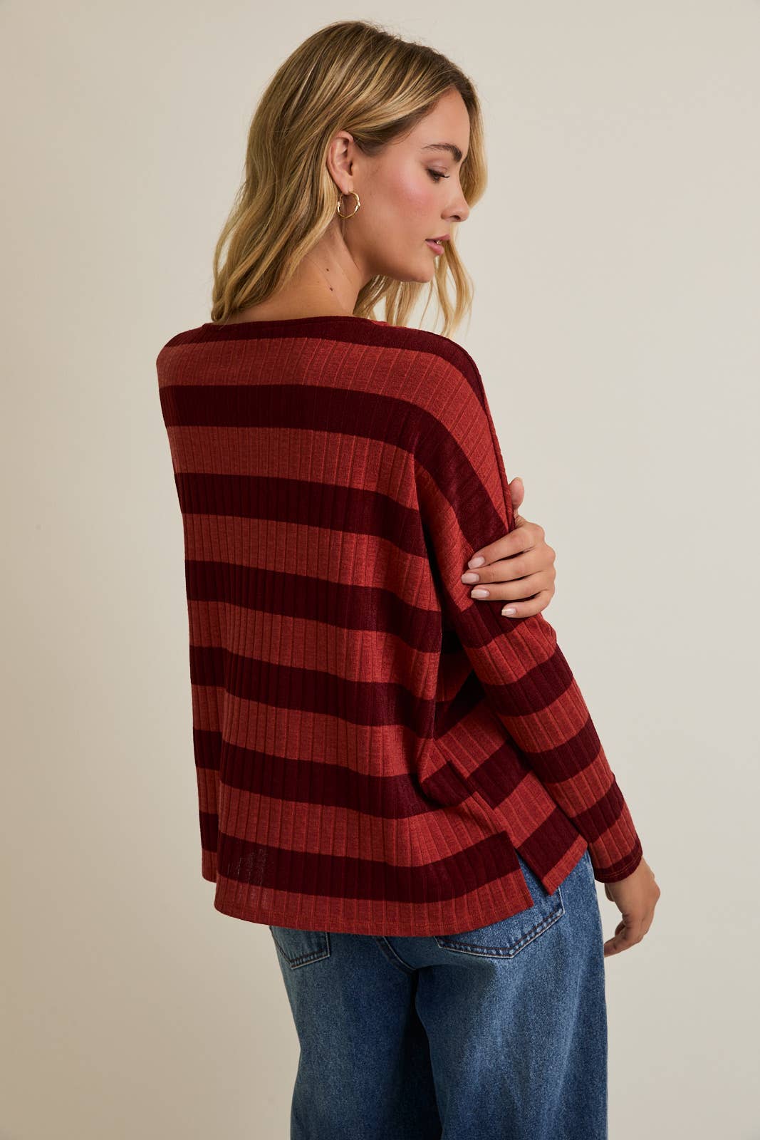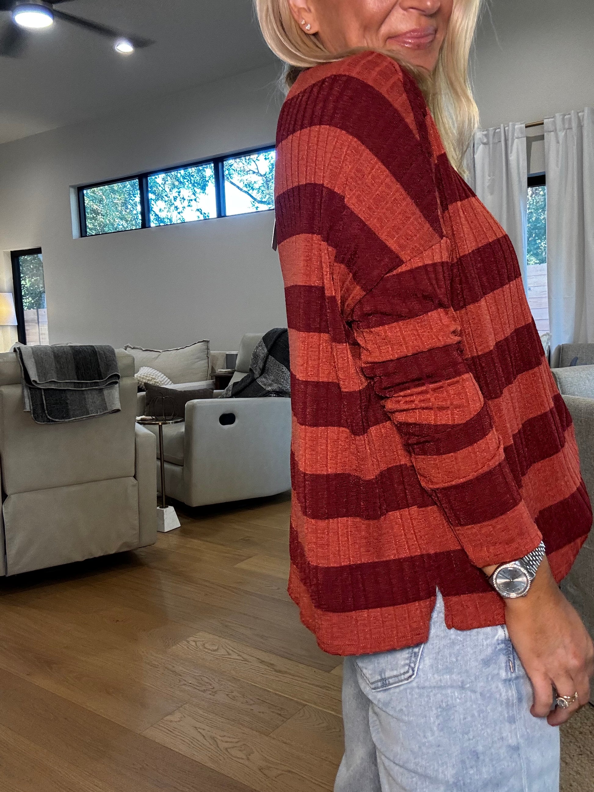 Cozy meets cool in the Kyle Top, featuring ribbed fabric in rich maroon and shades of red. Its long sleeves provide just the right amount of snug, making it perfect for laid-back days or casual hangouts. Slip into comfy style that adds a playful pop of color to your everyday look.
