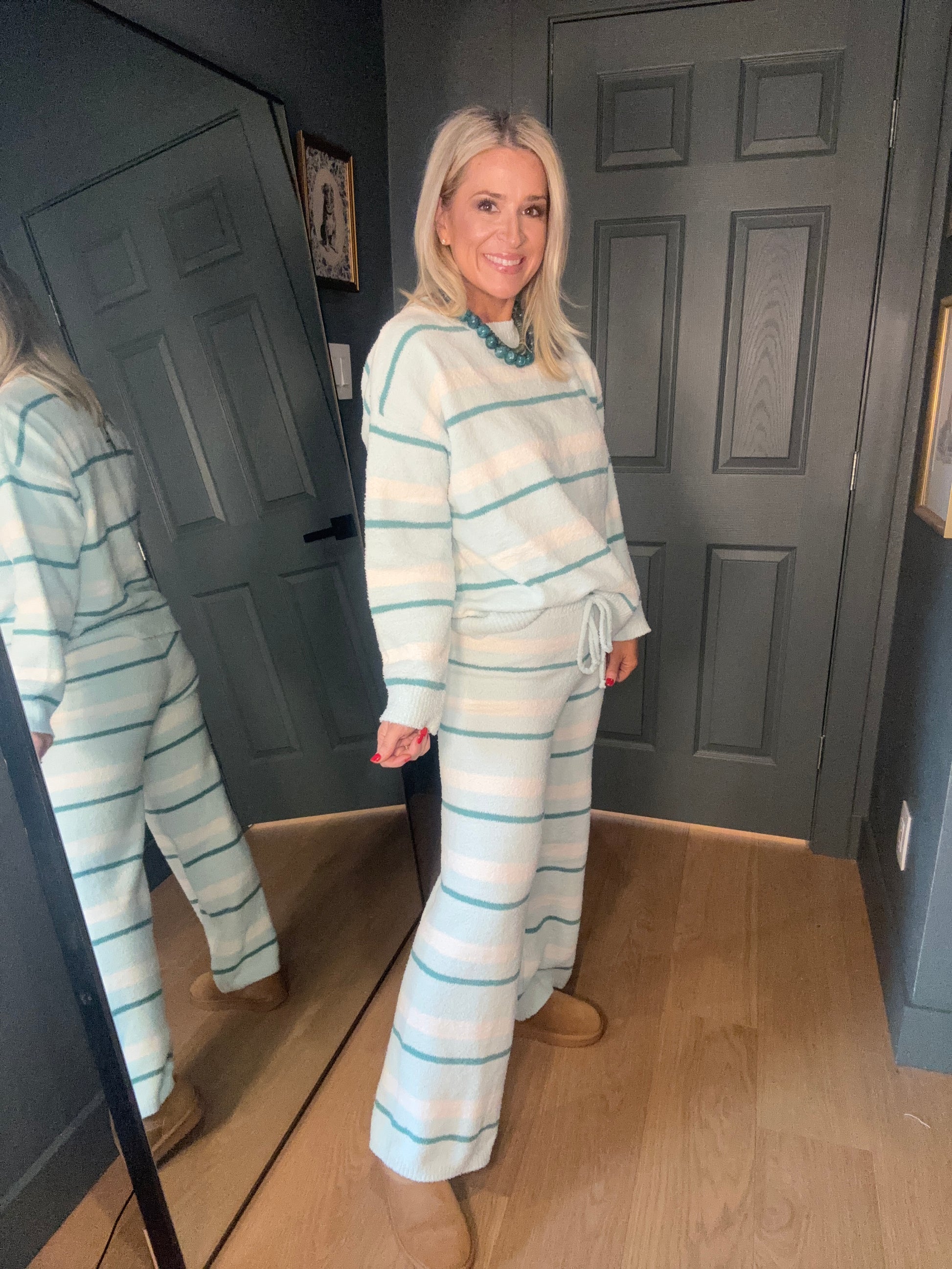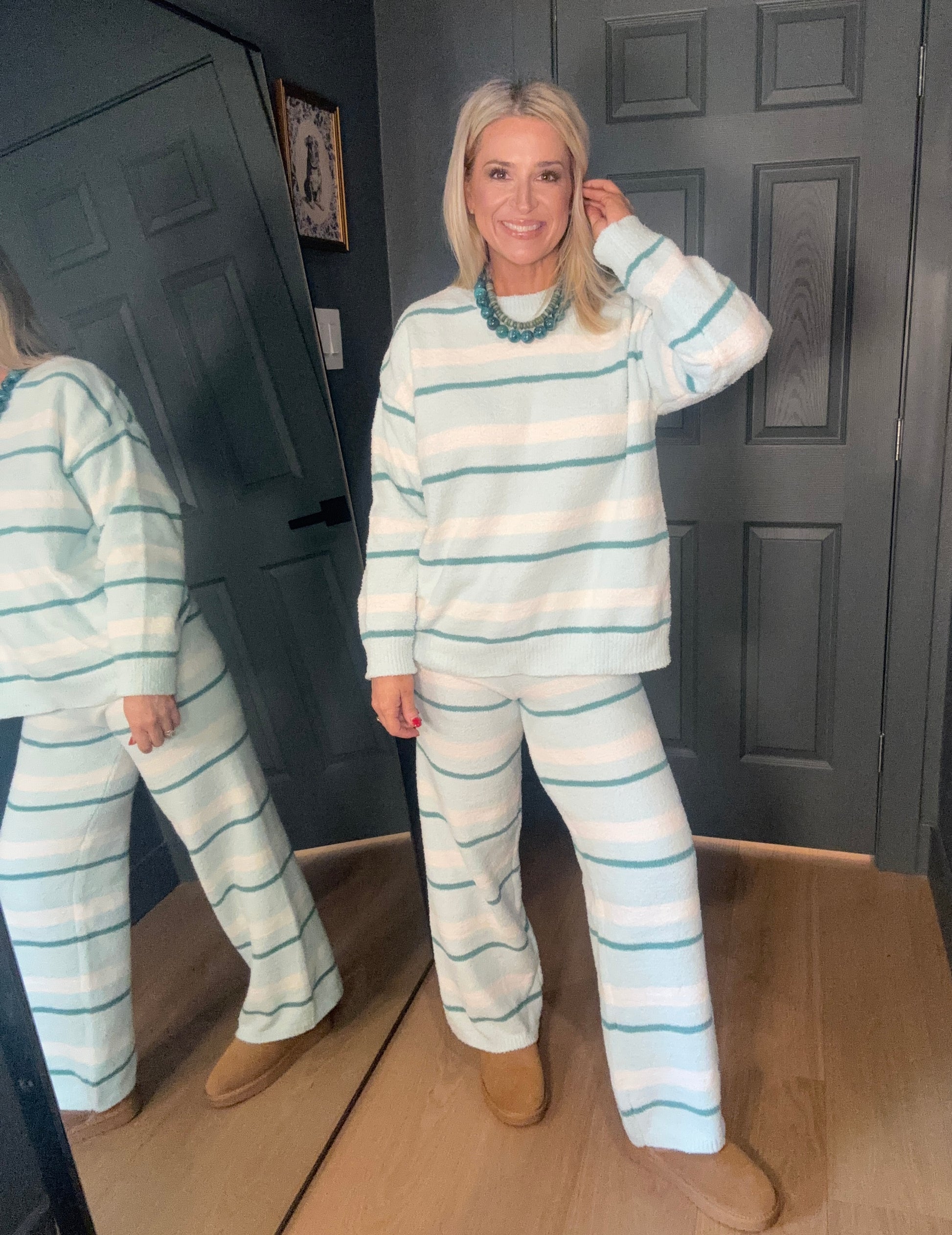 Dive into comfort with our Oceanside Set—a breezy teal and green striped sweater paired with matching pants that bring coastal vibes to your everyday wardrobe. The playful stripe pattern captures that relaxed seaside spirit, while the soft knit fabric keeps you cozy whether you're lounging at home or running errands around town. Mix-and-match ease meets effortless style in this coordinated two-piece set that feels like a vacation in your closet.