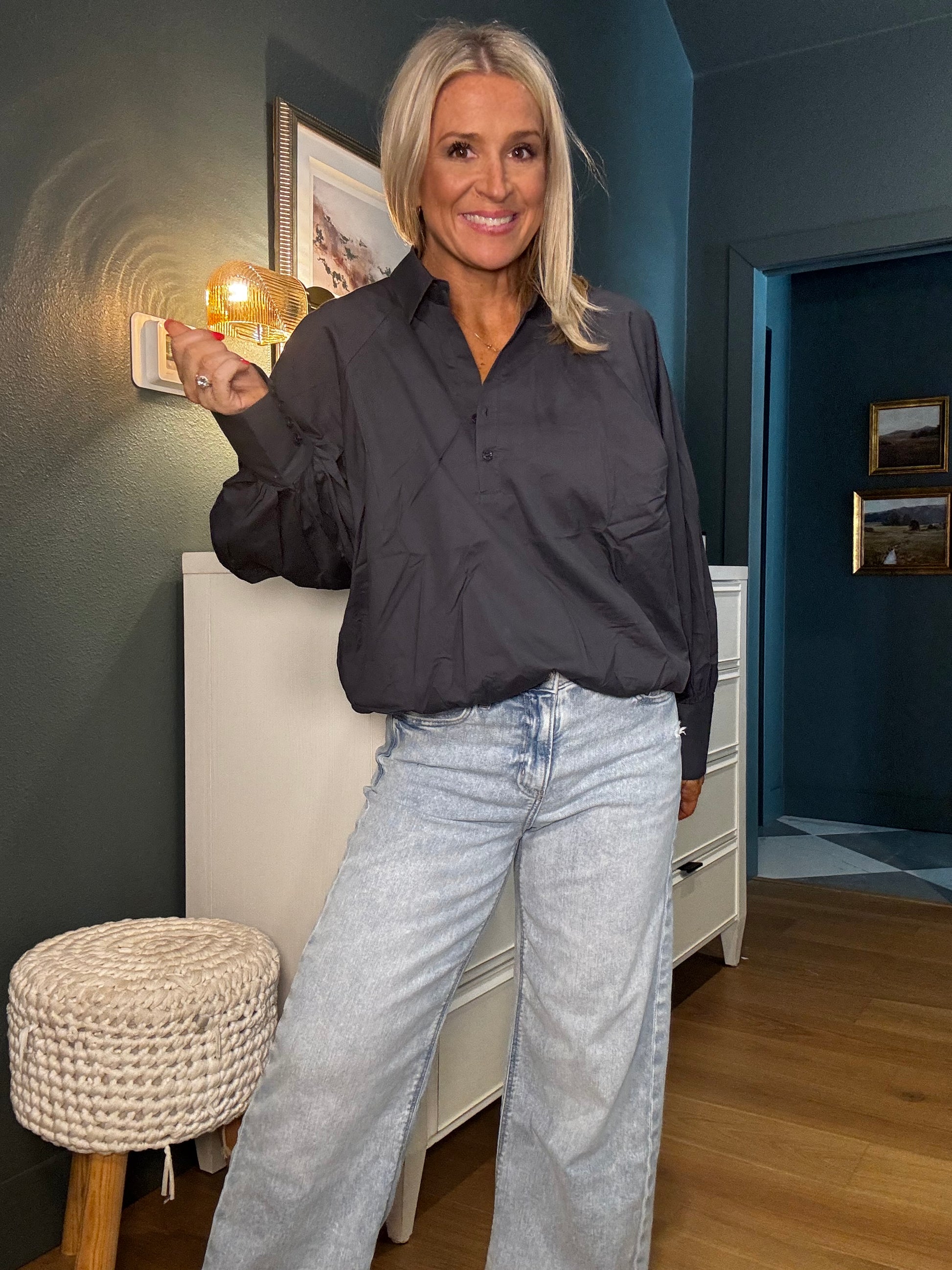 Embrace effortless charm with the Deep Blue Edit Top. This navy beauty features long sleeves with neat cuffs, a classic collared button placket, and a loose fit that offers all-day comfort. The playful shirring hem adds a flirty twist, perfect for twirling through your day in style. Whether dressed up or down, this top is your go-to for easy elegance with a dash of fun.