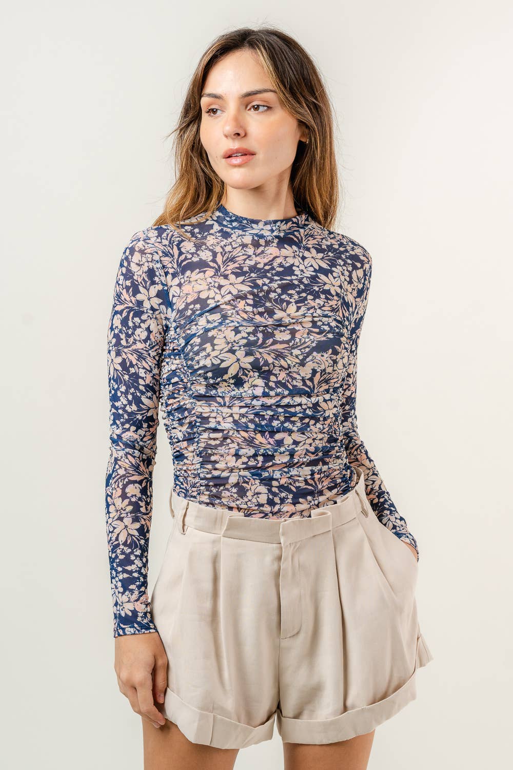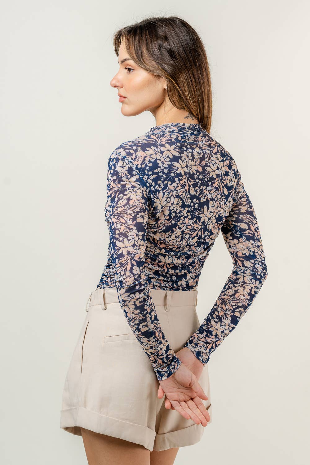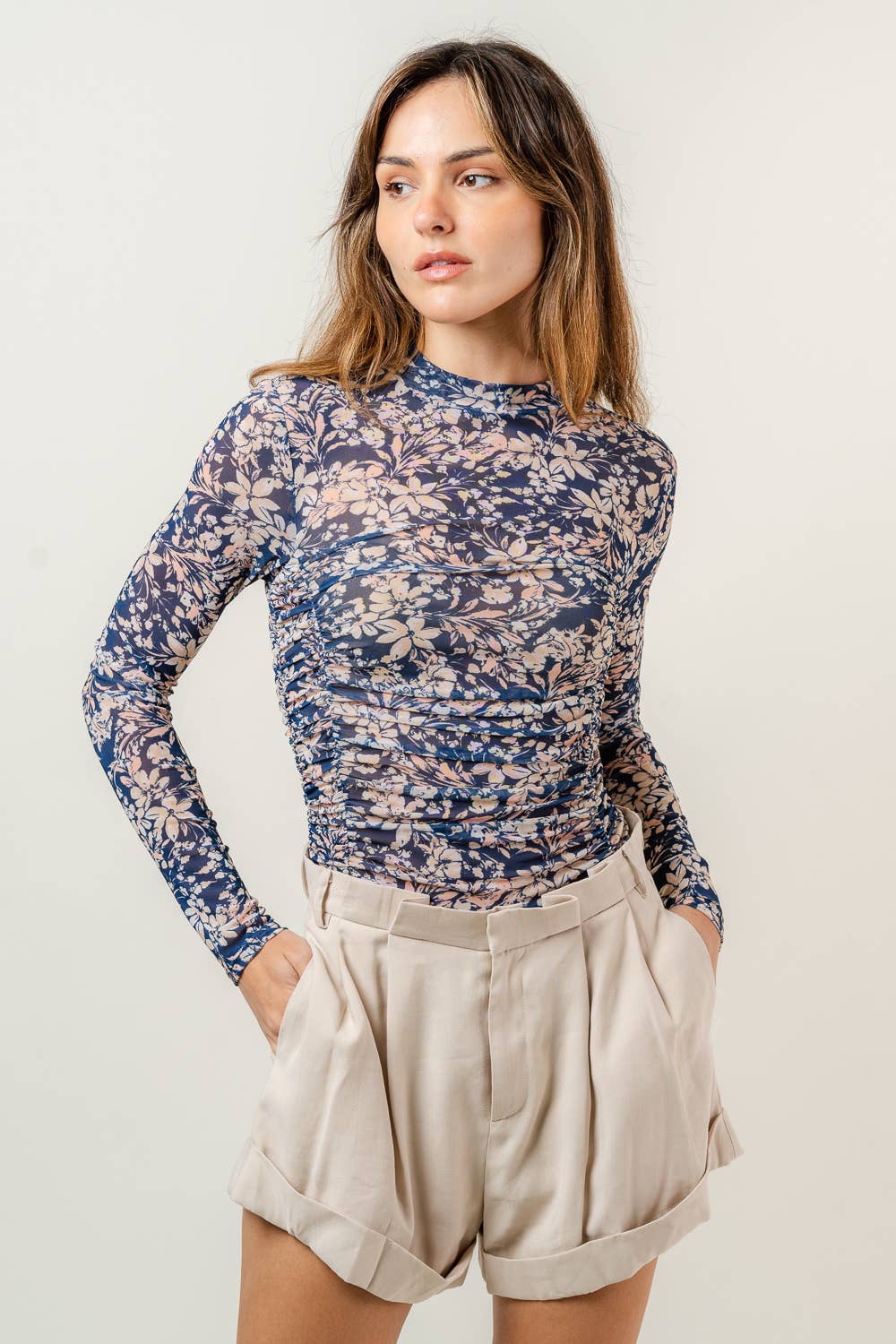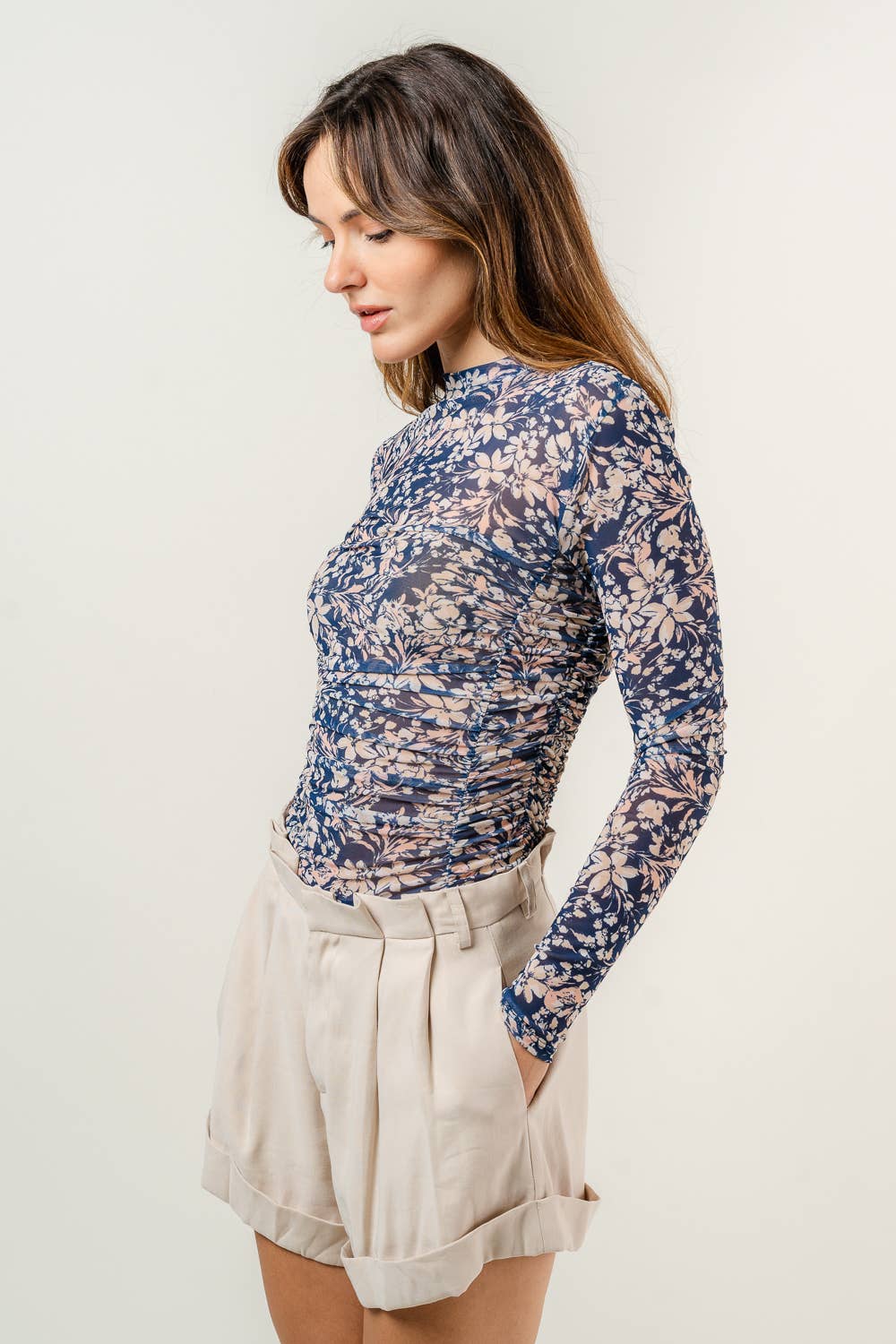 Check out this stunning Low Turtle Neck Long Sleeve Ruched Mesh Bodysuit. It features a mock neckline, long sleeves with a ruched mid-section, and a lovely floral print. The bodysuit is made of mesh with a thong bottom and is secured with a double snap closure.