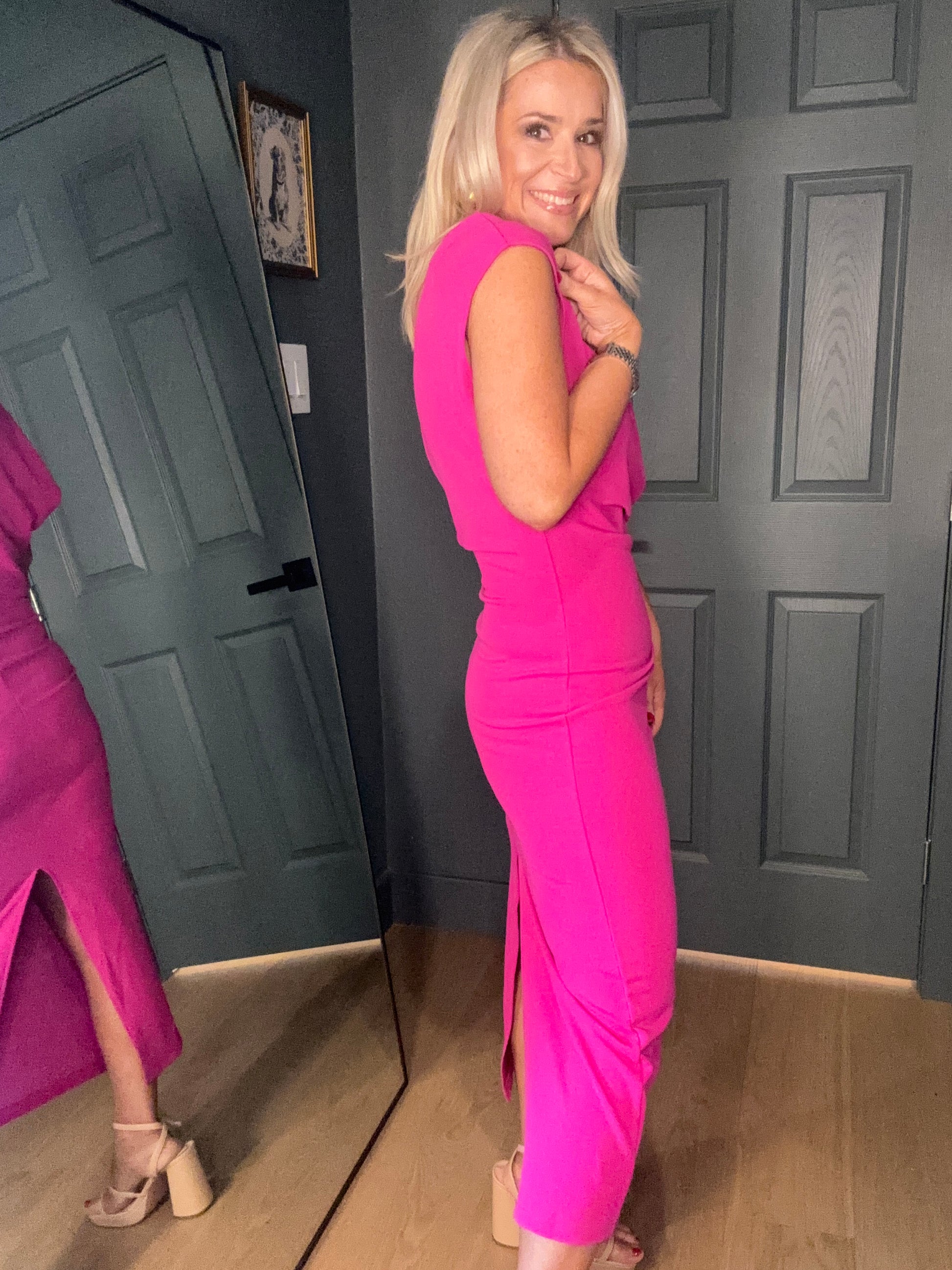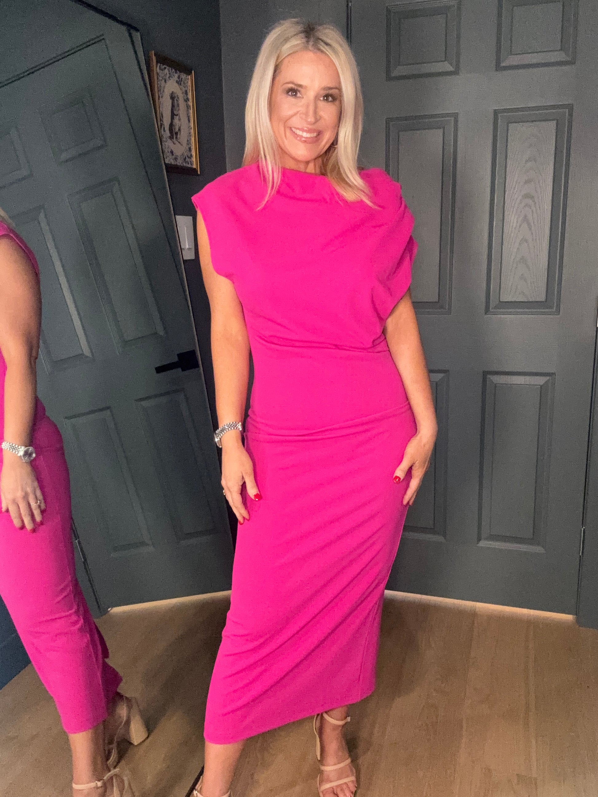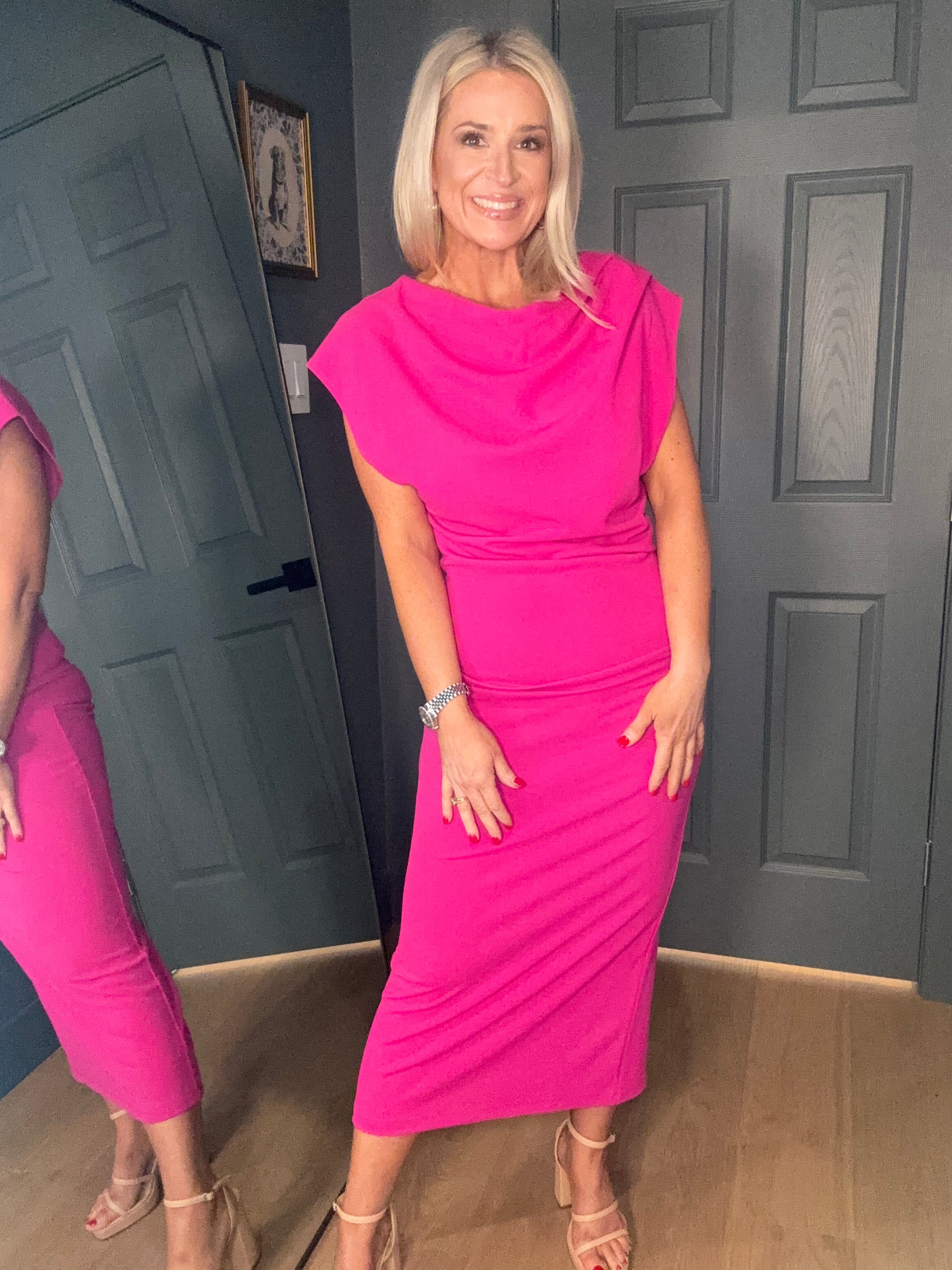 Elevate your evening wardrobe with this striking magenta midi dress. The graceful cowl neckline creates an elegant drape, while cap sleeves offer refined coverage. A subtle back slit adds movement and sophistication to every step. Perfect for cocktail events, dinners, or any occasion calling for polished style.