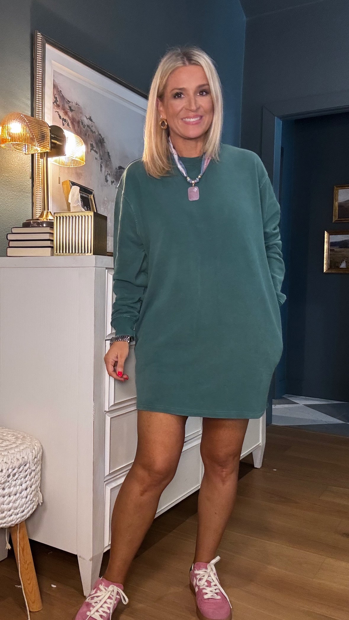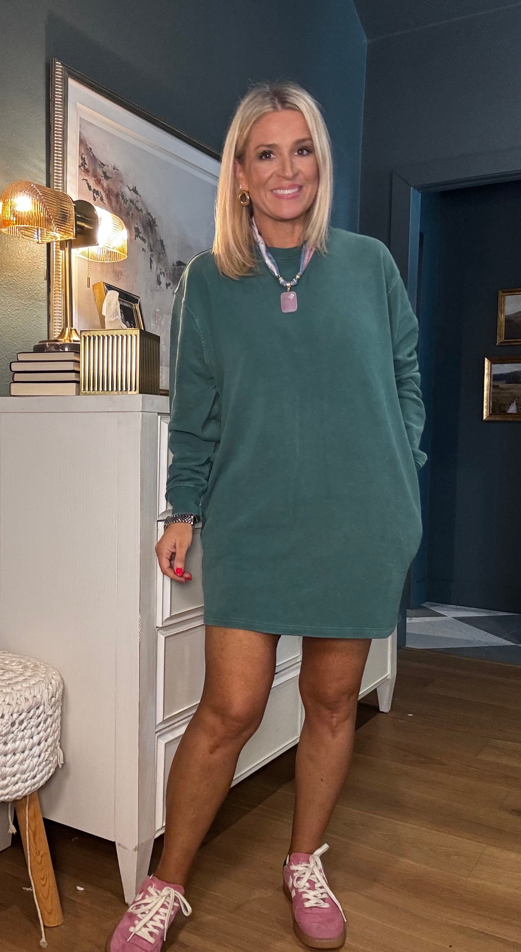 Embrace cozy comfort with this oversized sweatshirt dress. Designed for a relaxed fit, this dress features dropped shoulders and long sleeves, making it perfect for lounging or casual outings. The soft, washed fabric adds a touch of vintage charm, while the simple, clean lines make it a versatile addition to your wardrobe. Pair it with sneakers or boots for an effortless, stylish look. Self: 80% Cotton 20% Polyester