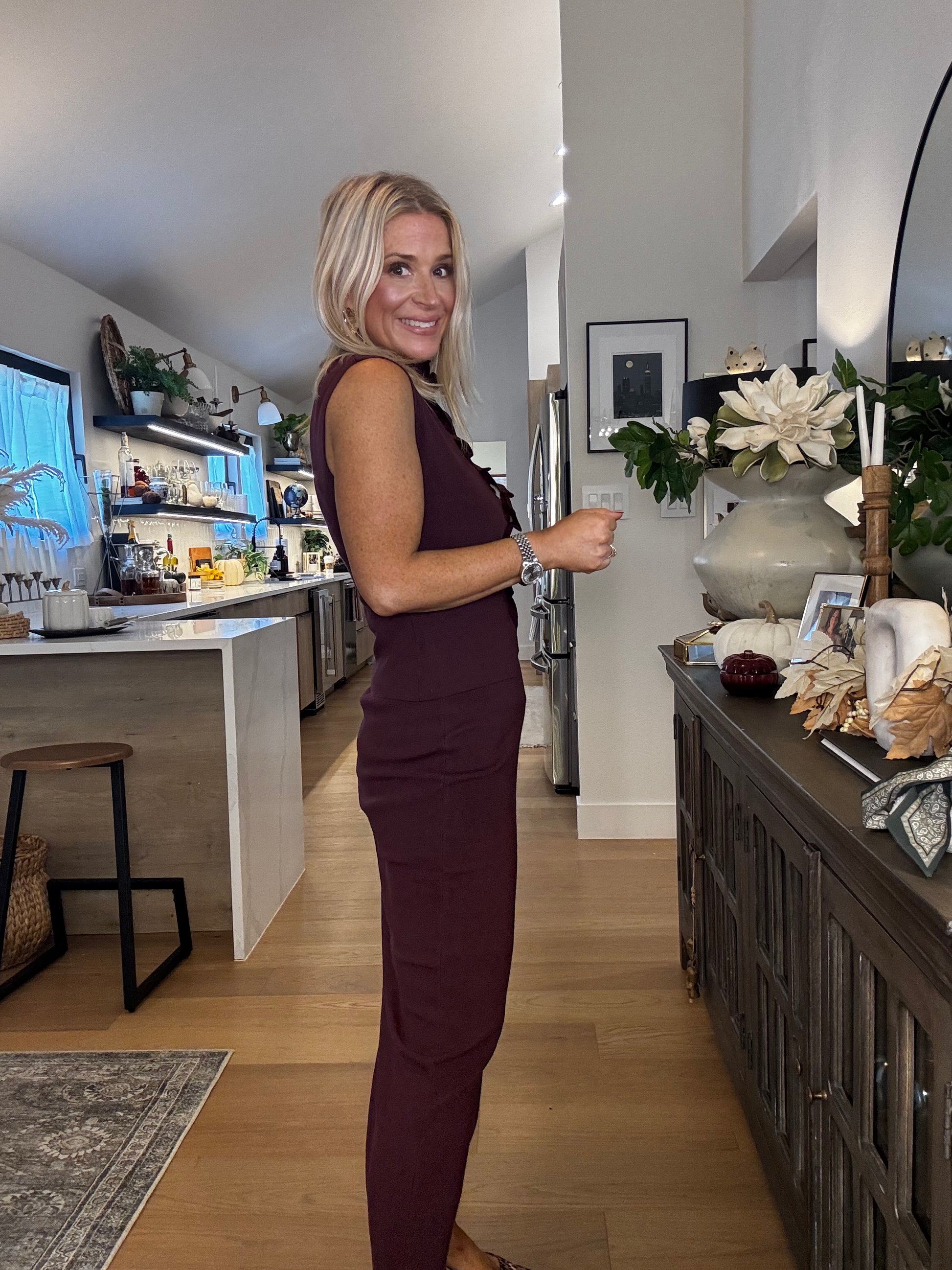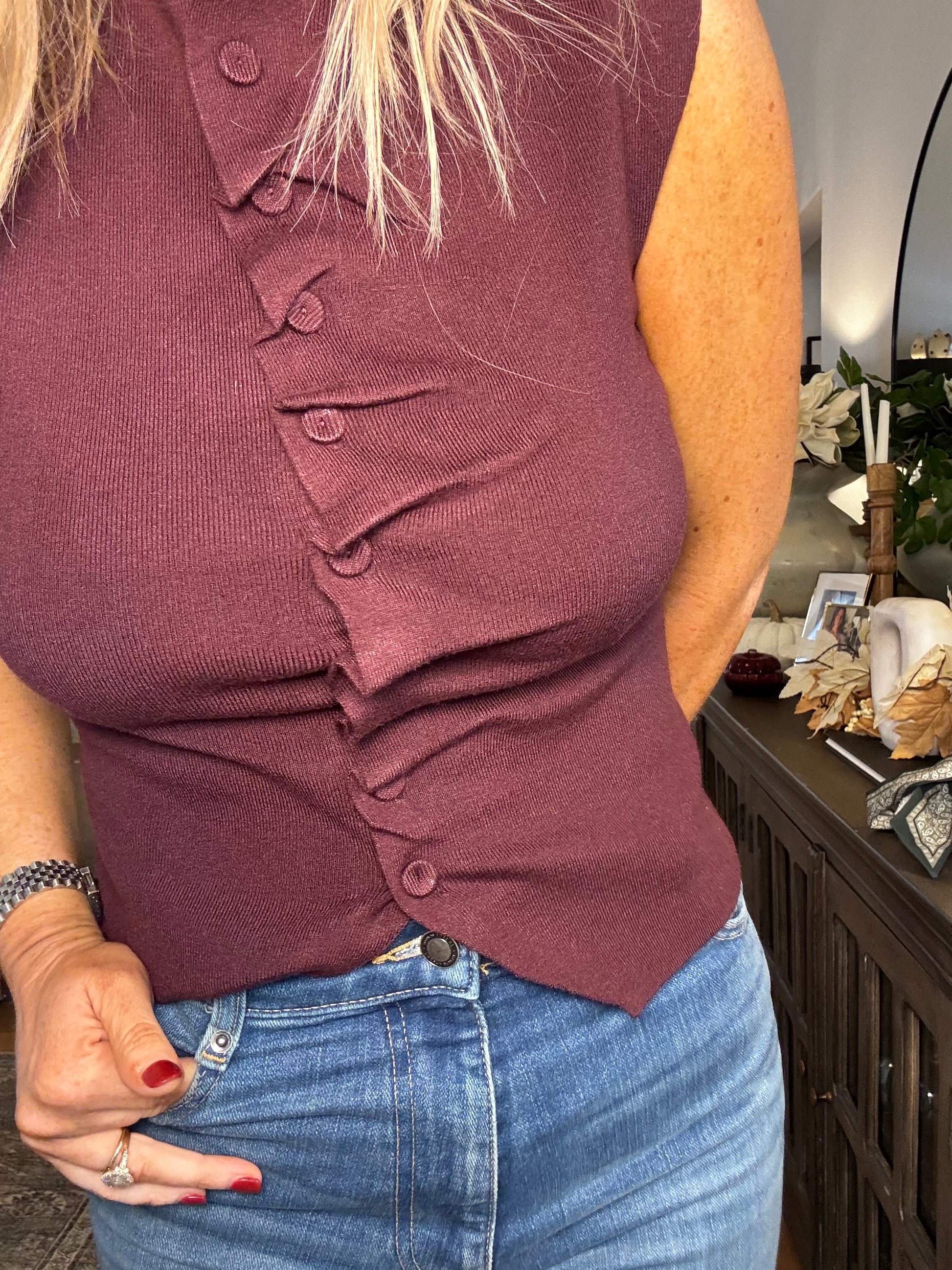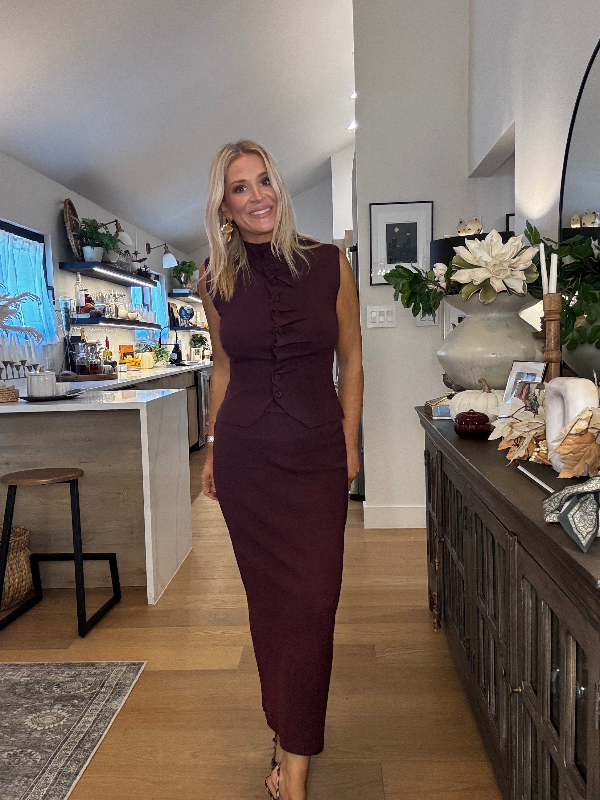 This playful Ruched Plum Set features a sleeveless sweater top with charming ruching at the buttons and a matching skirt. Perfect worn together or as separates, the rich plum color adds a vibrant pop to your wardrobe, offering versatile style for any occasion.