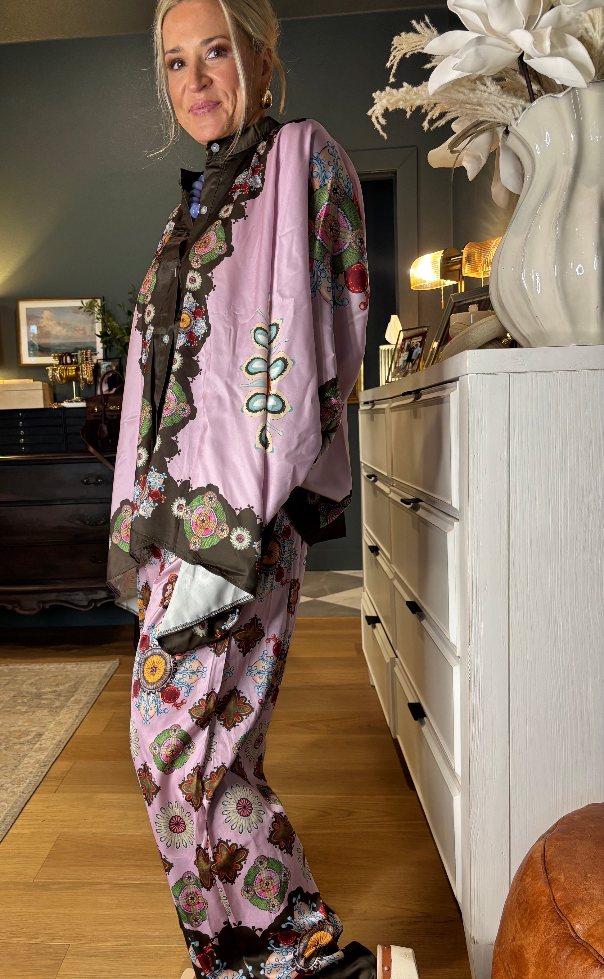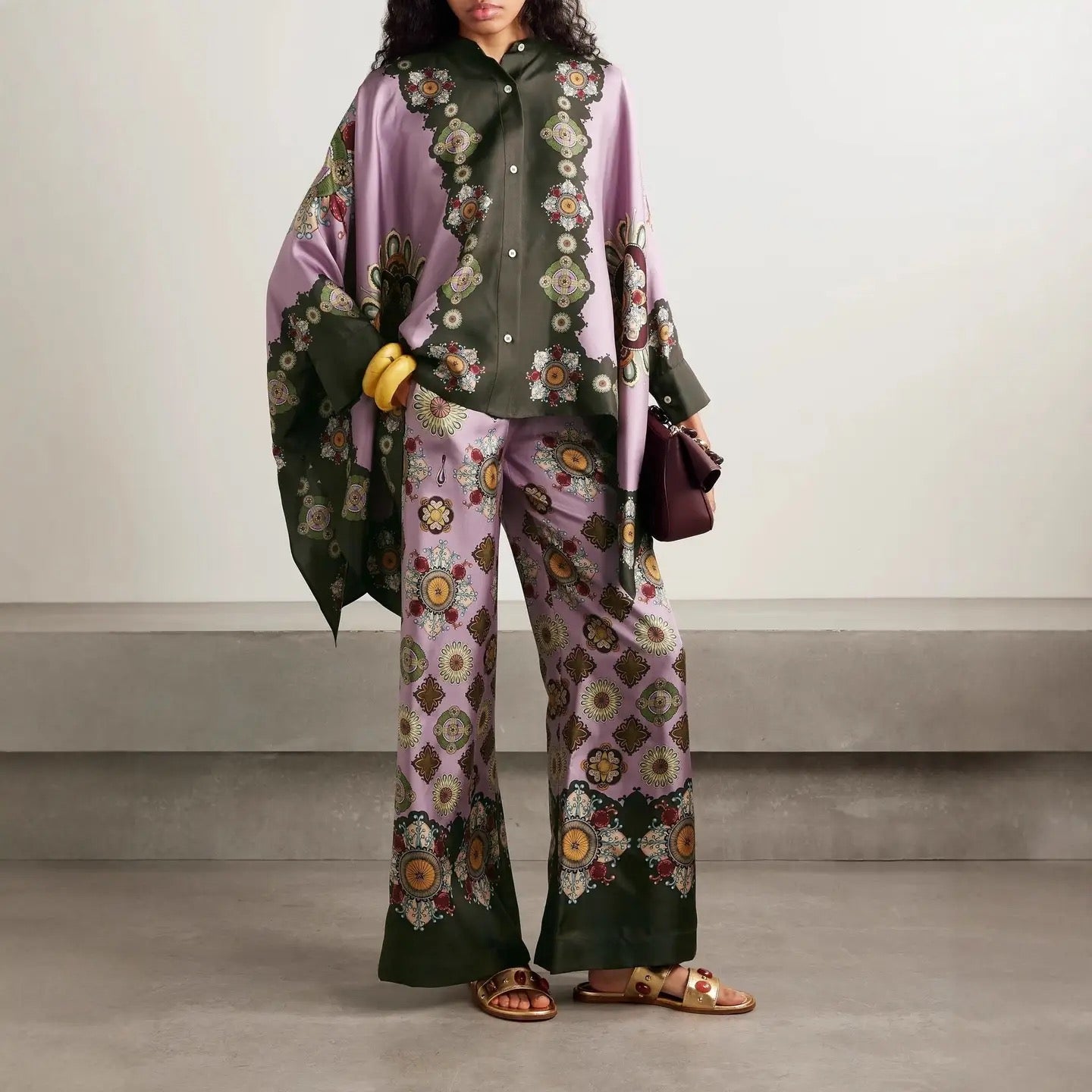 Embrace a retro charm with our Vintage Floral Satin Two-Piece Set, designed to bring comfort and style to your everyday wear. This set features a loose-fitting top with elegant batwing sleeves and wide-leg pants, perfect for casual outings or relaxed events. The luxurious satin fabric adds a touch of sophistication, while the floral print brings a vibrant flair. Key Features: Premium satin fabric for a smooth feel Comfortable loose-fit design * Long sleeves with batwing style * Stylish floral print for a trendy look * Easy to care for; machine washable