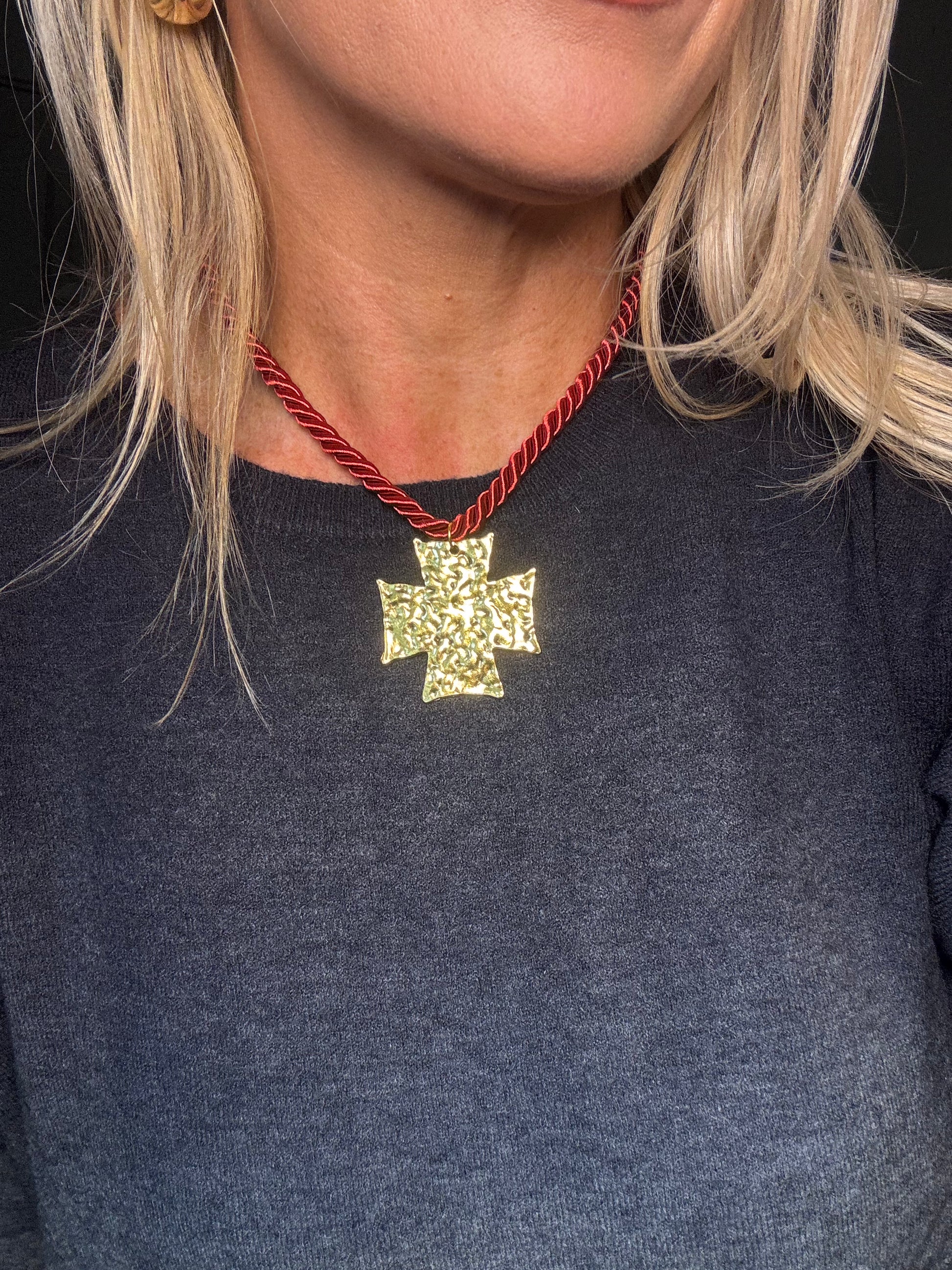 Deep red rope style necklace with adjustable chain and beautiful hammered cross pendant.