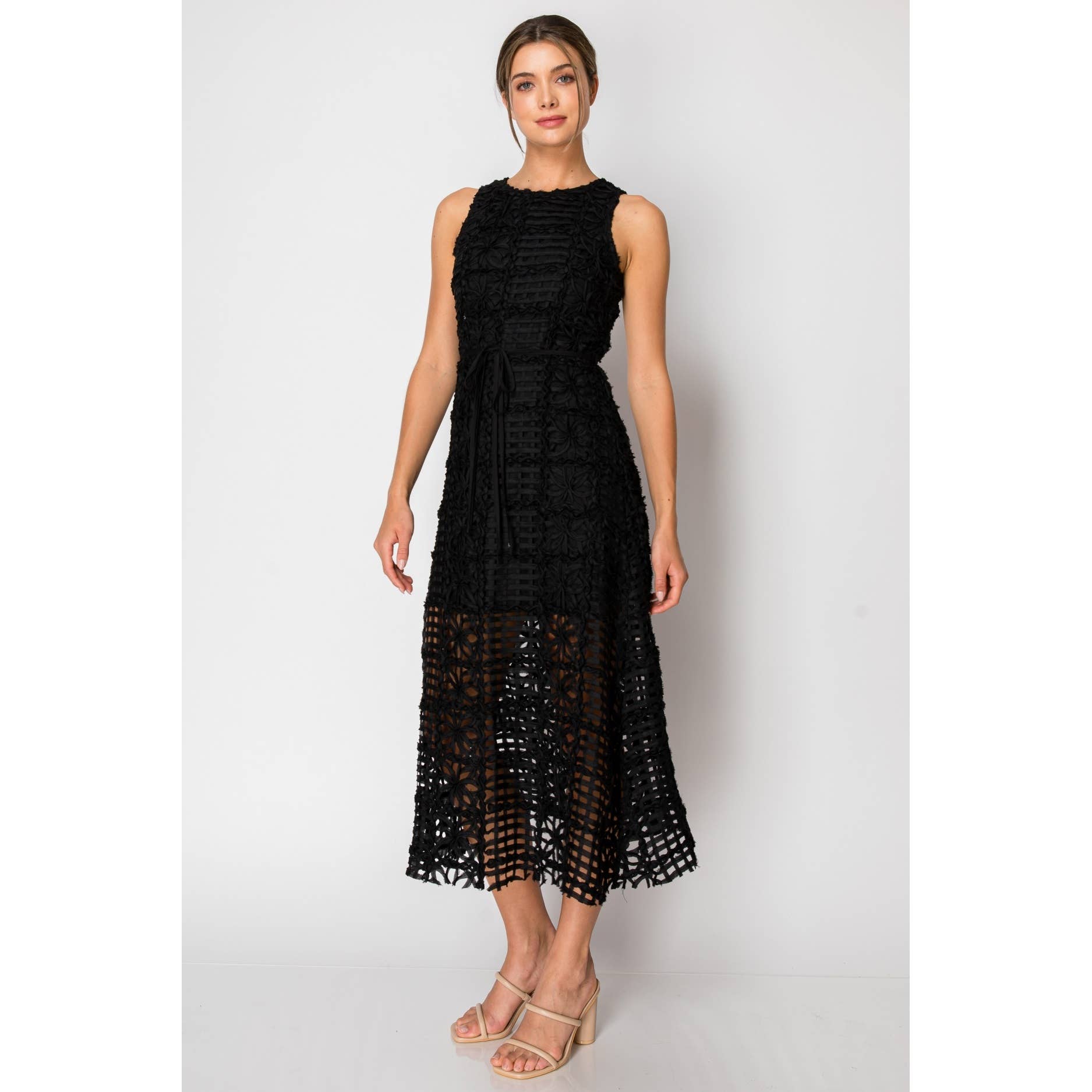 This sleeveless midi dress features delicate crochet lace and a self-tie detail for a flirty touch. It fastens with a hook-and-eye and a concealed back zipper, making it perfect for turning heads at special events or adding a stylish twist to your daytime look.