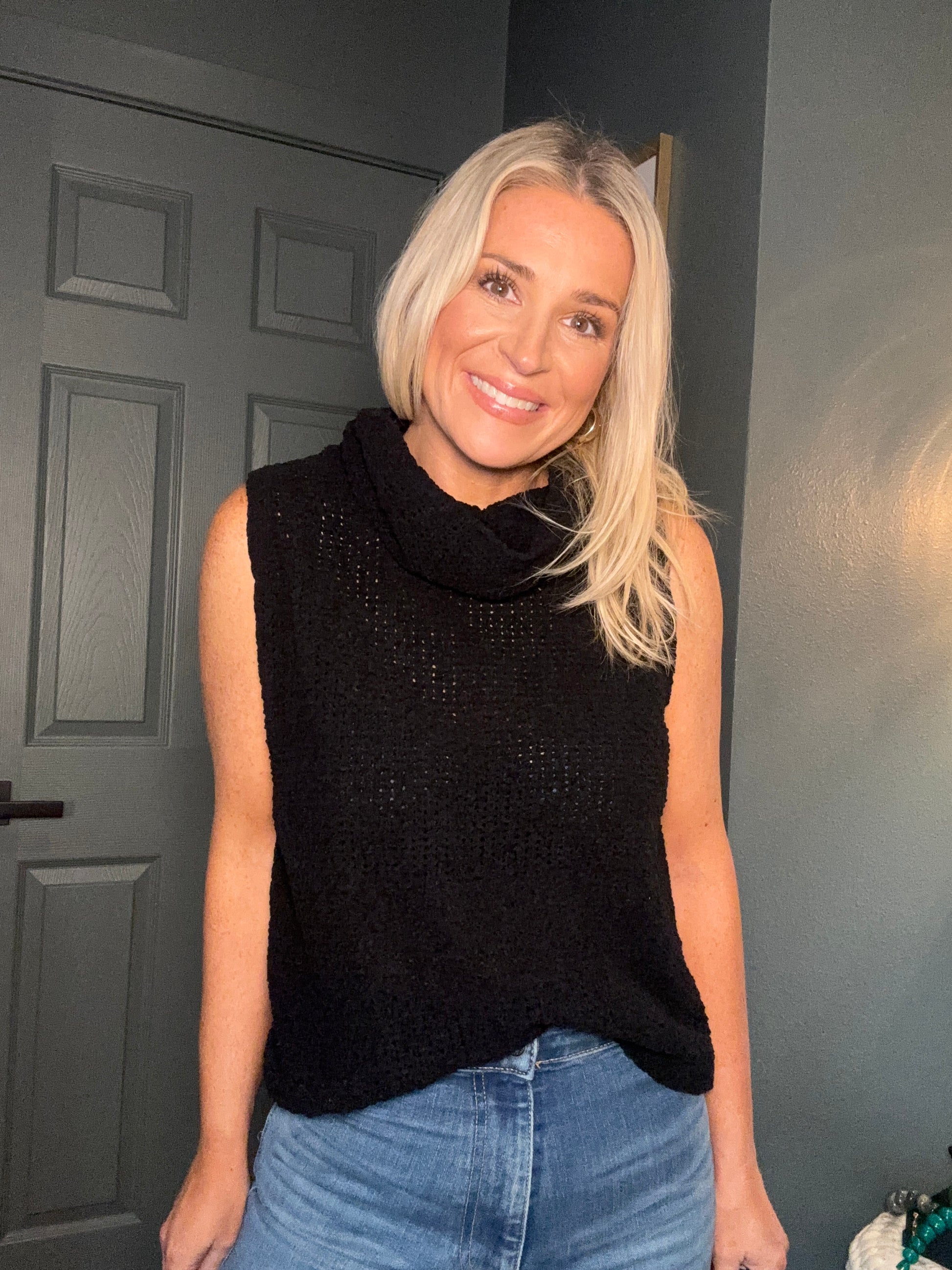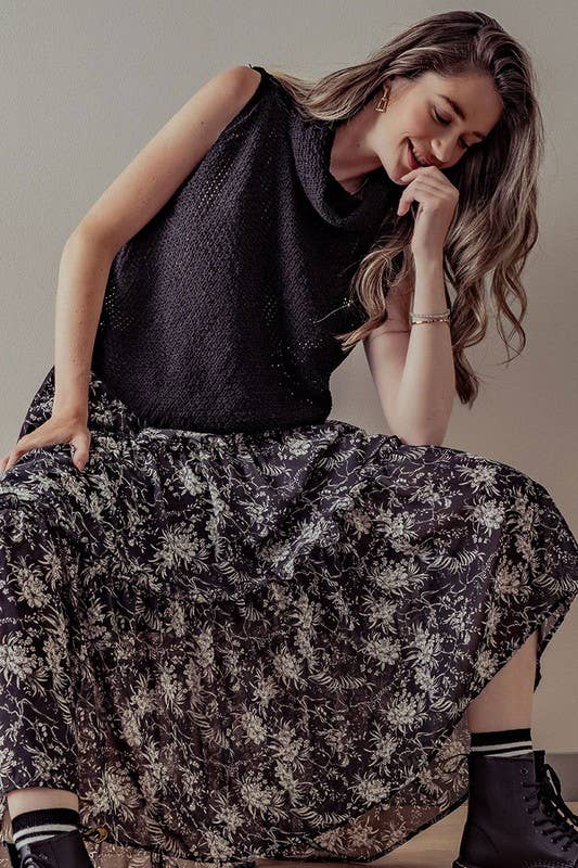 The Tesney Top is a playful twist on summer style with its sleeveless design and flattering cowl neckline. Crafted in sleek black crochet, it offers a breezy texture that's perfect for warm days or layering under your favorite jacket. This top brings a touch of fun and elegance to your wardrobe, making it an easy go-to for casual outings or evening fun.