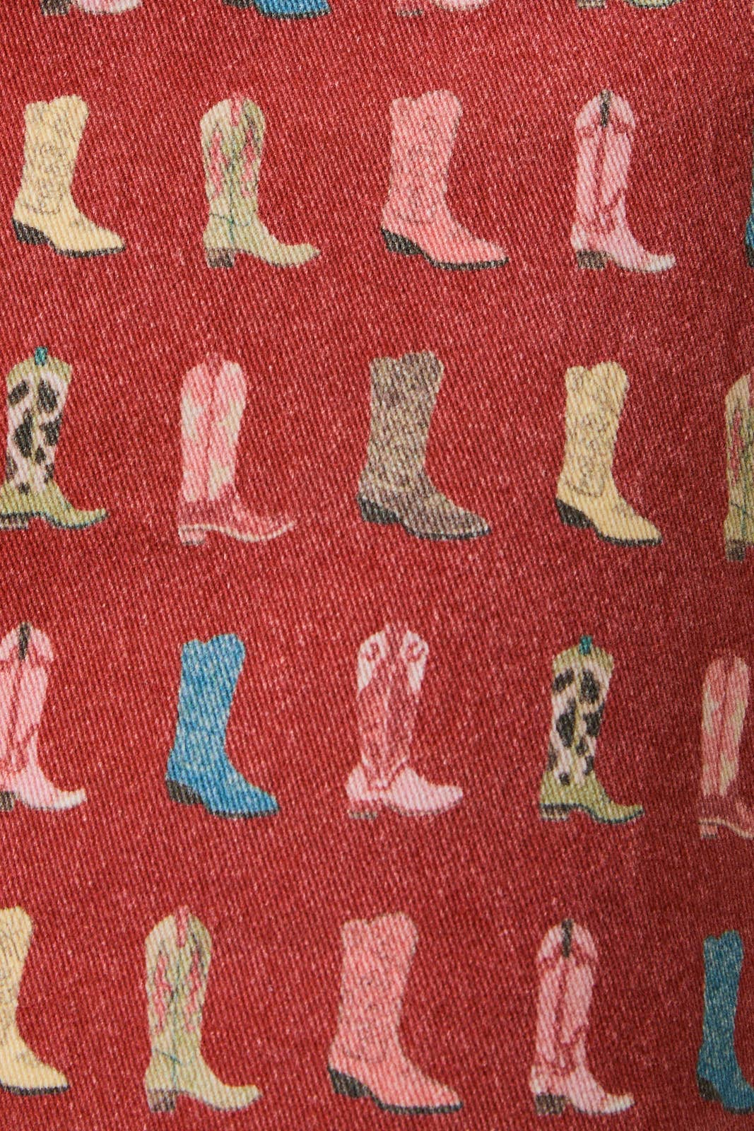 Bring a splash of rodeo fun to your wardrobe with the Dunn Mini Skirt. Crafted from vibrant red denim, this playful skirt features a colorful boot print that adds a lively, western-inspired touch. Perfect for dancing, casual outings, or making a bold statement, it combines comfort with eye-catching style. Embrace your adventurous side with this spirited mini skirt!