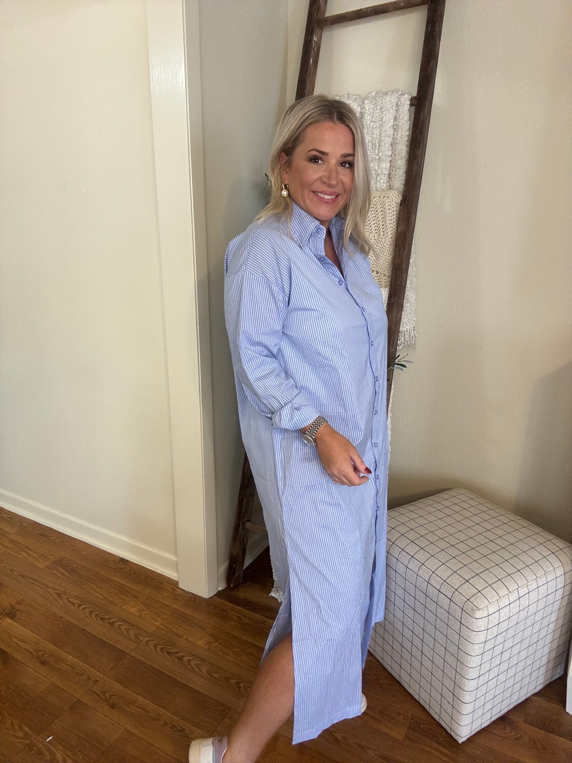 She is GOOD! Clean and crisp with a faint blue and black pinstripe, buttons down the front and side slits crest the perfect movement. Generous sizing!