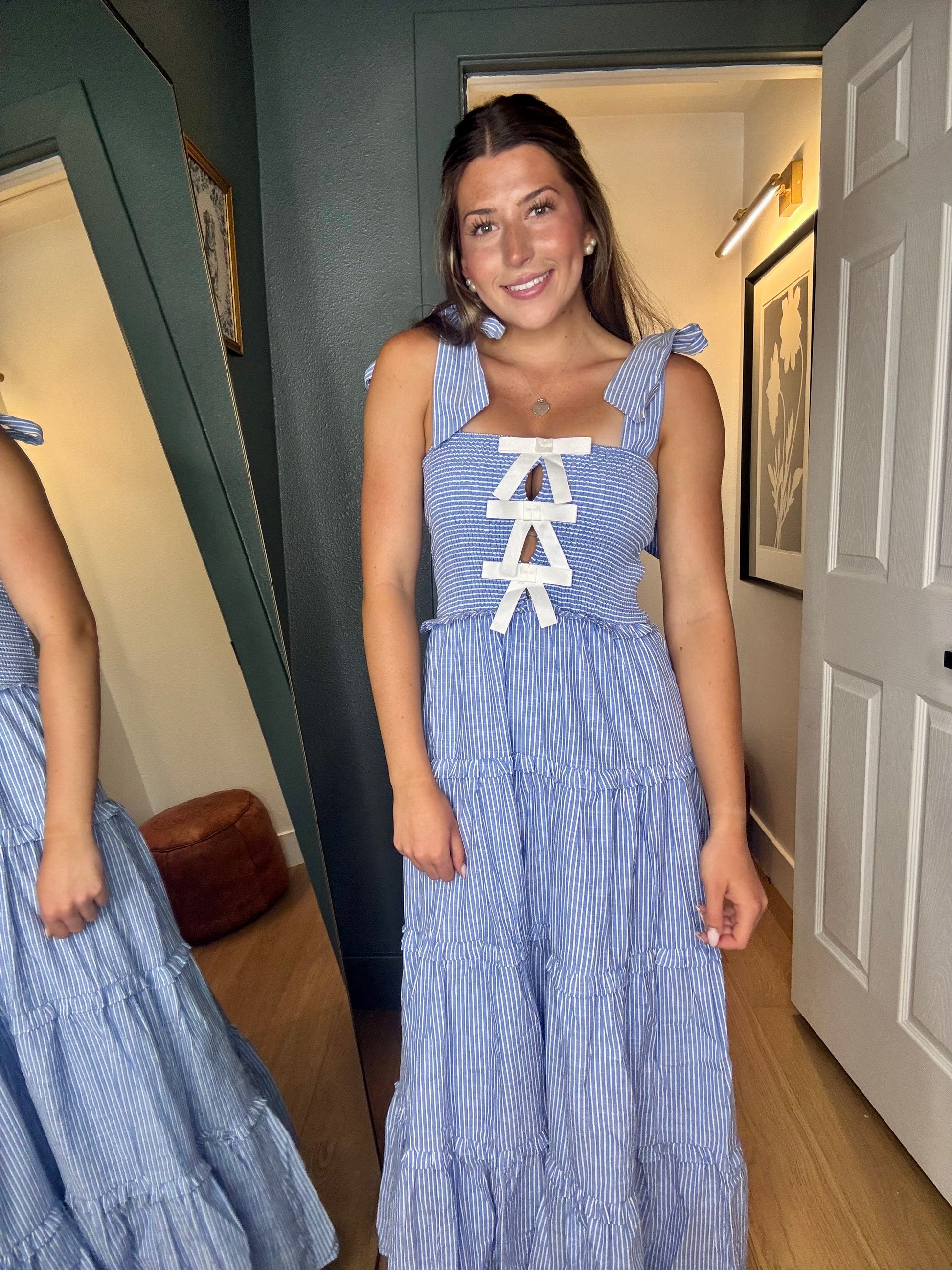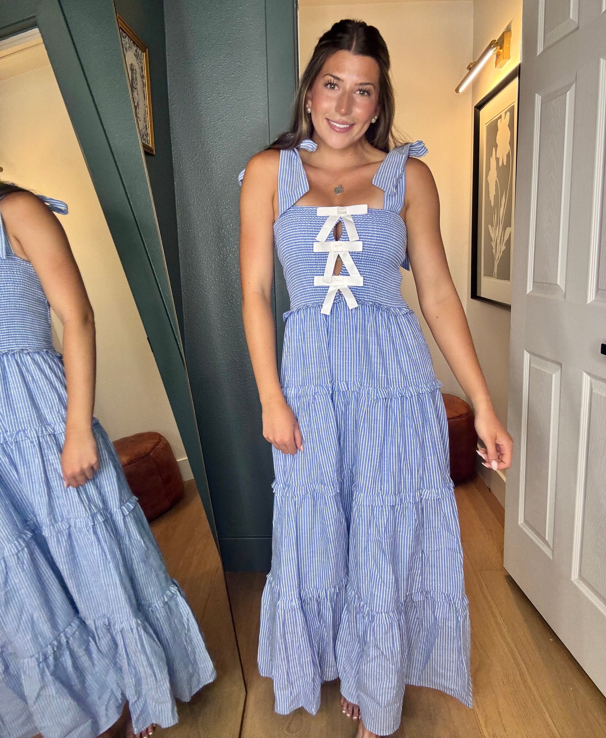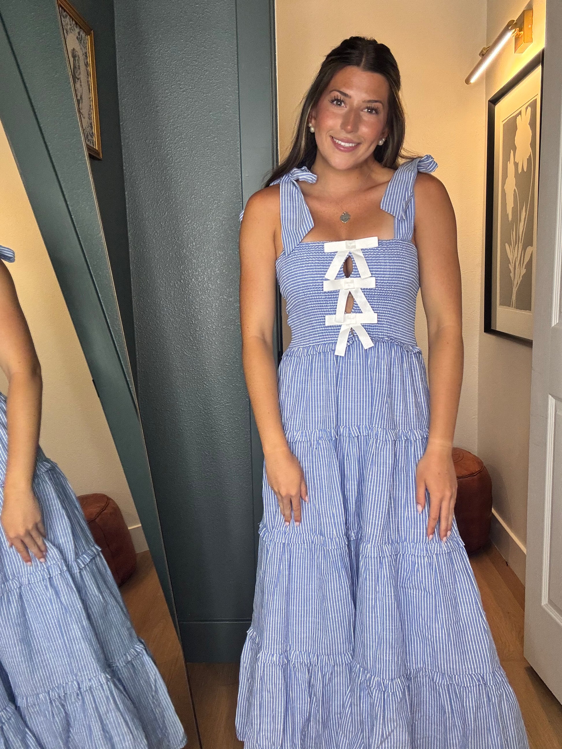 Striped Tiered Midi Dress -Rushed Midi Dress -Light and Airy Striped Fabric -Square Neckline -Tie Shoulder Straps -3 Bow Details -Ruffle Tiered Midi Skirt -Aline -Easy Pull on style