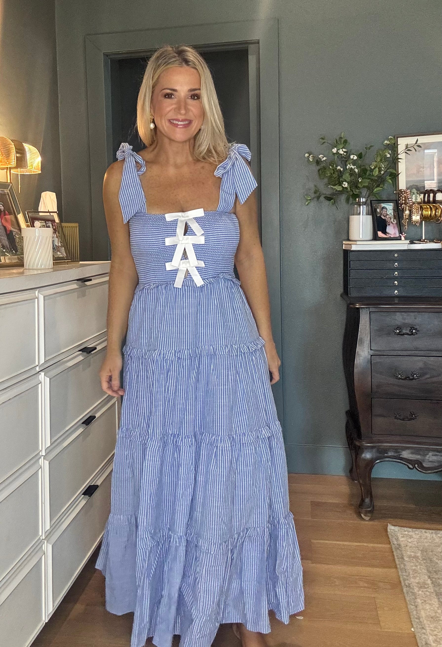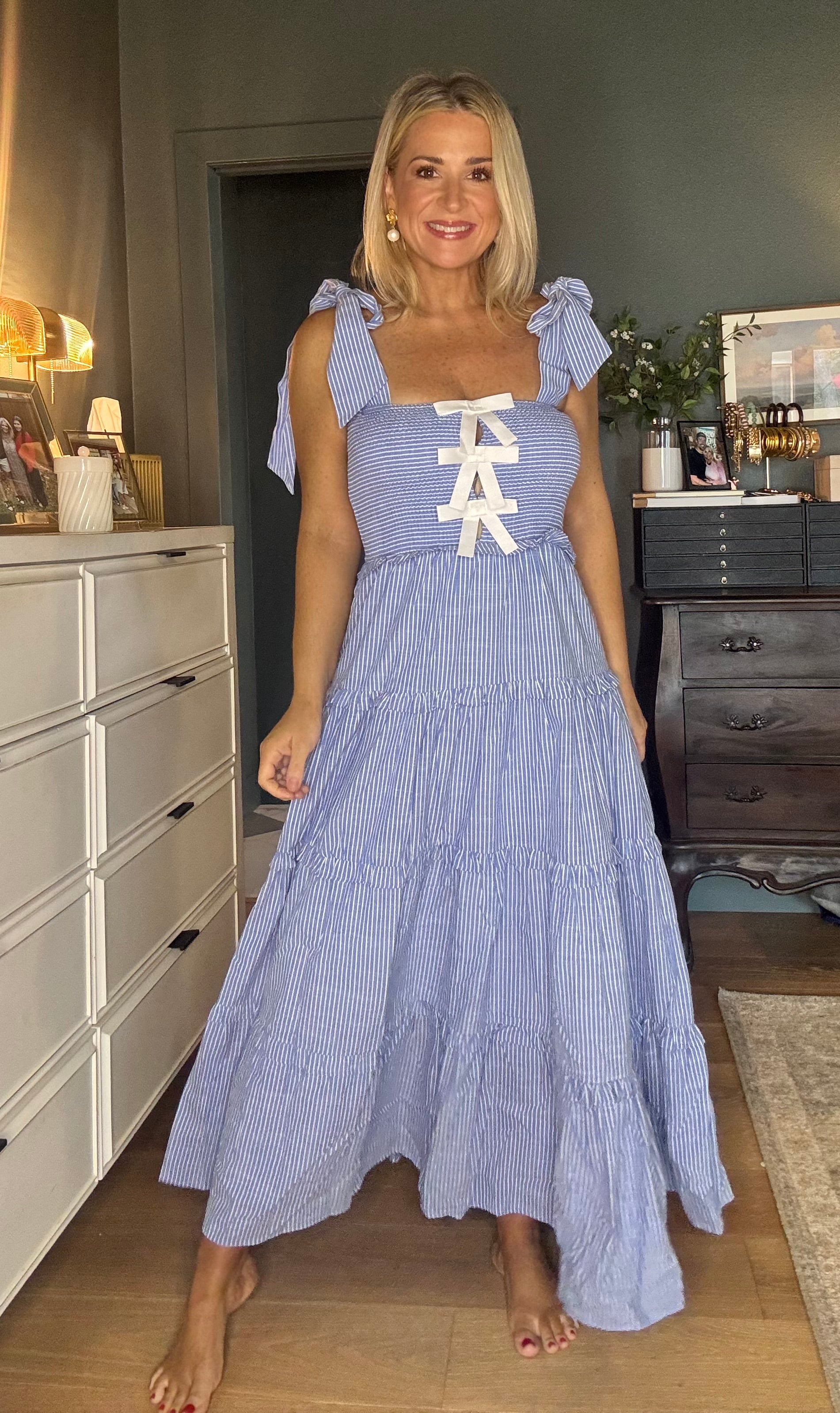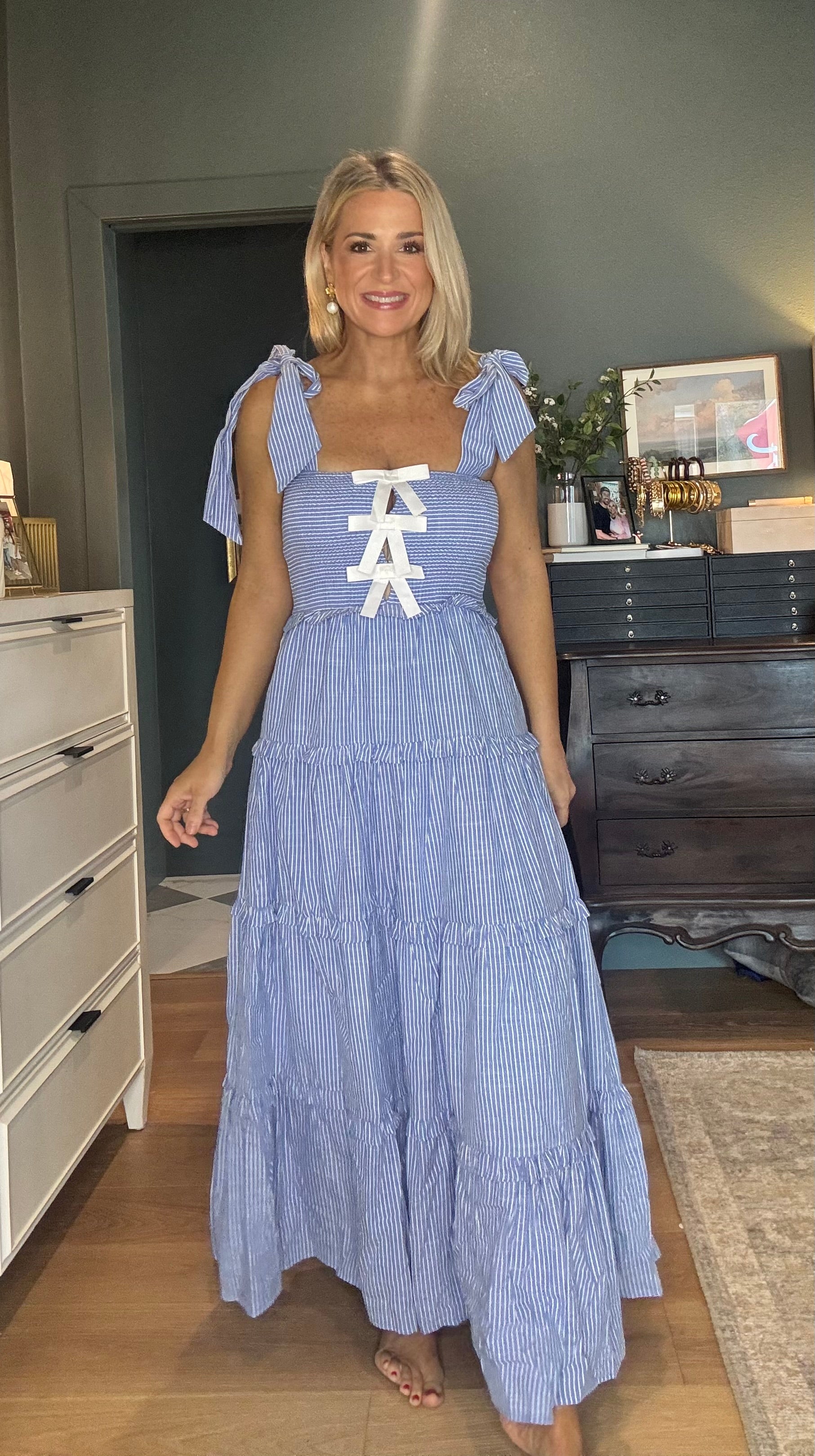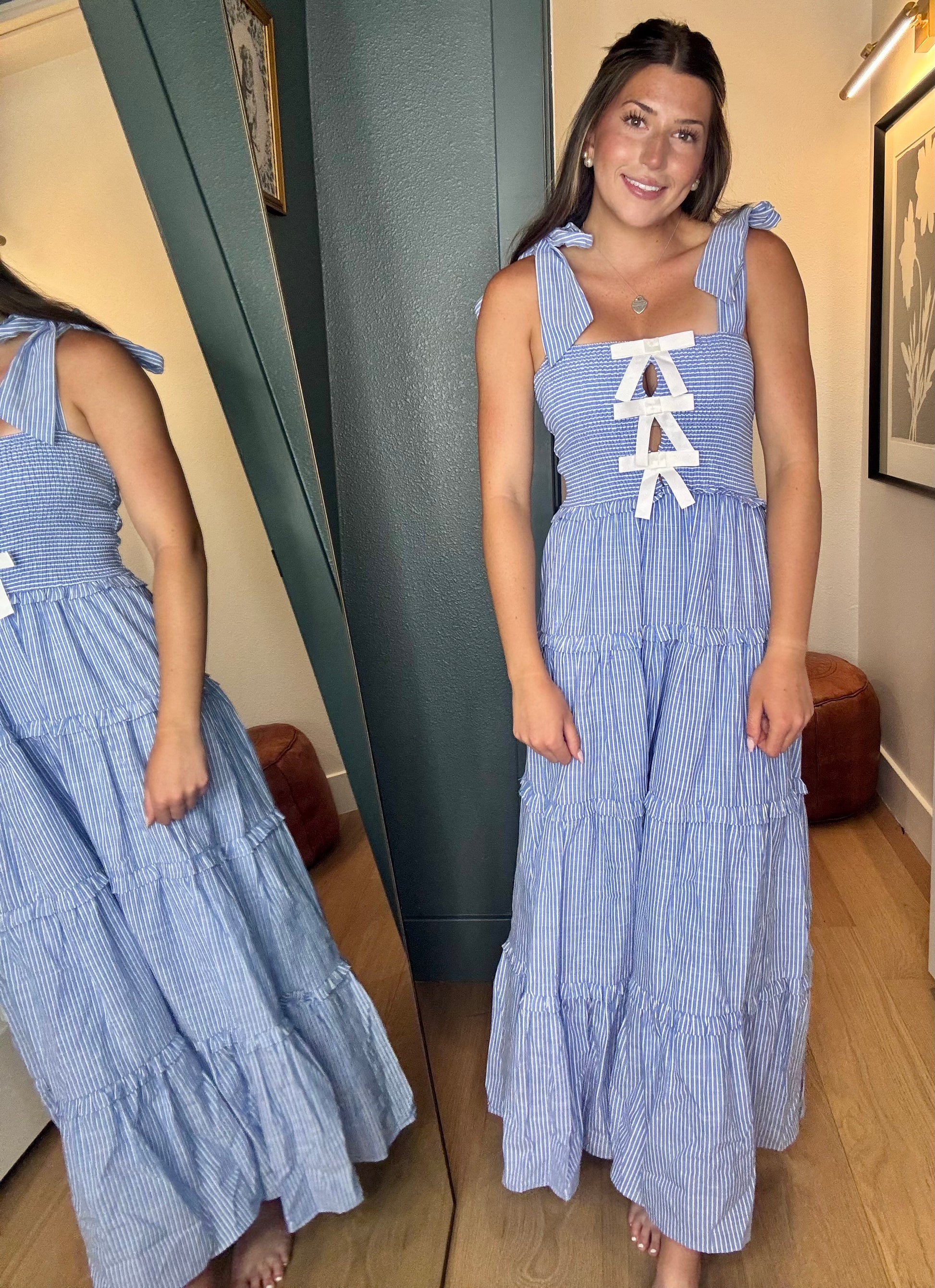 Striped Tiered Midi Dress -Rushed Midi Dress -Light and Airy Striped Fabric -Square Neckline -Tie Shoulder Straps -3 Bow Details -Ruffle Tiered Midi Skirt -Aline -Easy Pull on style