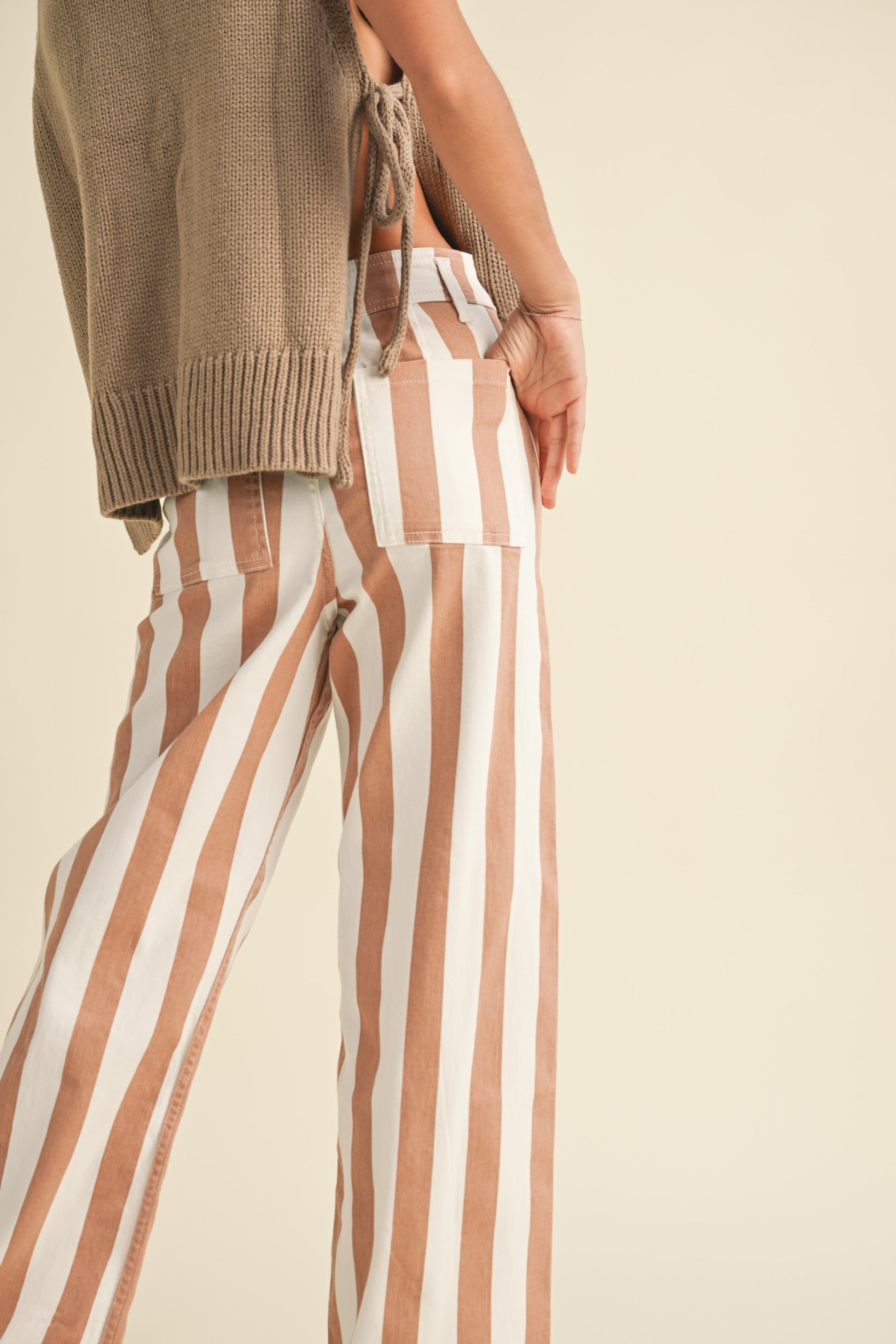 These stylish Toffee and Stripes stretch pants feature a unique combination of toffee and white stripes. Made with top quality stretch material, these pants offer comfort and flexibility while maintaining a sleek and chic look. Perfect for any occasion, these pants are a must-have for any fashion-forward individual.
