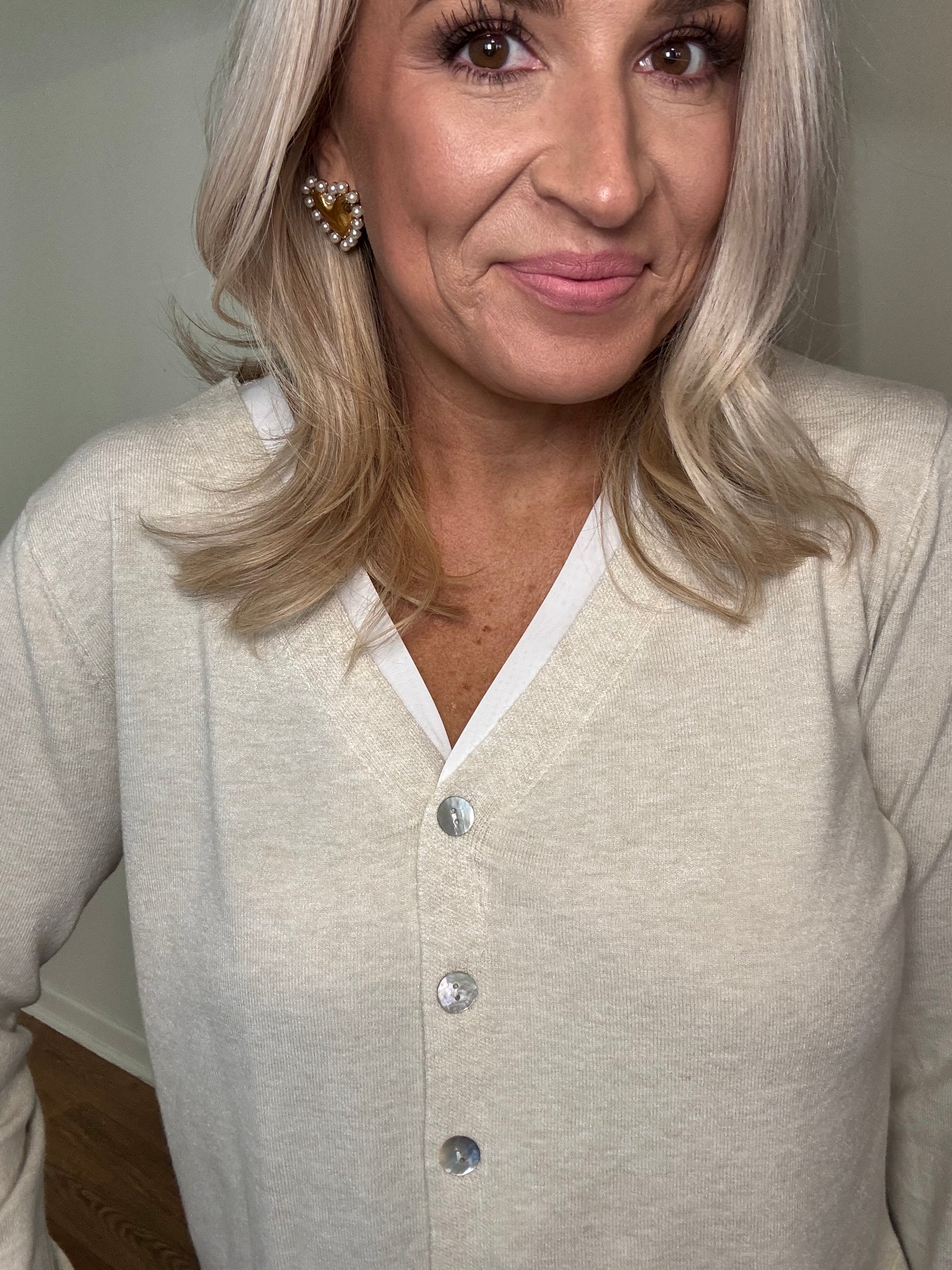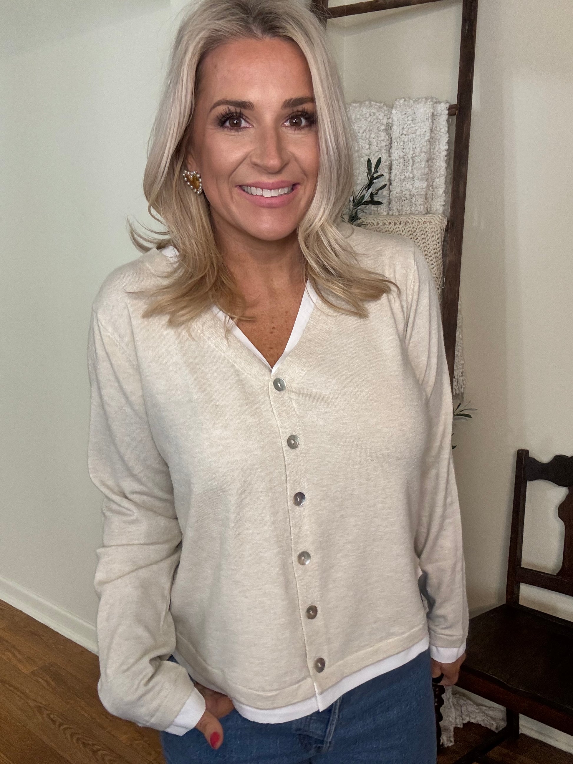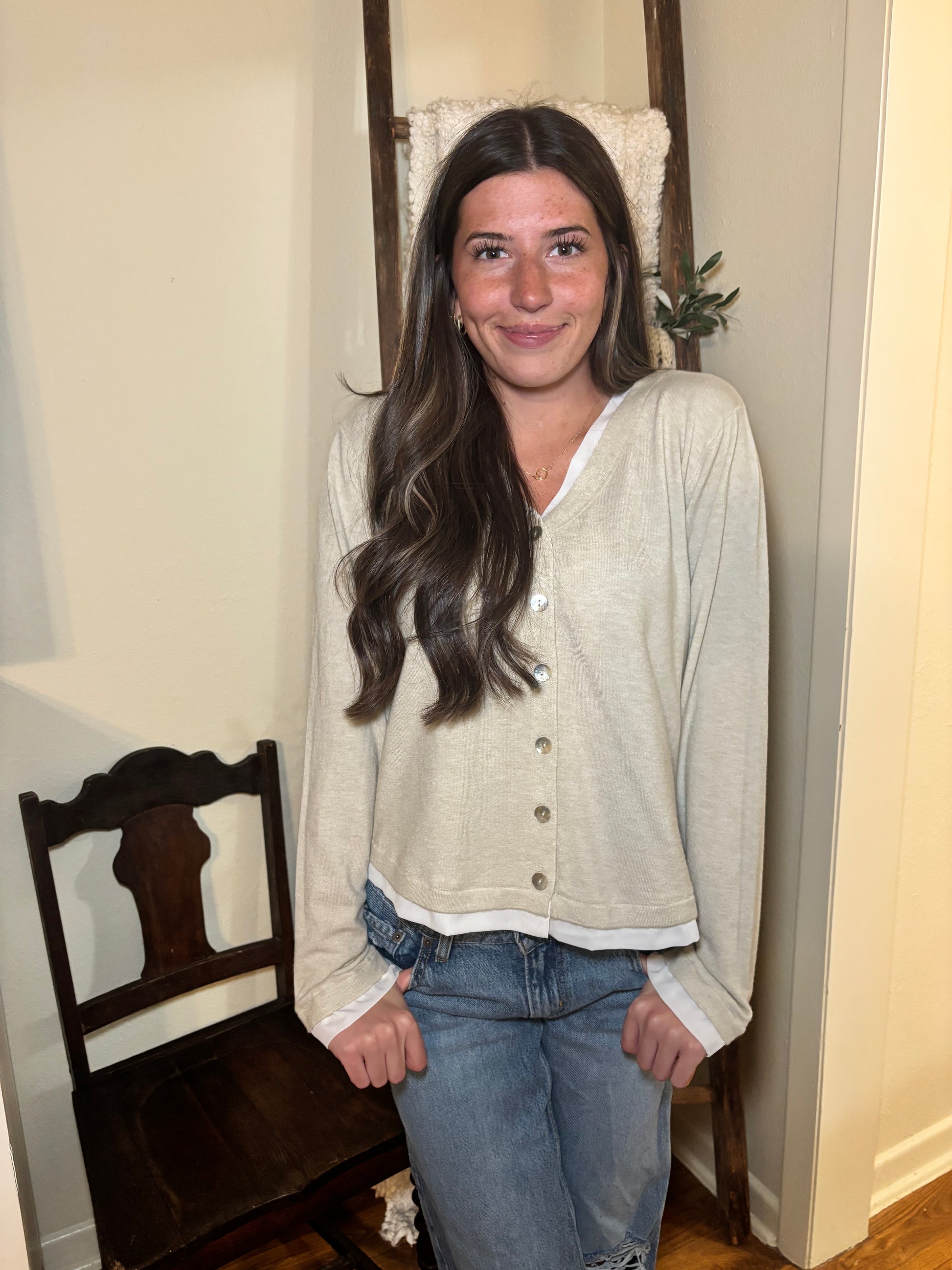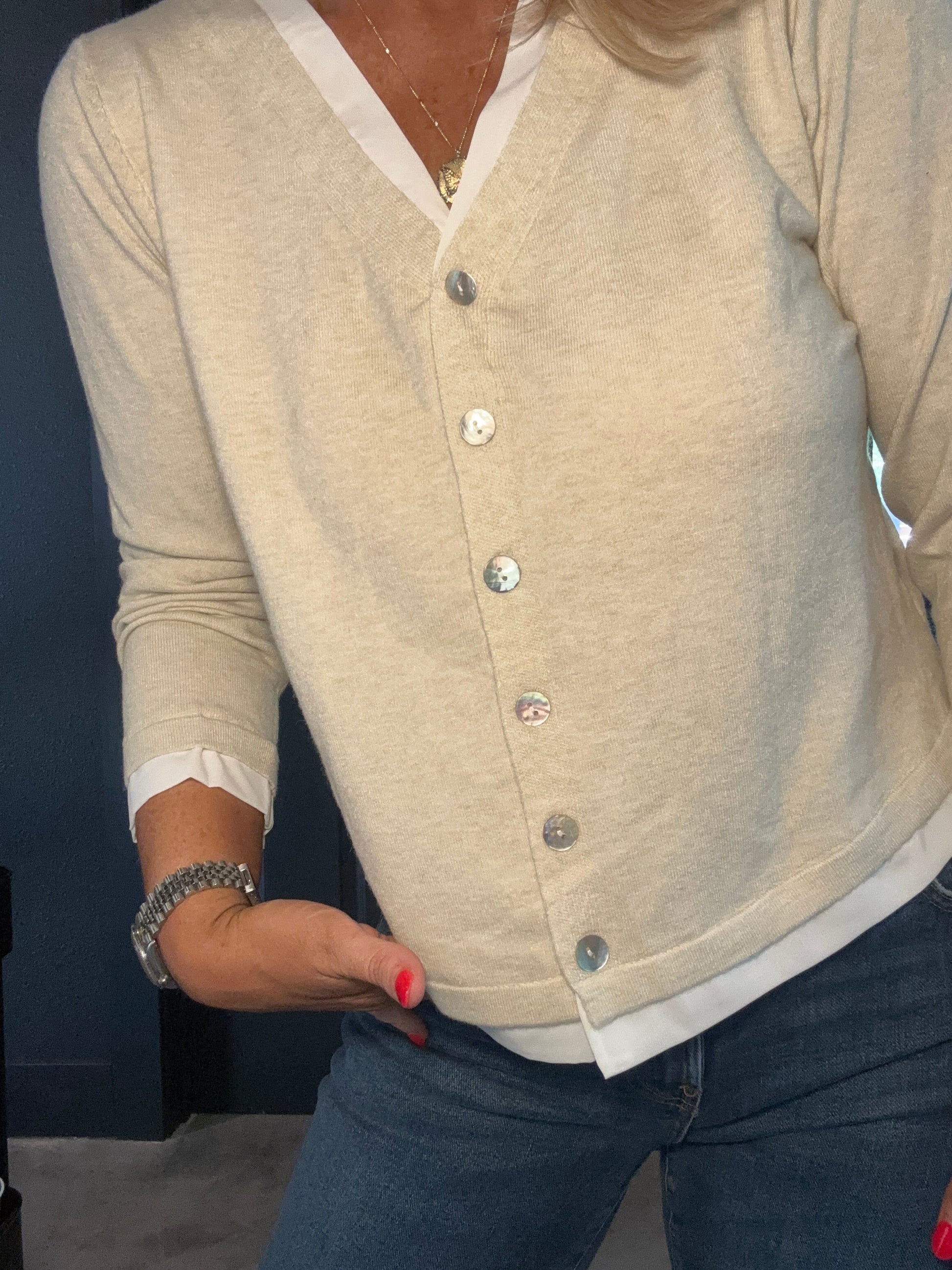 The Callie is a beautiful and chic tan knit sweater & woven combo faux button down for an effortless layered look.