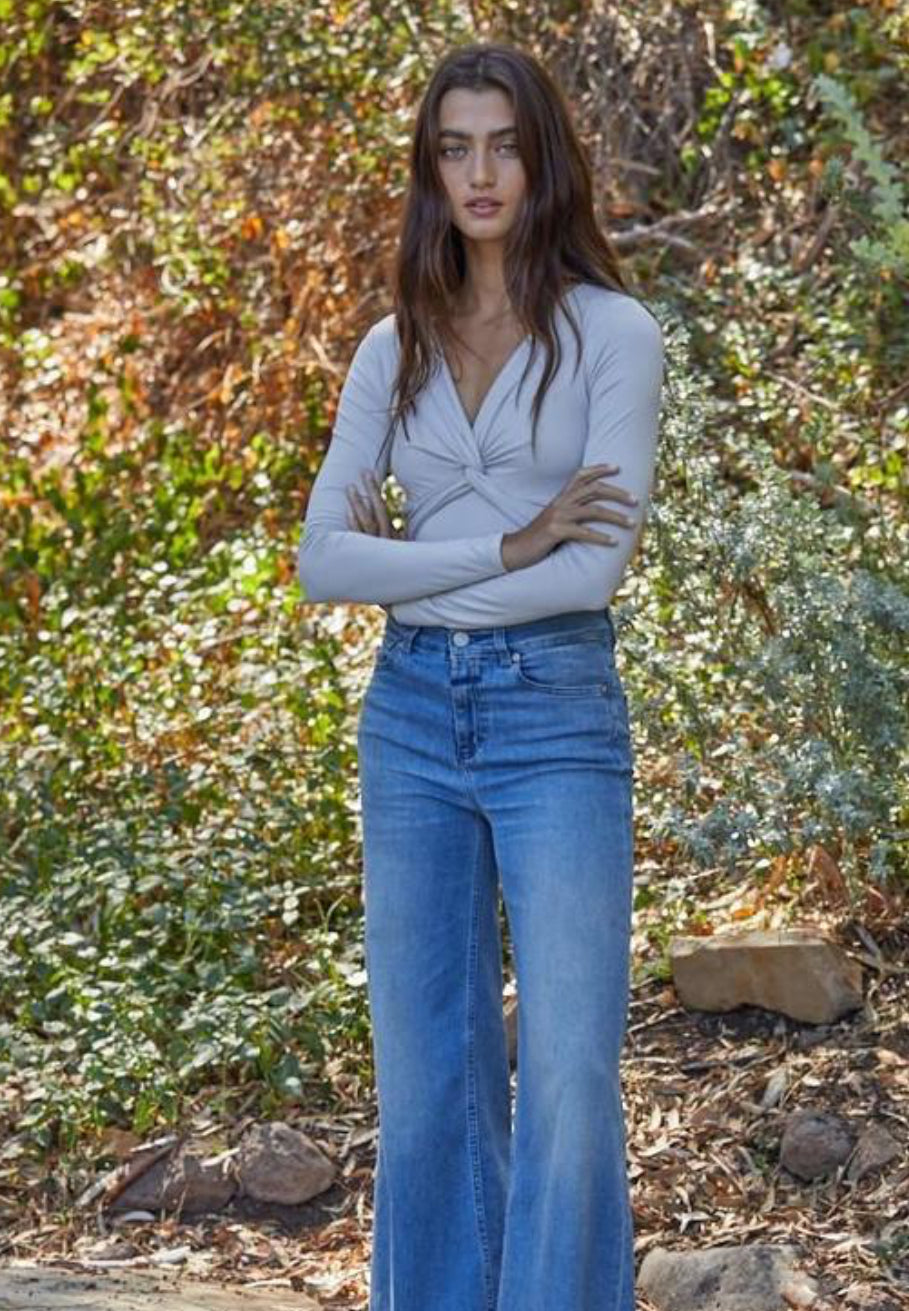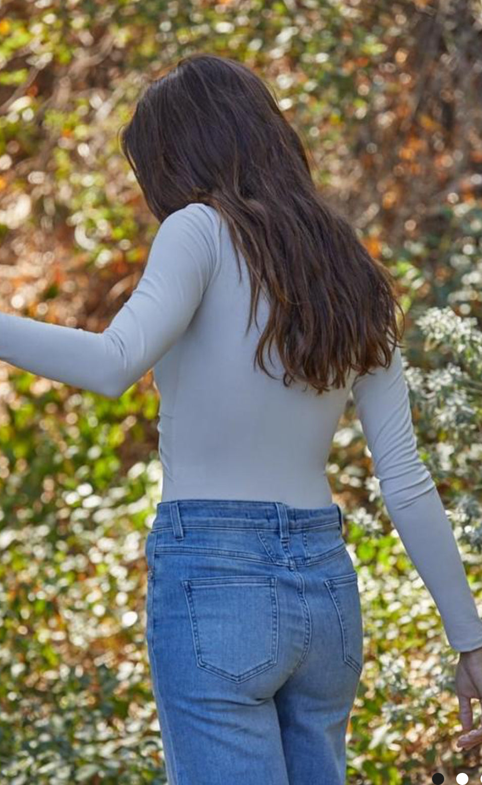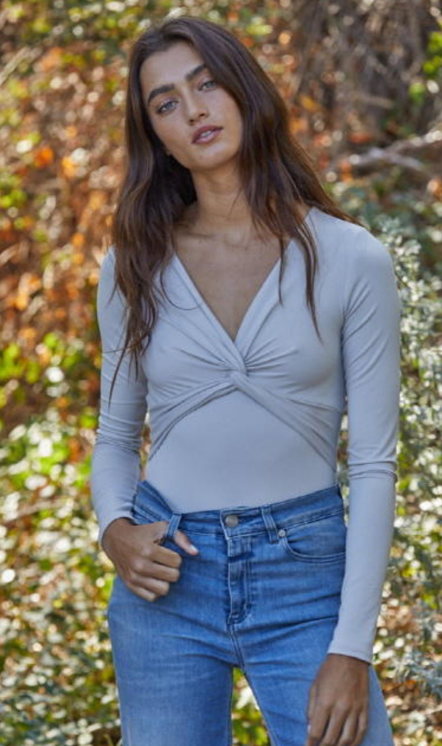 With a Twist Top is a beautiful fog color, plunged v-neck jersey bodysuit and extremely flattering.